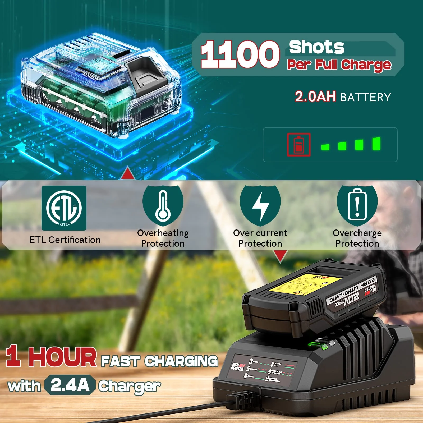 • Battery is compatible with all NEU MASTER 20V cordless tool
