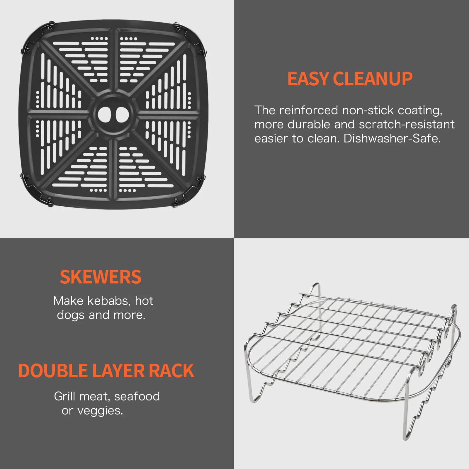 - Easy Cleanup and Maintenance: Cleaning up after cooking is a breeze with this air fryer. The high-performance non-stick coating on the cooking basket and accessories prevents food from sticking, making them easy to clean. Additionally, the removable parts, including the stainless steel double-layer rack and skewers, are dishwasher-safe, saving you time and effort. Enjoy the convenience of quick and effortless cleanup after enjoying your delicious meals.