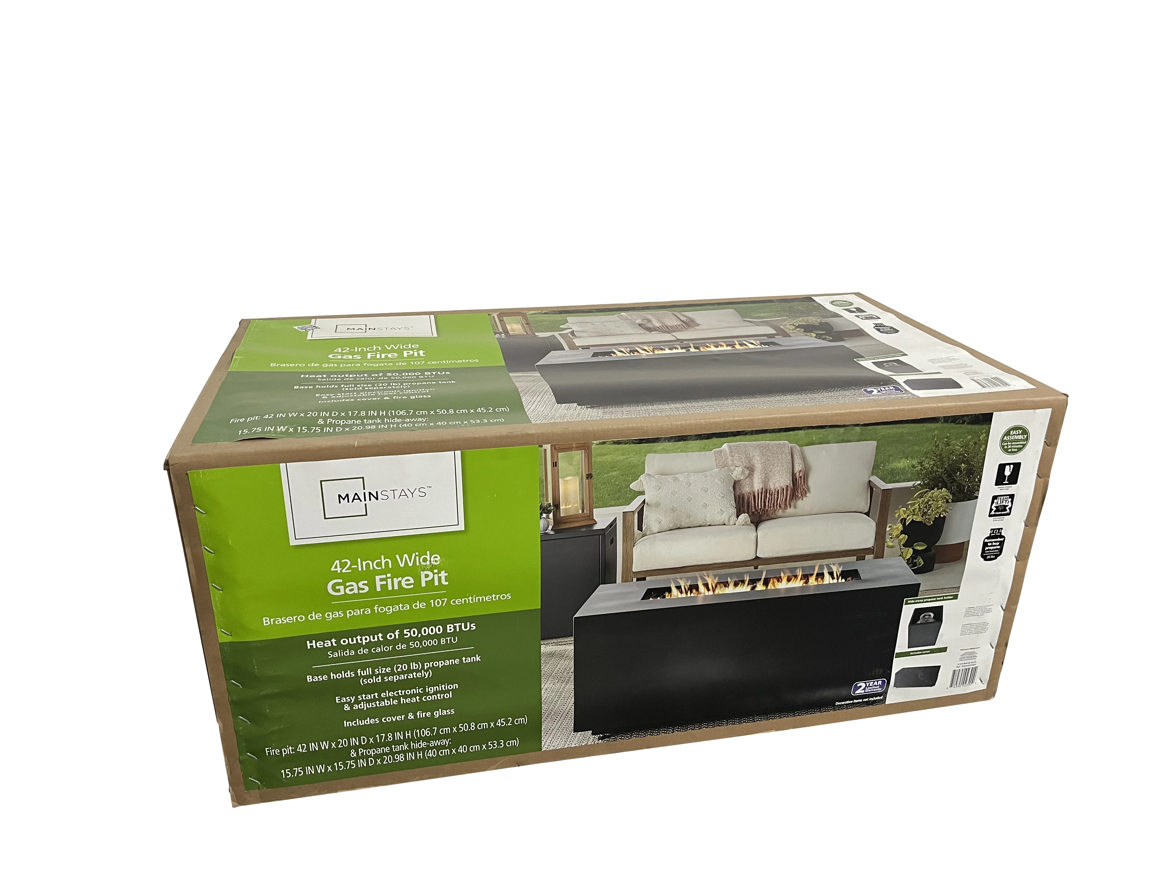 • Mainstays 42" Rectangle Black Finish Modern Steel Fire Pit: 42" x 20" 50000 BTU Propane Fire Pit Table with Lid, Tank Hideaway and Cover
