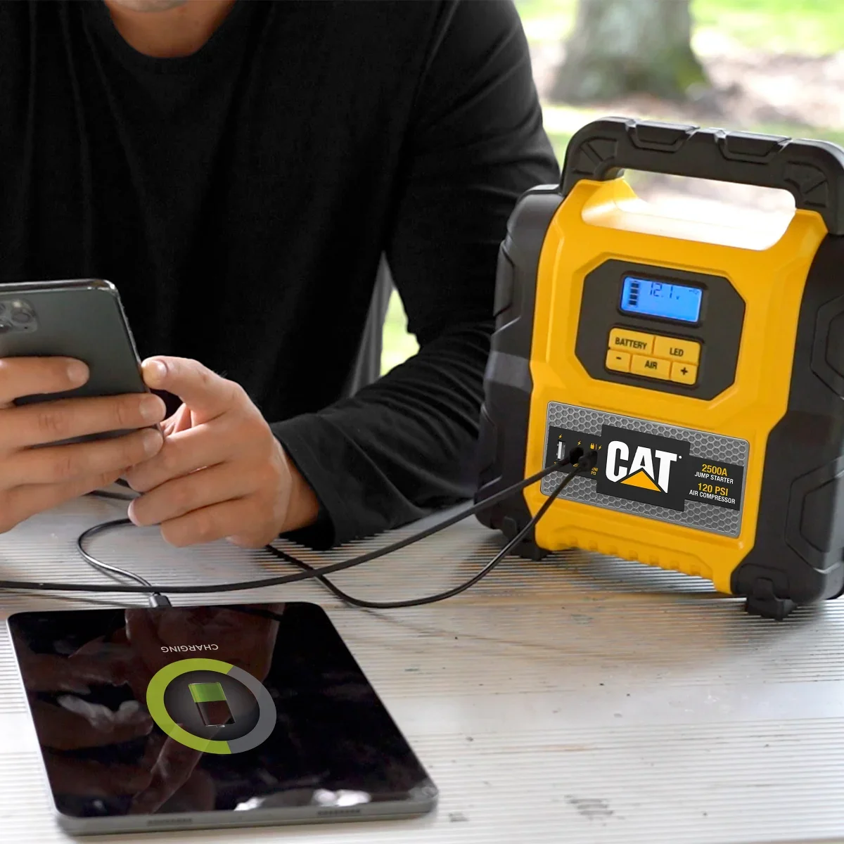 - ?Features:2500 Peak Amp Jump Starter120 PSI Digital Air Compressor with AUTOSTOP?Dual USB-C PD 60W PortUSB-A 15W PortBright LED Work Light