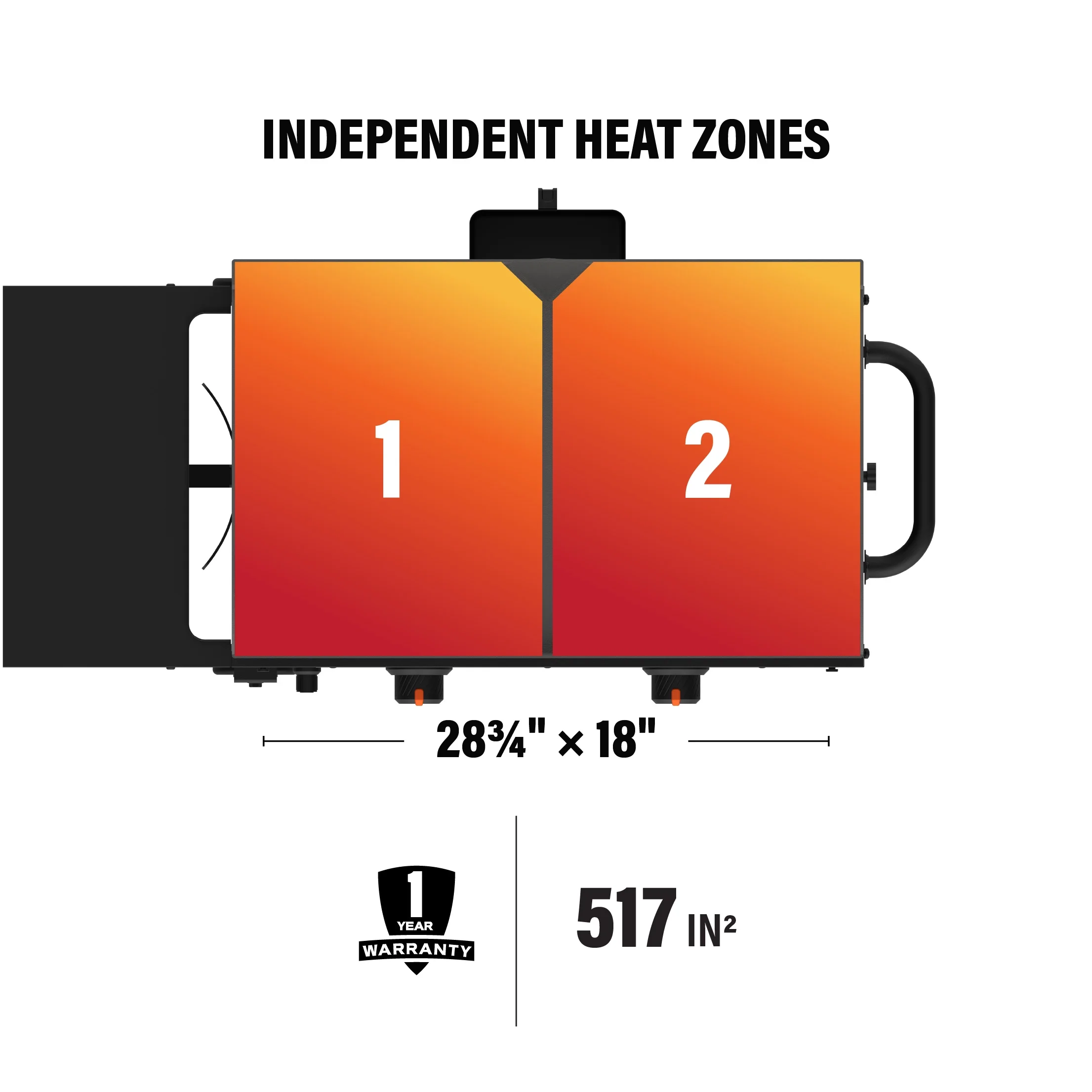 - 517 sq inches of cooking space and two independently controlled heat zones