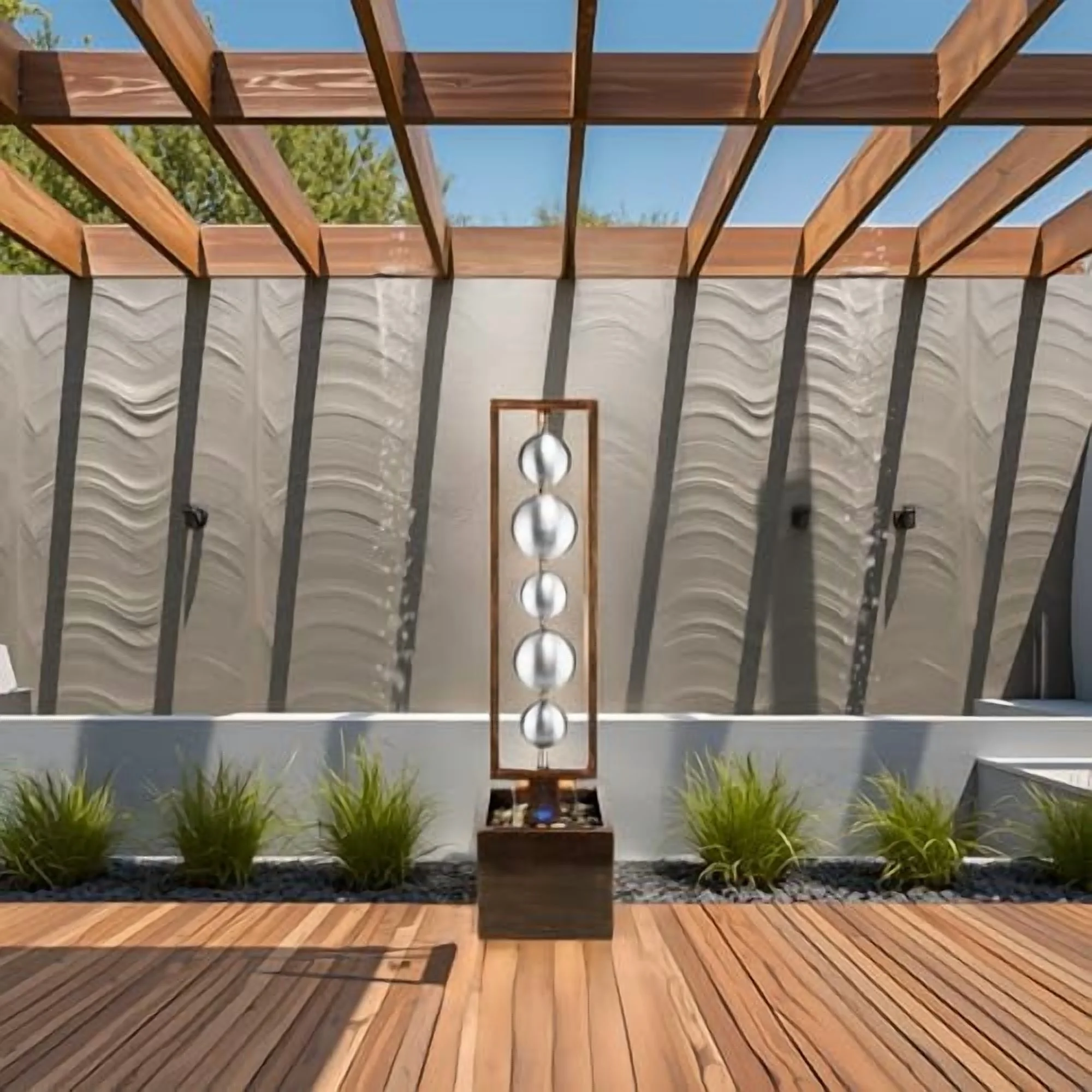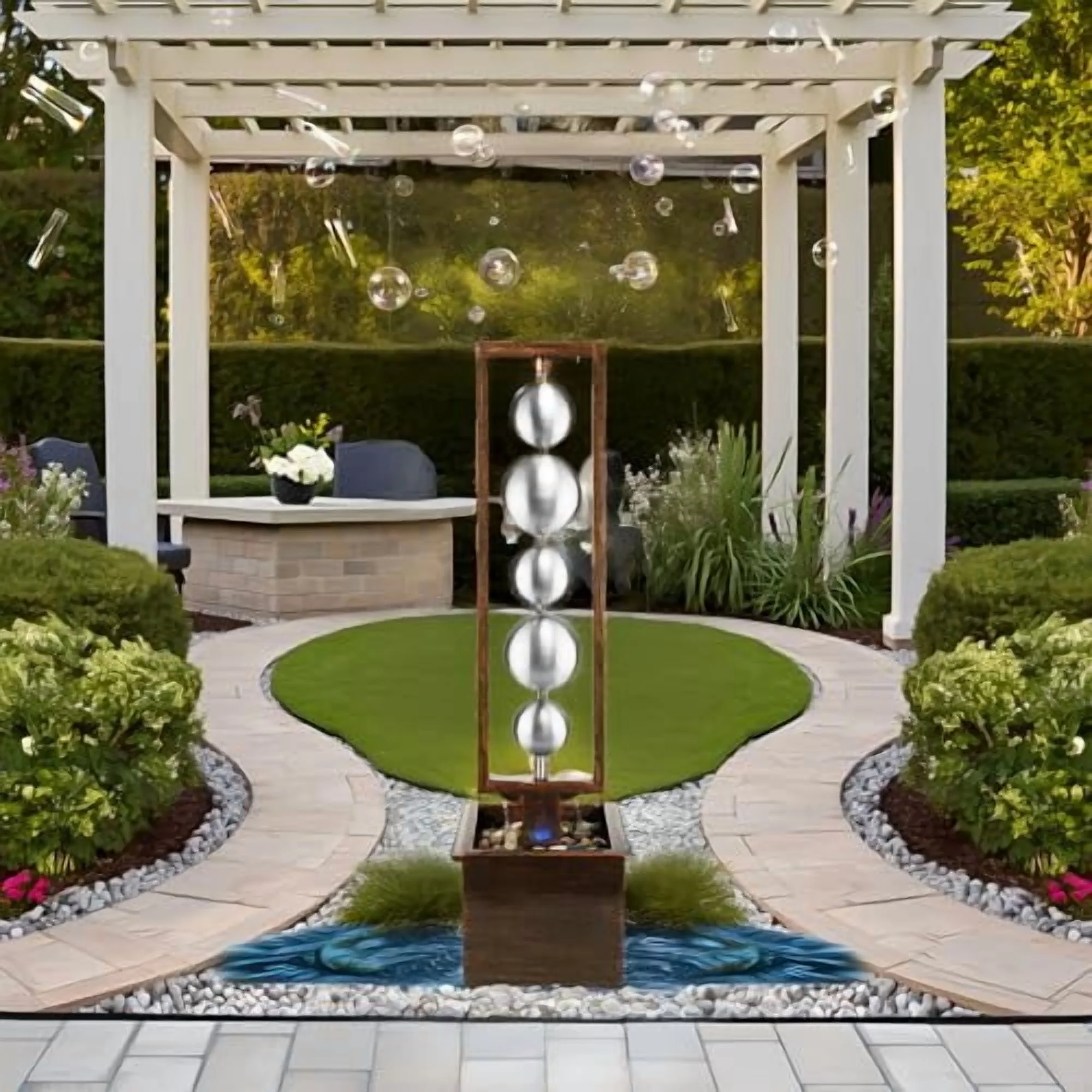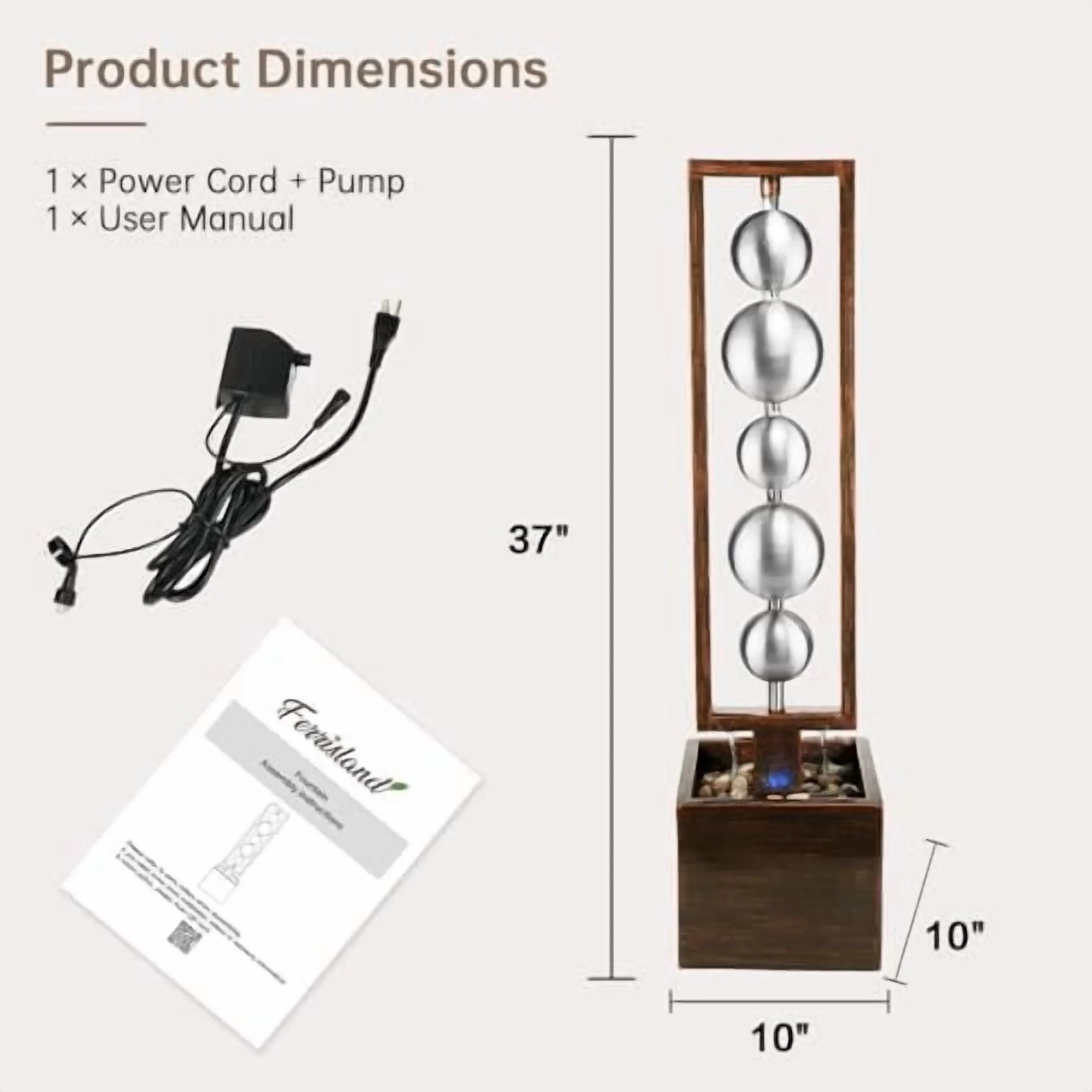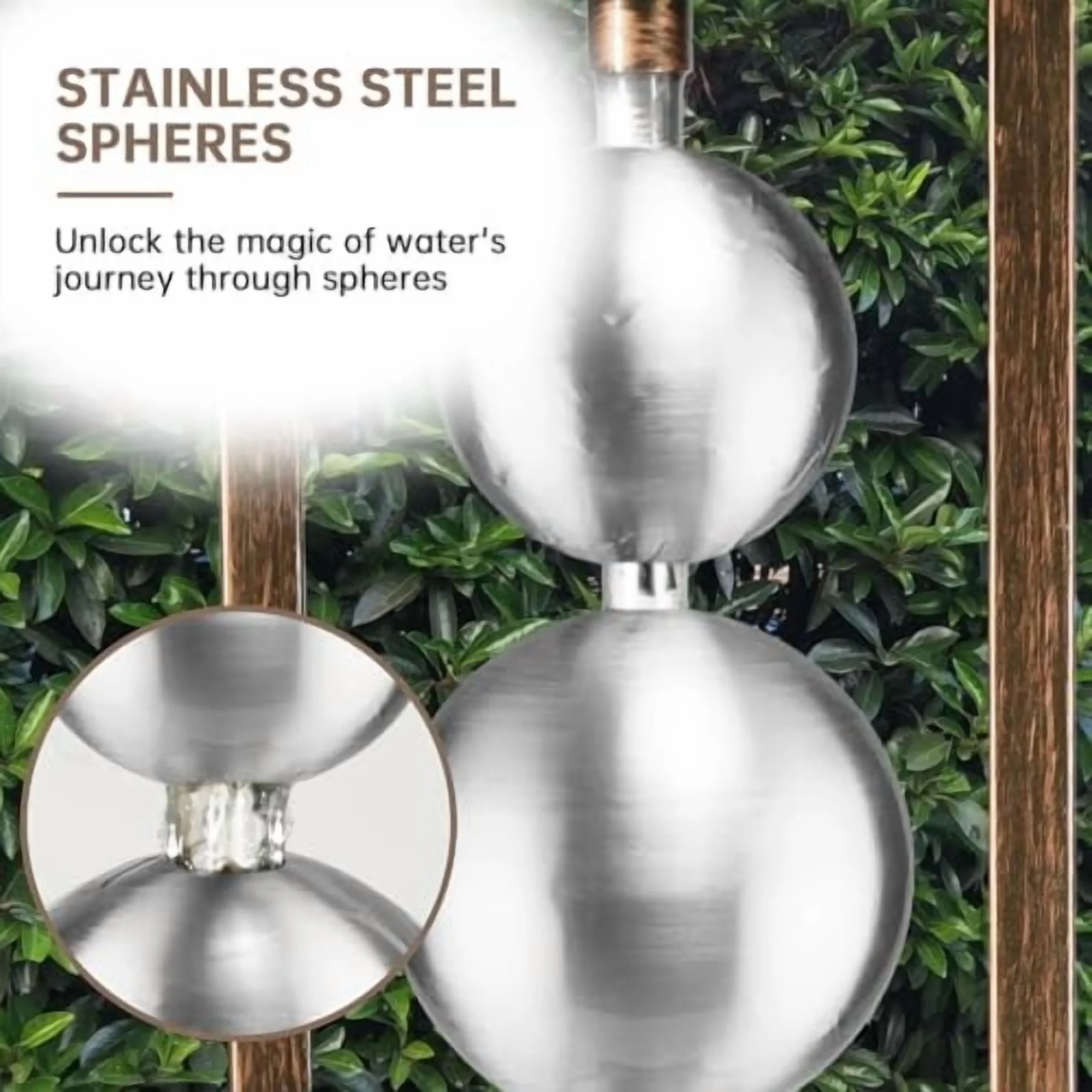 • UNIQUE WATER FEATURE: 5 elegantly stacked stainless steel spheres of varying sizes create a captivating visual display. Water gently cascades over their smooth surfaces, producing a soft tinkling sound, and splashes onto the resin base of the fountain
