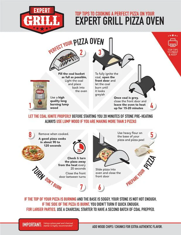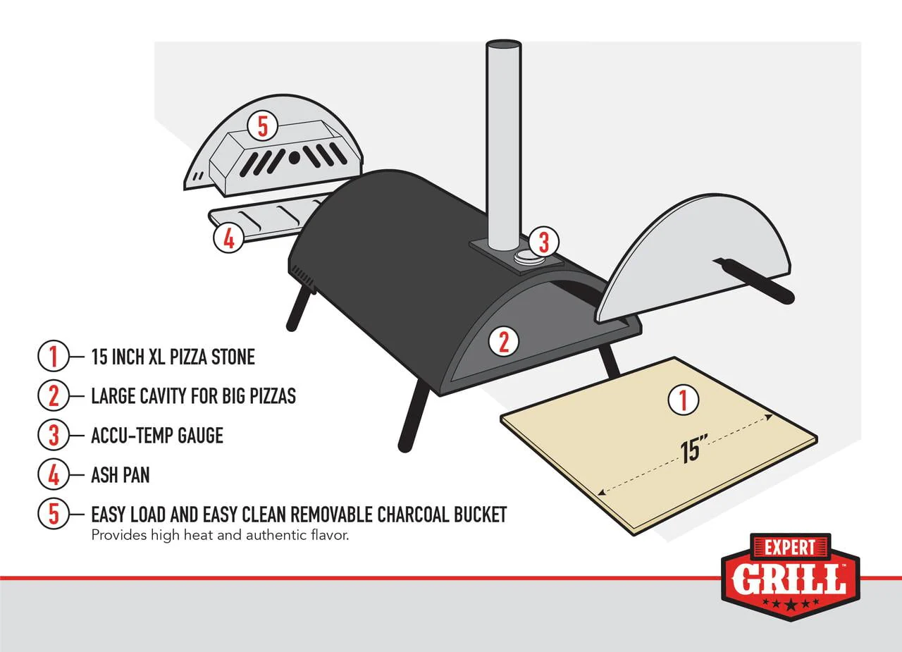 Expert Grill Large Charcoal Pizza Oven. This tabletop pizza oven achieves temperatures in excess 800F° for a 90 second artisan pizza. The 15" pizza stone holds small and large pizzas. Add a cast iron skillet and sear a perfect steak, burgers, chicken, or your favorite meal. Charcoal powers this unit for super high heat and authentic wood fired flavor. This unit is a wonderful addition to your alfresco dining experience. Entertain family, friends and neighbors with this amazing outdoor oven and host an unforgettable pizza party in your yard. Make a store-bought frozen pizza taste like a gourmet pizza or create your own masterpiece with fresh pizza dough and ingredients. The versatility of the Expert Grill Large Tabletop pizza oven will provide you and your family with years of fun cooking, comradery, and enjoyment. Bring Italy to your backyard and be the Expert at your next event.