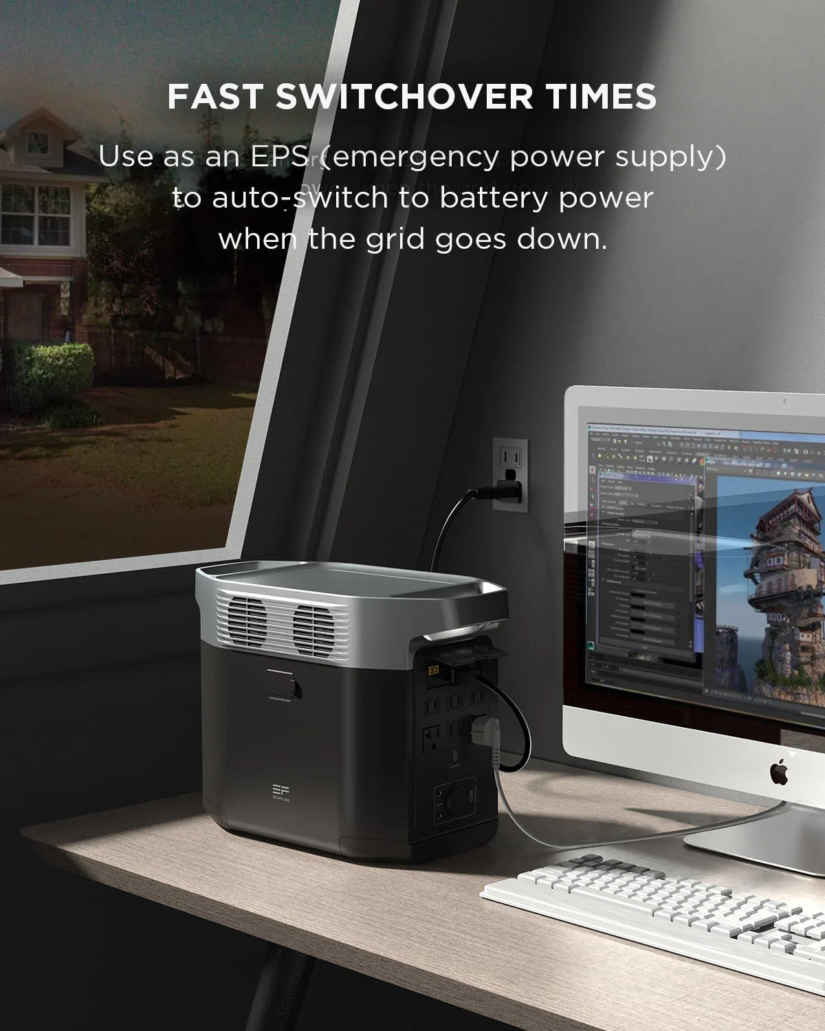 EcoFlow DELTA 2 is a must-have for any home that puts power security & comfort first. Ensure you're prepared with the power station made for almost any situation your family could find themselves in. All while staying green.With a capacity of 1kWh to start with, you've got enough energy for your essentials for hours on end. Need even more? Add on the DELTA 2 extra battery to reach 2048Wh, or add on the DELTA Max Extra Battery to hit 3040Wh. Great for home backup or everyday appliances.Power pretty much anything.