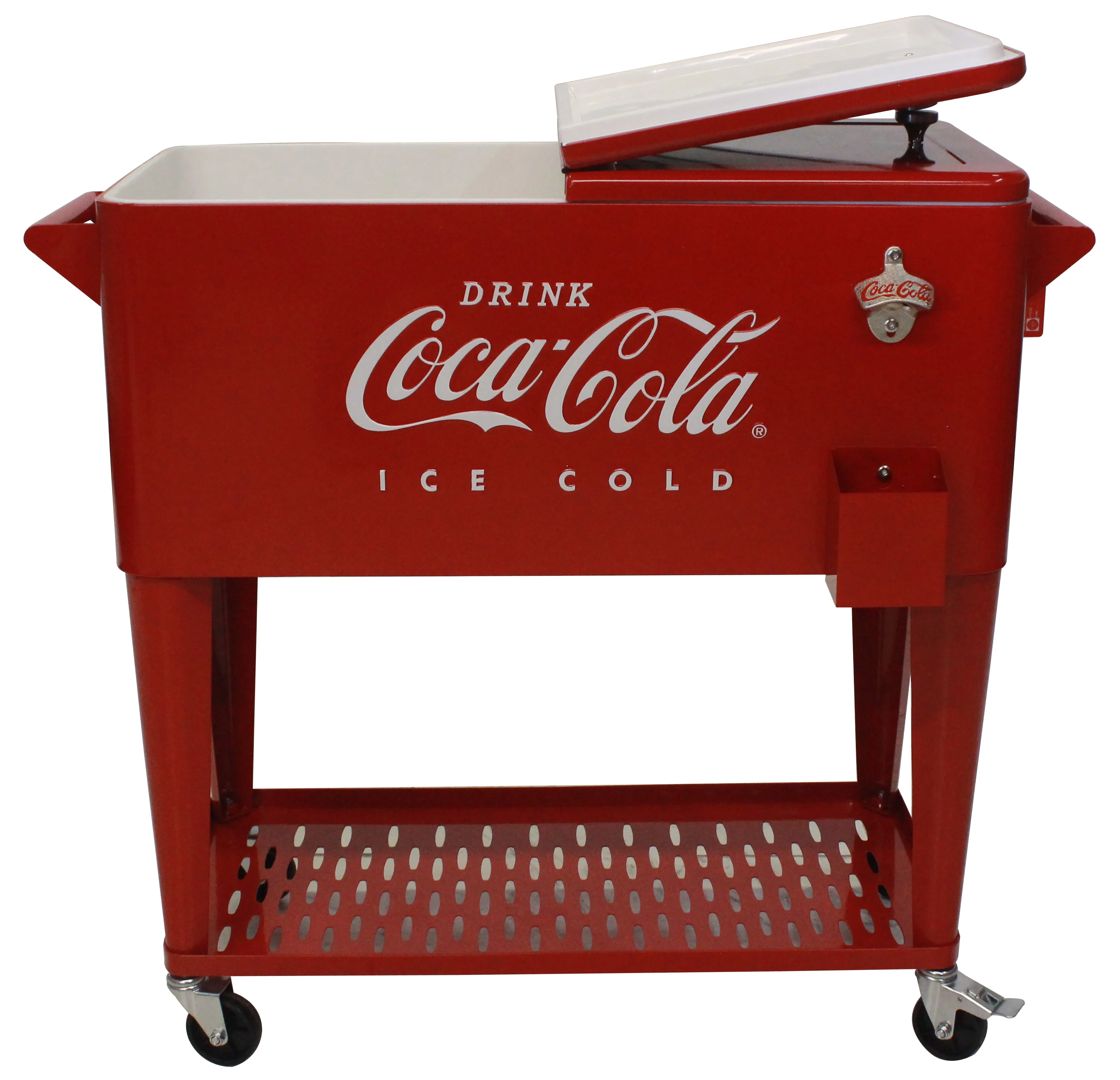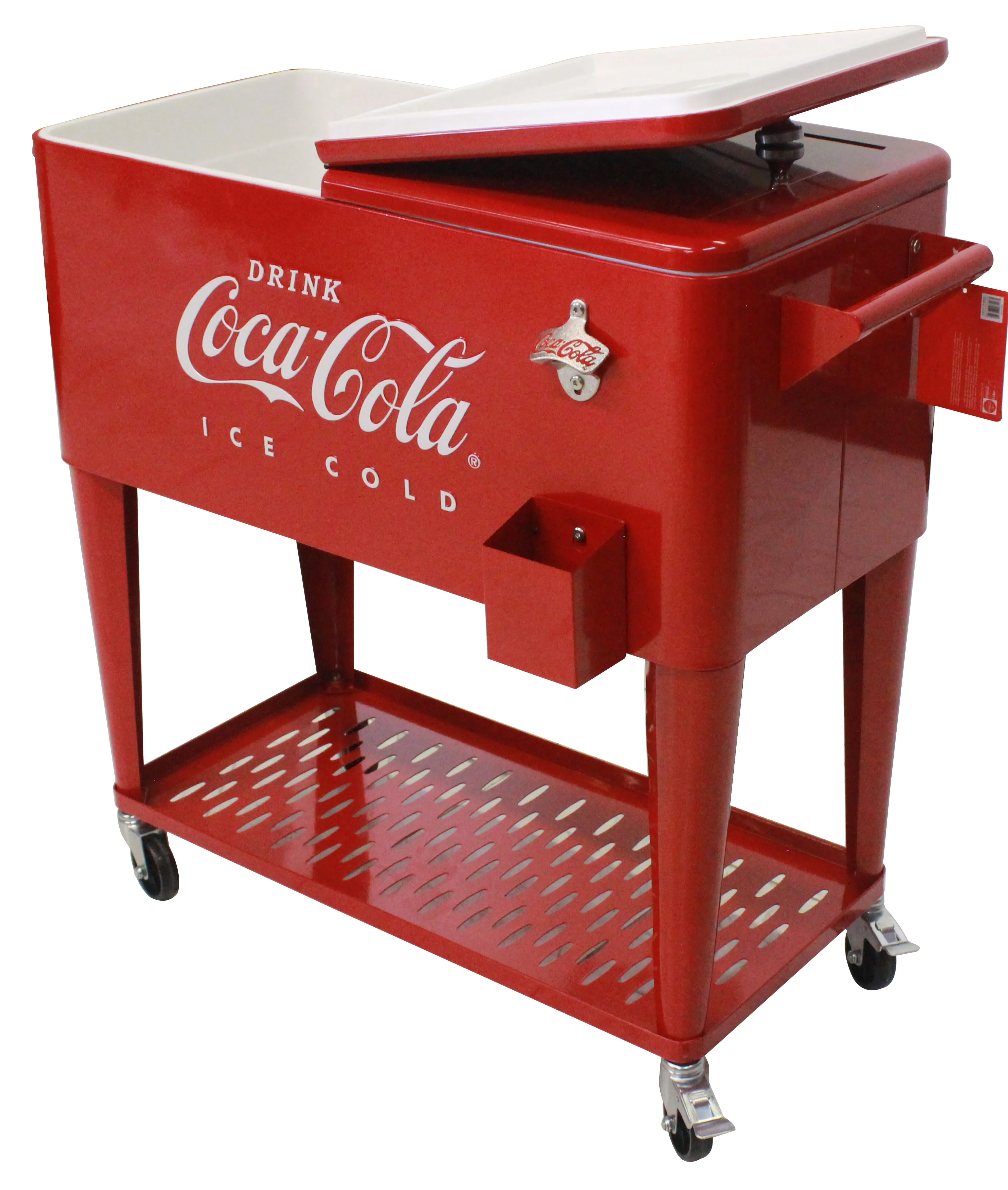 Get the party rolling with our Leigh Country CP 98126 Metal 80 Qt. Coca-Cola Outdoor Patio Cooler with Tray in red. This officially licensed Coca-Cola® cooler is a decorative solution for storing the drinks you plan to serve for your festivities. The removable double lid allows you to fill it with ice and beverages. Additionally, the interior compartment of this cooler has ample volume, and can hold up to 100 cans. Featuring a design inspired by the iconic Coca-Cola logo, this whimsical icebox is a union of classic charm and modern-day function. If you are serving brews in old-fashioned bottles, it comes with a built-in bottle opener and cap catcher. For an added touch of convenience, the red bar offers a place for you to hang a towel. This retro cooler has four casters for easy transport, and two of them can lock so the cooler stays in place when unattended. The netted tray helps with storing a variety of items. You can easily drain the melted ice after the party's over by pulling out the included plug.