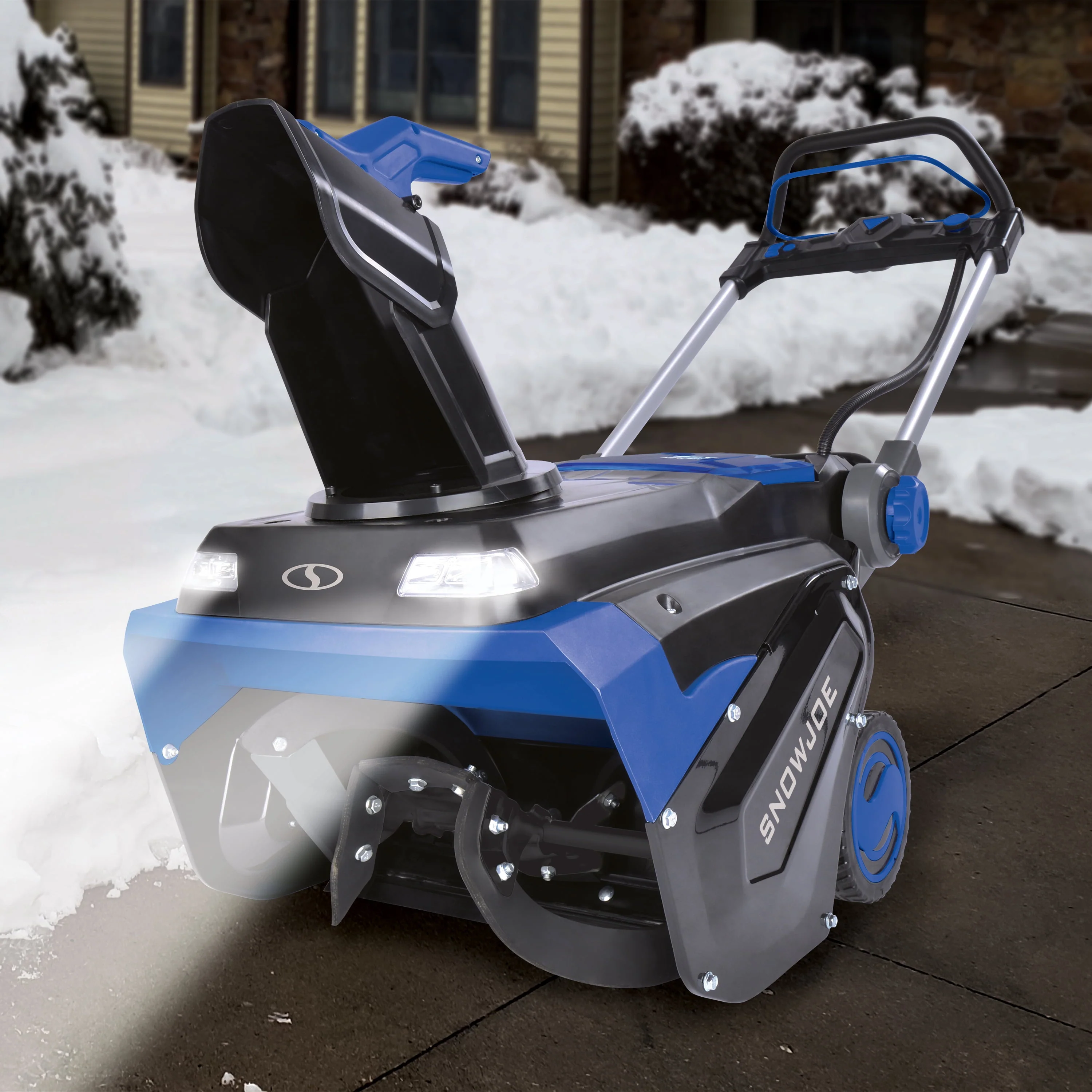 WAGE WAR ON WINTER. The latest revolution in snow-clearing technology meets the 24V IONMAX Battery System with the 21-inch 96V Max Cordless Walk-Behind Snow Blower from SNOW JOE®. Driven by Snow Joe's exclusive 24-Volt battery series, SNOW JOE features four high-capacity 24-volt, 12.0 Ah lithium-ion batteries that deliver up to 96 volts of max power + performance, with zero carbon emissions for cleaner air. Ideal for mid-to-large-sized driveways and walkways, SNOW JOE boasts a powerful 2800-watt brushless motor and 2-blade, temp-resistant auger that quickly clears a 21-inch wide by 12-inch deep path in a single pass. Put the powder precisely where you want it – the adjustable chute control rotates 180º to throw snow up to 30 feet away in any direction! Plus, the integrated scraper bar at the base of the unit clears right to the ground without damaging your deck, driveway or pavement. After dark, the two integrated, 3-watt LED lights brighten the way for safer nighttime clearing. And when the work is done, the two high-speed, dual-port chargers can recharge in as fast as 6 hours so you're ready to tackle even more snow!