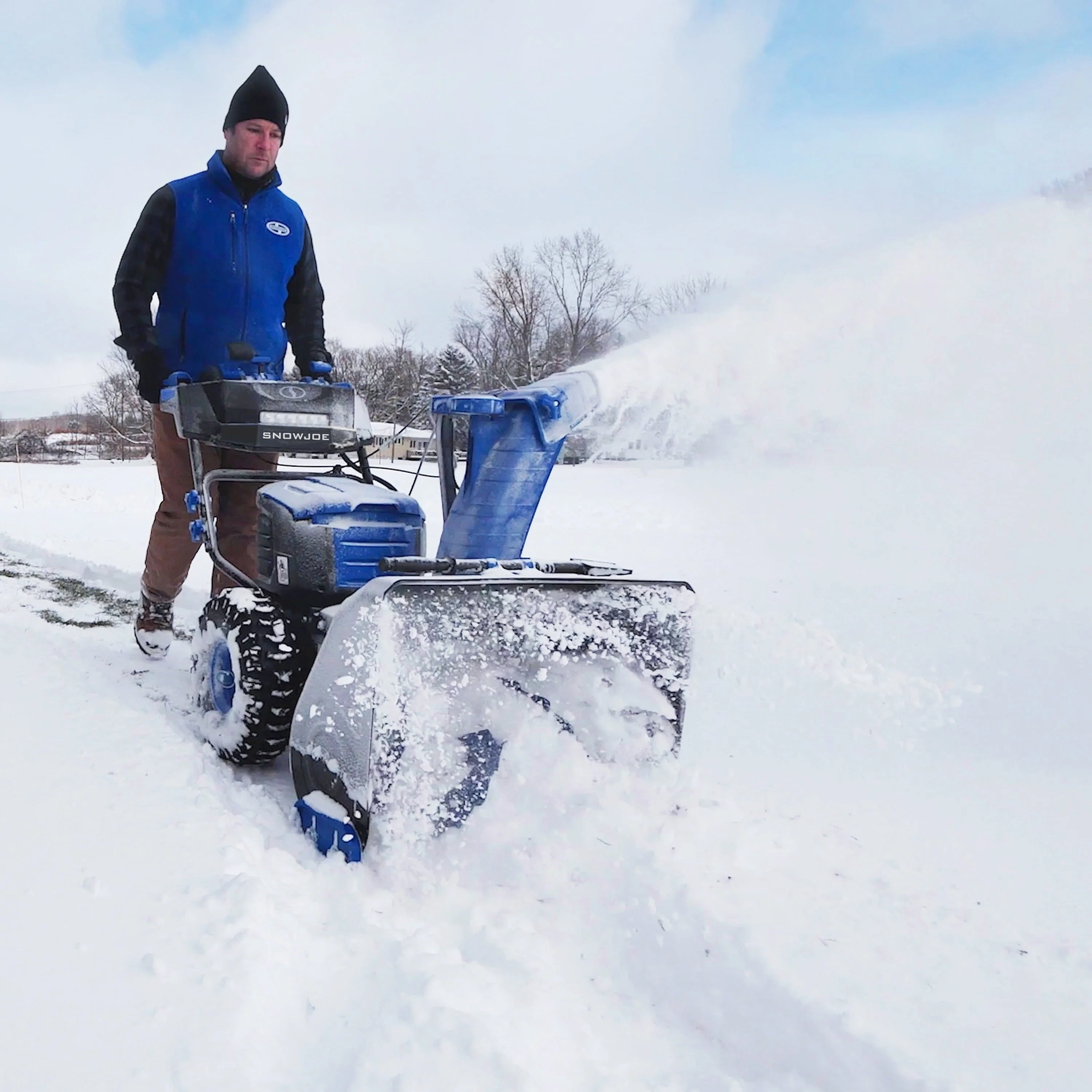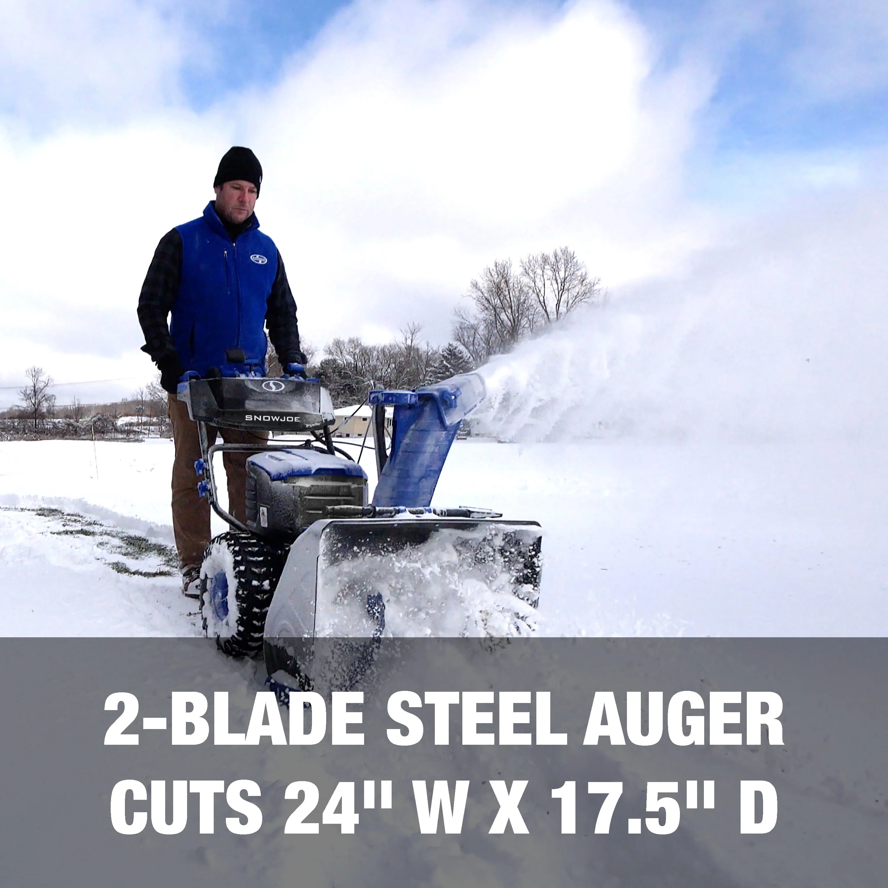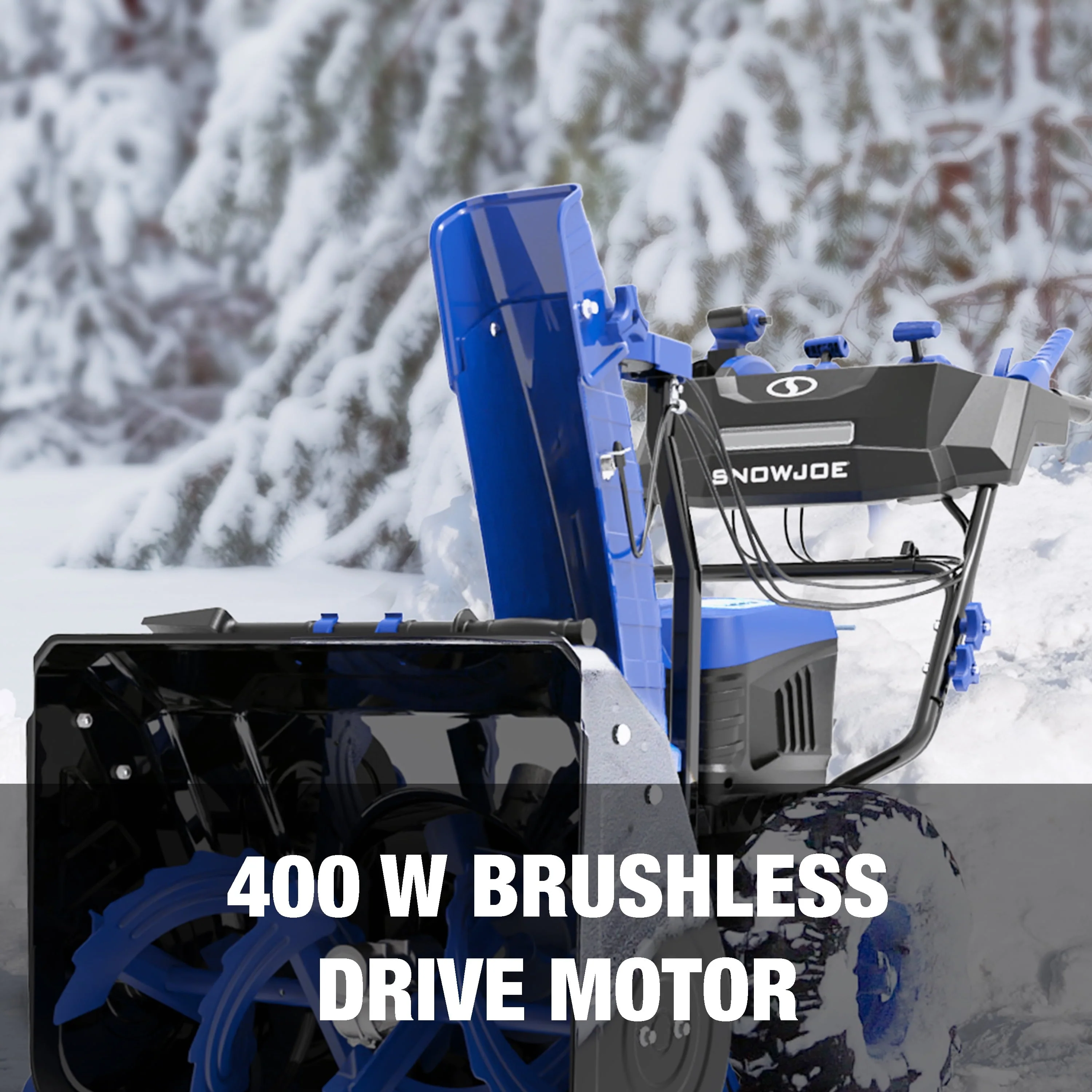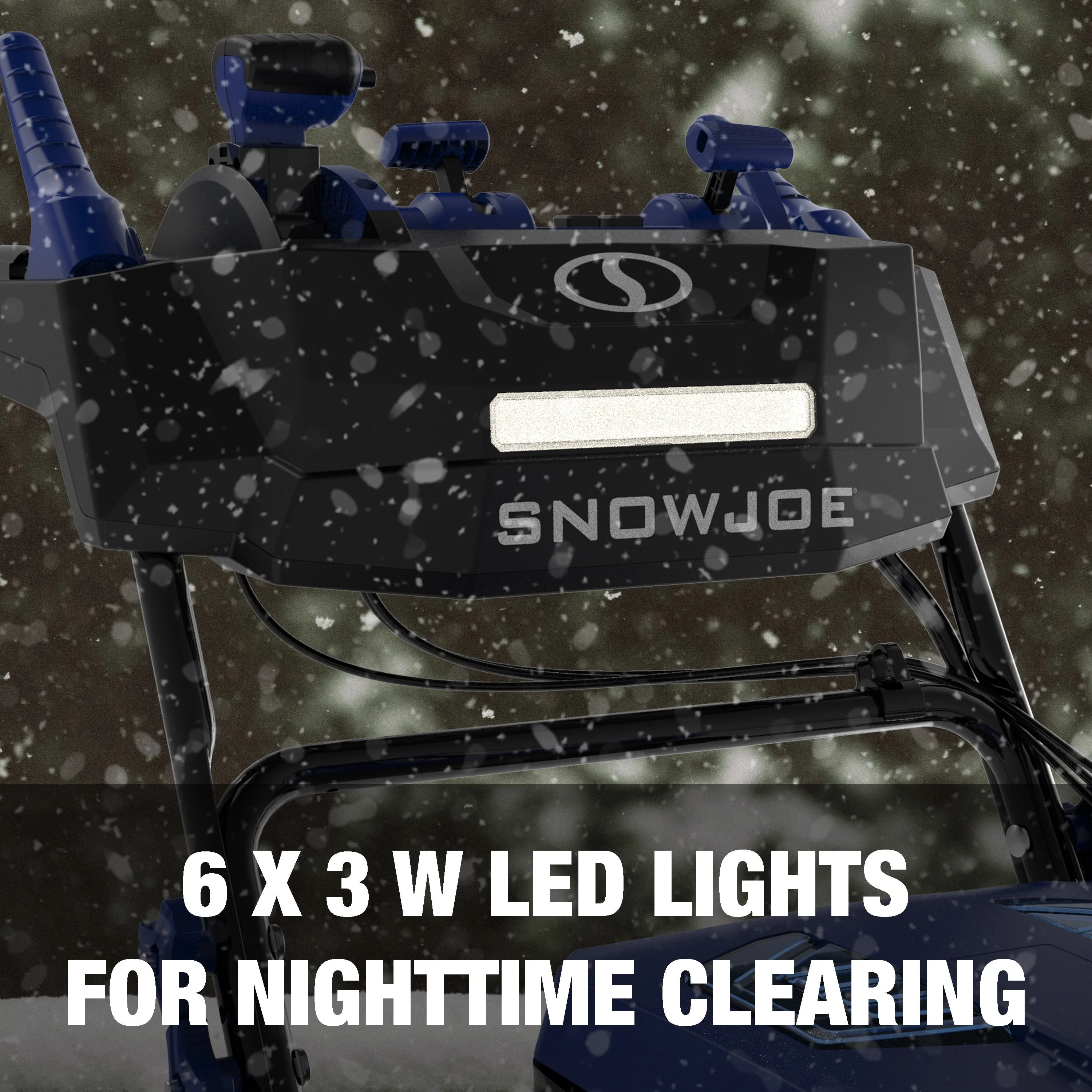 WAGE WAR ON WINTER. The latest revolution in snow-clearing technology meets the 24V IONMAX Battery System with the 24-inch 96V Max Cordless Battery-Powered Self-Propelled Dual-Stage Snow Blower from SNOW JOE®. Driven by Snow Joe's exclusive 24-Volt battery series, the self-propelled SNOW JOE features four high-capacity 24-volt, 12.0-Ah lithium-ion batteries that deliver up to 96 volts of max power + performance, with zero carbon emissions for cleaner air. SNOW JOE boasts a variable drive speed lever featuring forward and reverse settings, a powerful 3200-watt brushless plowing motor + 400-watt brushless drive motor, and 2 serrated steel blades that quickly clear a 24-inch wide by 17.5-inch deep path in a single pass. Plus, the 180º auto-rotate chute throws snow up to 40 feet away, and the integrated scraper bar at the base of the unit clears right to the ground without damaging your deck, driveway or pavement. After dark, the six 3-watt LED lights brighten the way for safer nighttime clearing. And when the work is done, the two high-speed, dual-port chargers can recharge in as fast as 6 hours so you're ready to tackle even more snow!