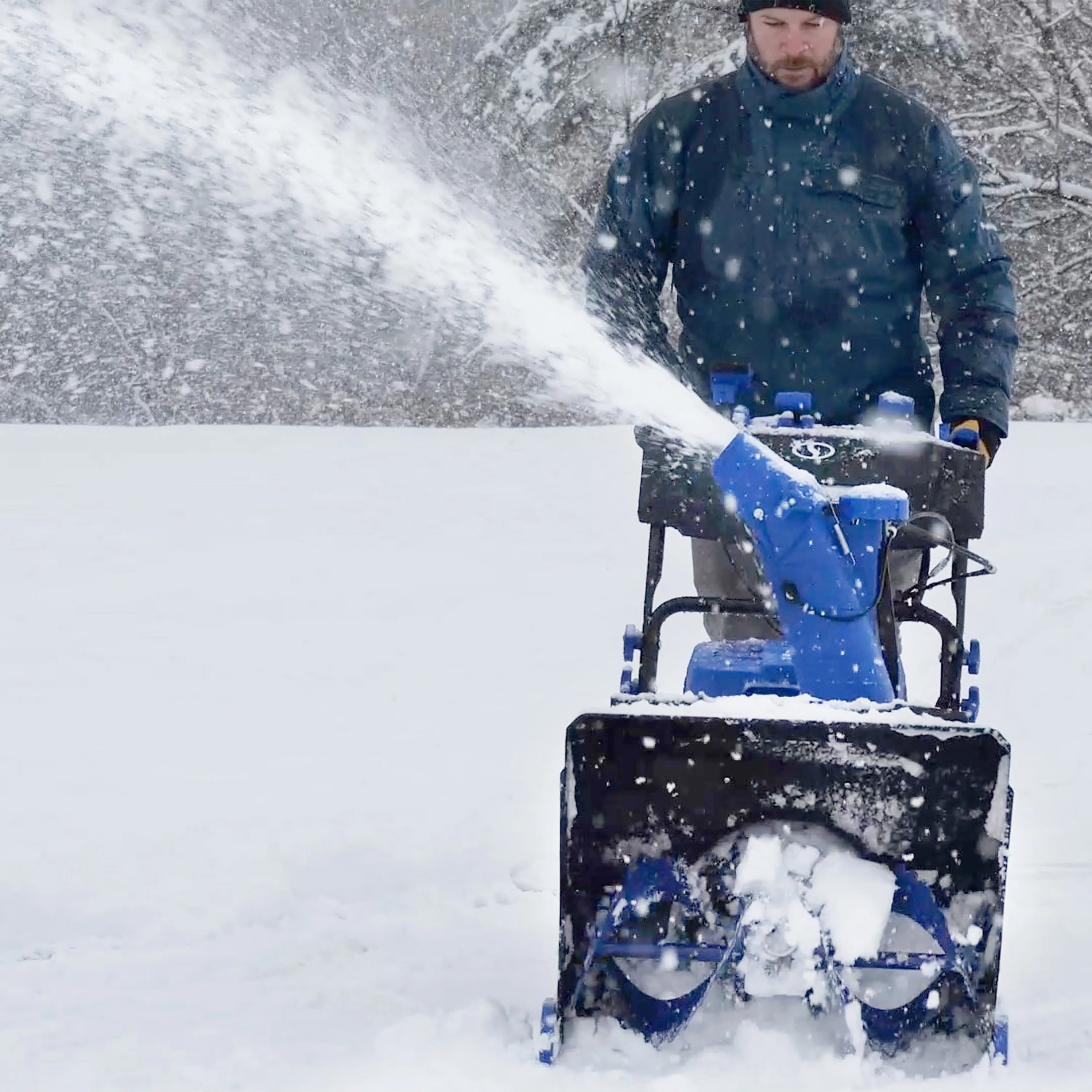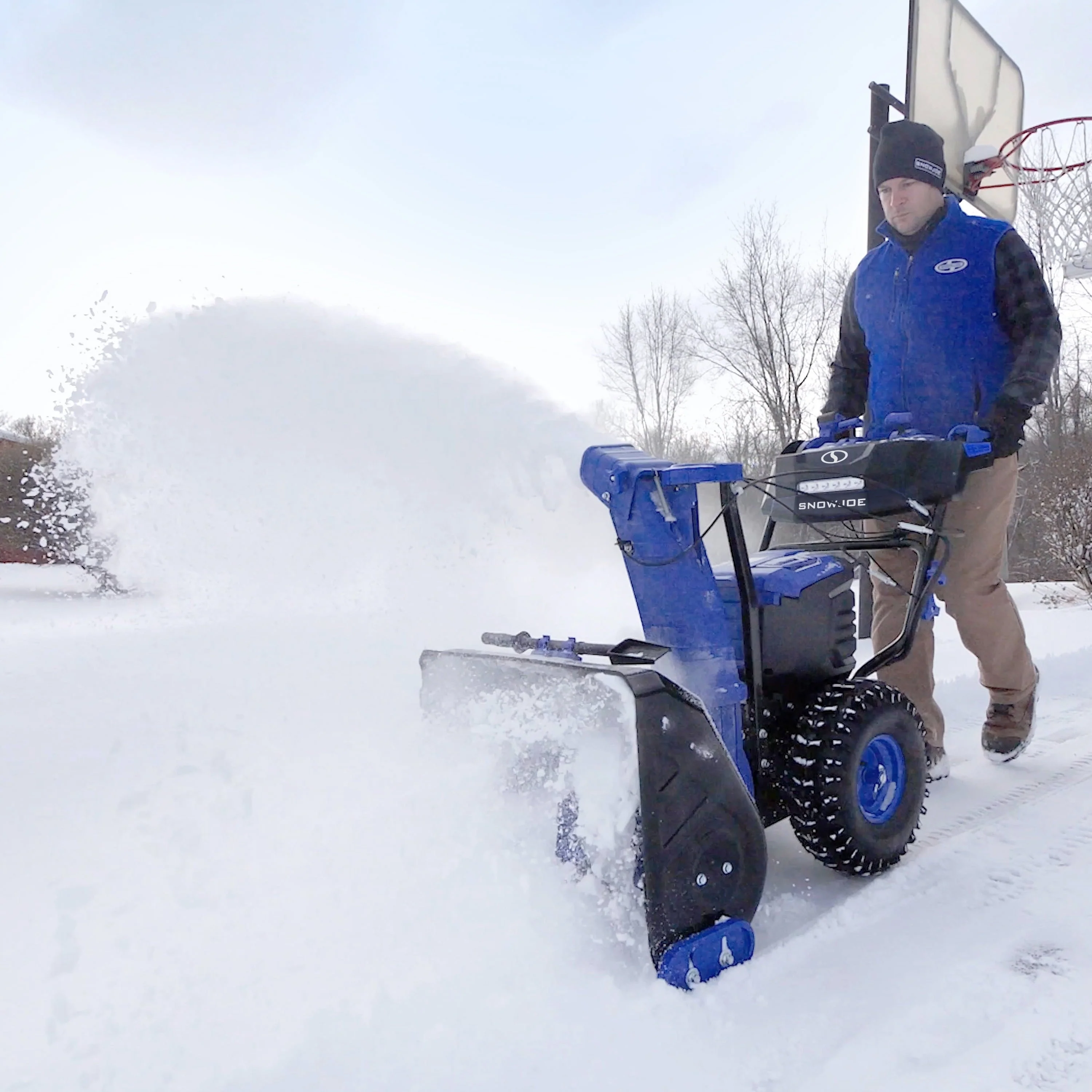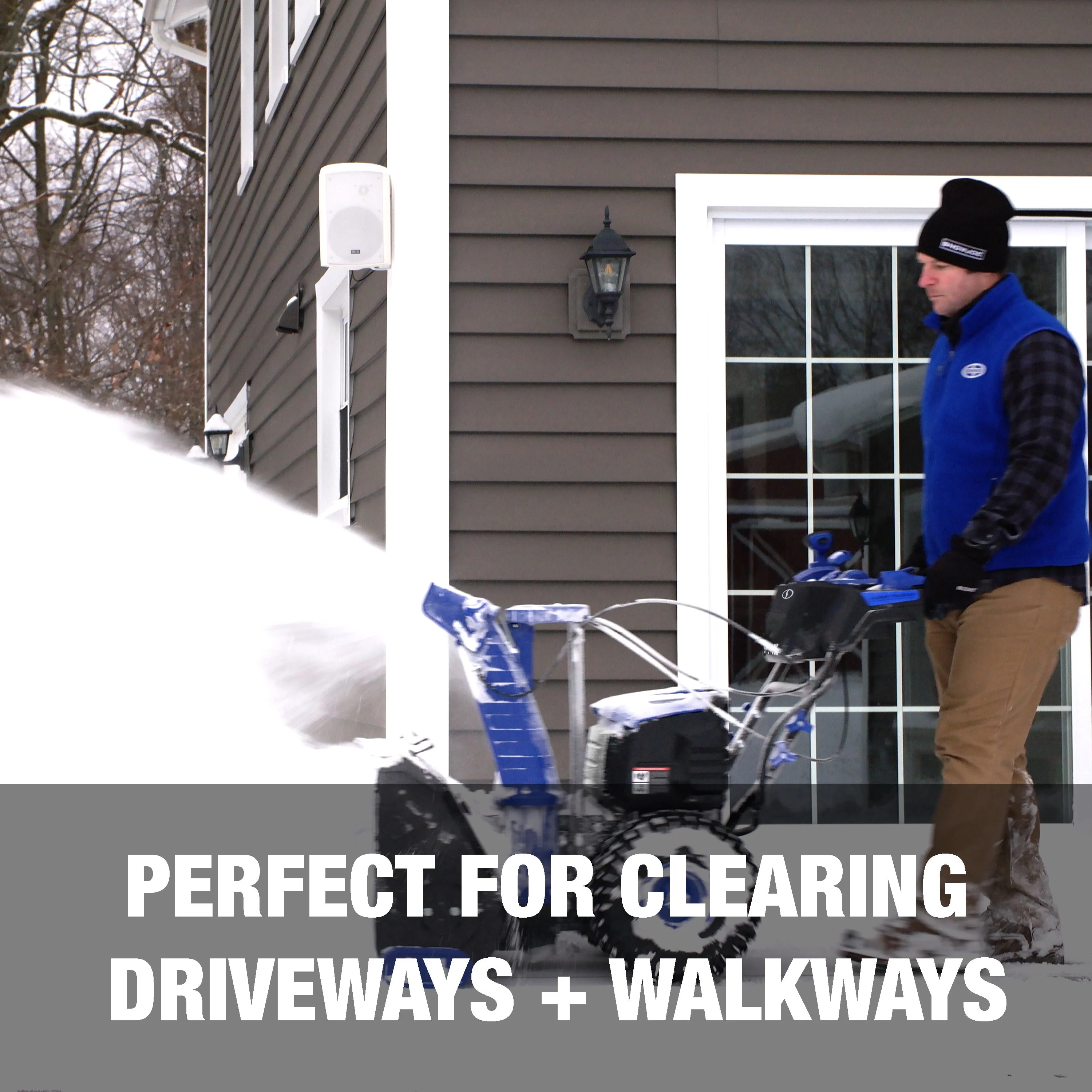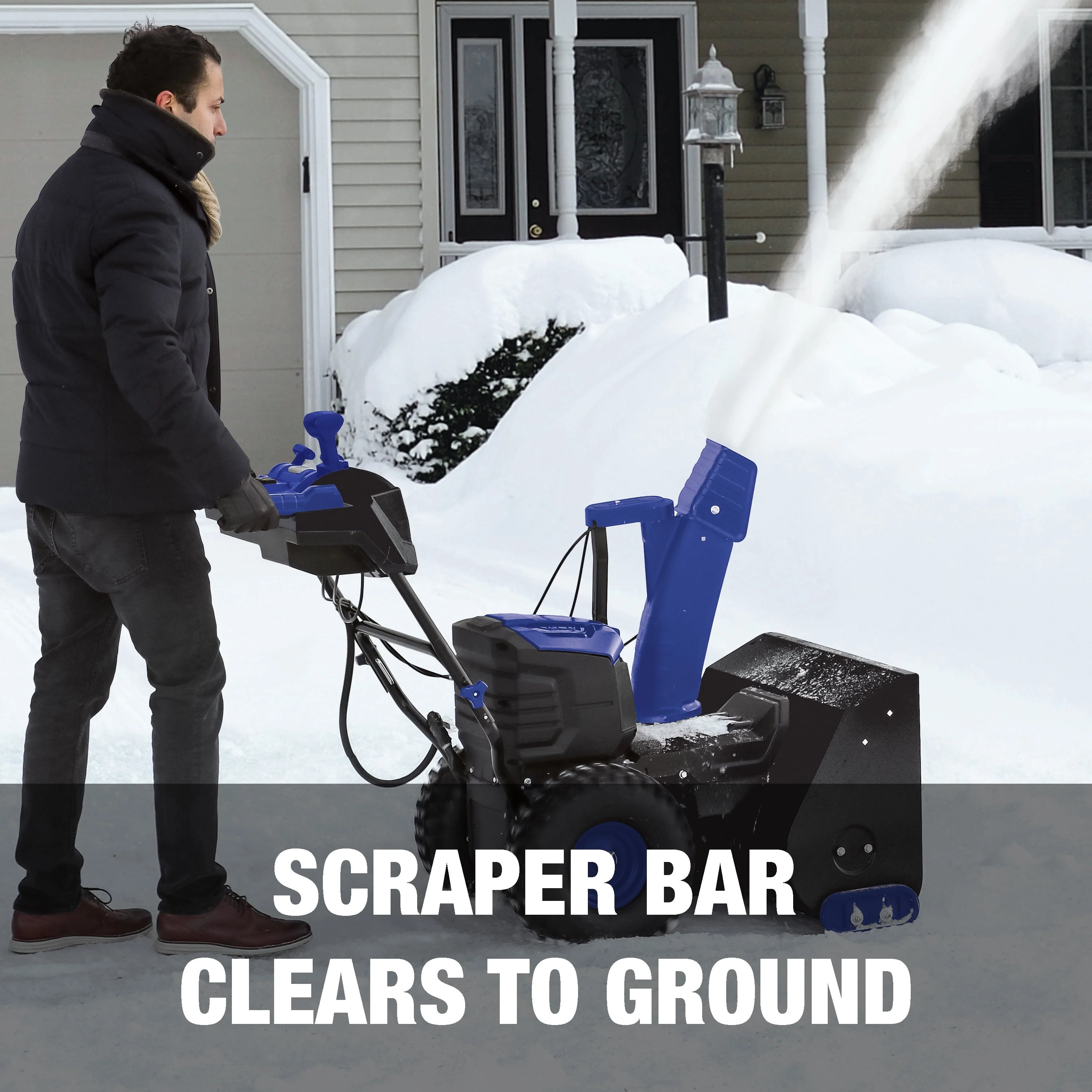 WAGE WAR ON WINTER. The latest revolution in snow-clearing technology meets the 24V IONMAX Battery System with the 24-inch 96V Max Cordless Battery-Powered Self-Propelled Dual-Stage Snow Blower from SNOW JOE®. Driven by Snow Joe's exclusive 24-Volt battery series, the self-propelled SNOW JOE features four high-capacity 24-volt, 12.0-Ah lithium-ion batteries that deliver up to 96 volts of max power + performance, with zero carbon emissions for cleaner air. SNOW JOE boasts a variable drive speed lever featuring forward and reverse settings, a powerful 3200-watt brushless plowing motor + 400-watt brushless drive motor, and 2 serrated steel blades that quickly clear a 24-inch wide by 17.5-inch deep path in a single pass. Plus, the 180º auto-rotate chute throws snow up to 40 feet away, and the integrated scraper bar at the base of the unit clears right to the ground without damaging your deck, driveway or pavement. After dark, the six 3-watt LED lights brighten the way for safer nighttime clearing. And when the work is done, the two high-speed, dual-port chargers can recharge in as fast as 6 hours so you're ready to tackle even more snow!