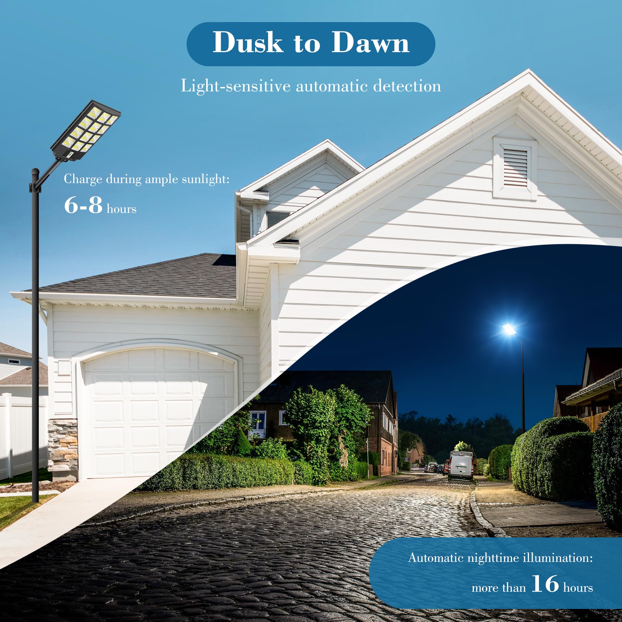 • [INTELLIGENT CONTROL]: The Solar street lights outdoor dusk to dawn includes three lighting modes and remote control for convenience: 1. Motion Sensor Mode: The light operates at 30% brightness and increases to 100% upon detecting motion, then reverts to 30% after 30 seconds without movement. Dusk to Dawn: The light automatically turns on at dusk and off at dawn. 2. Brightness Adjustment: Four levels of brightness adjustment ranging from 25% to 100%. 3. Timed Lighting Settings: Options for 3 hours, 5 hours, or 8 hours of illumination.
