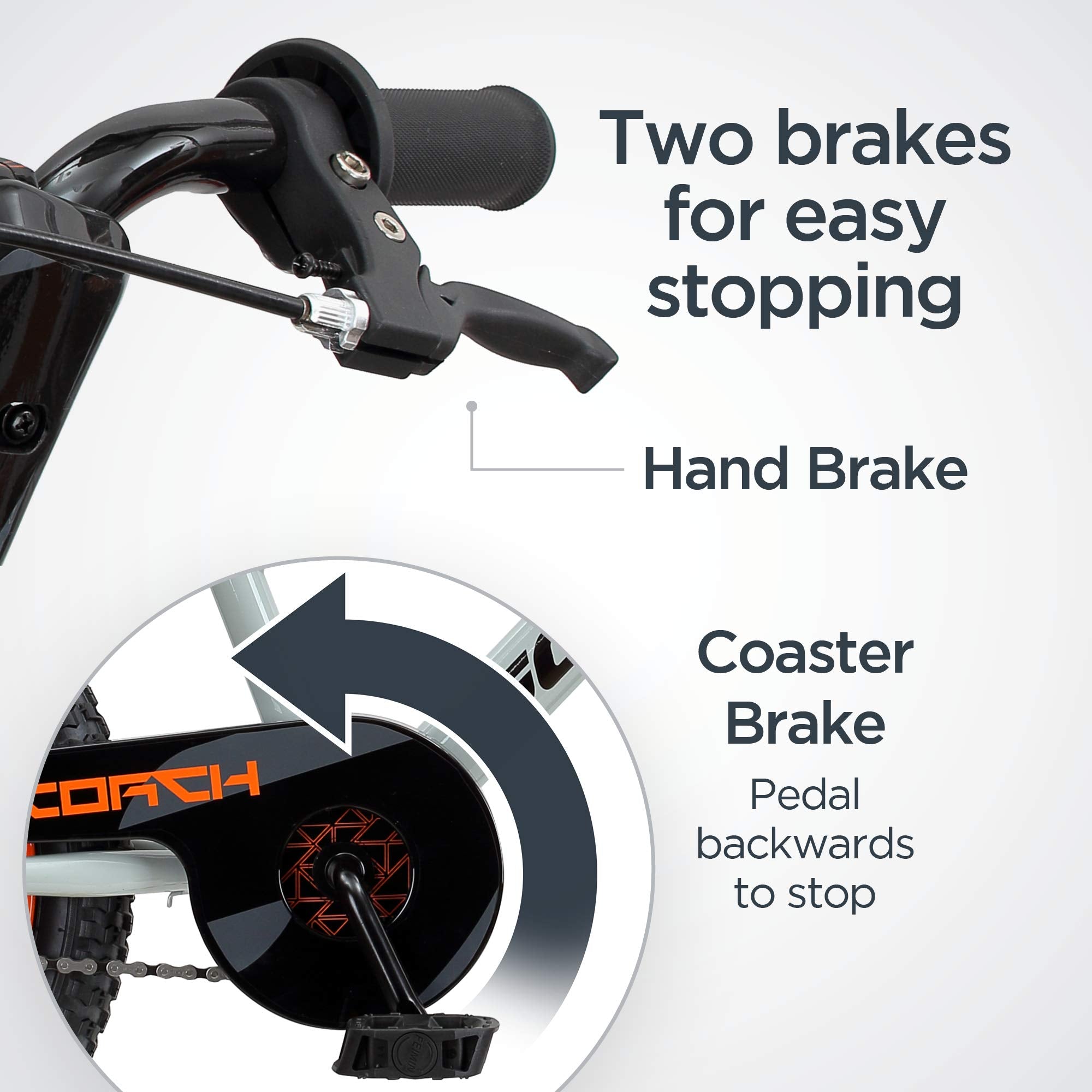 - Designed with younger riders in mind. this bike includes a rear coaster brake (reverse the pedals to stop) and a front caliper brake (hand-brake like adult bikes); easing the transition to a hand-brake-only bike when theyu2019re ready.