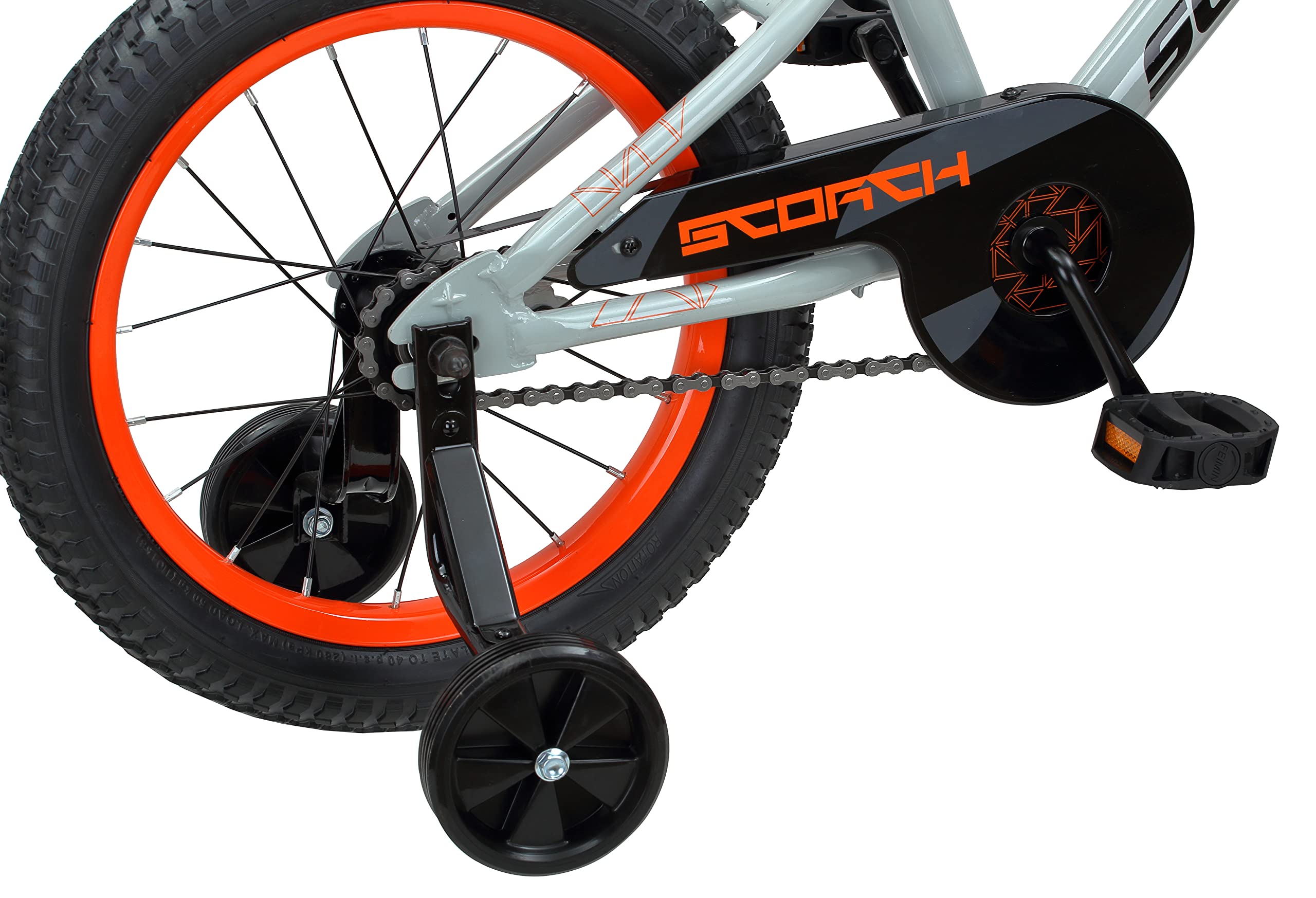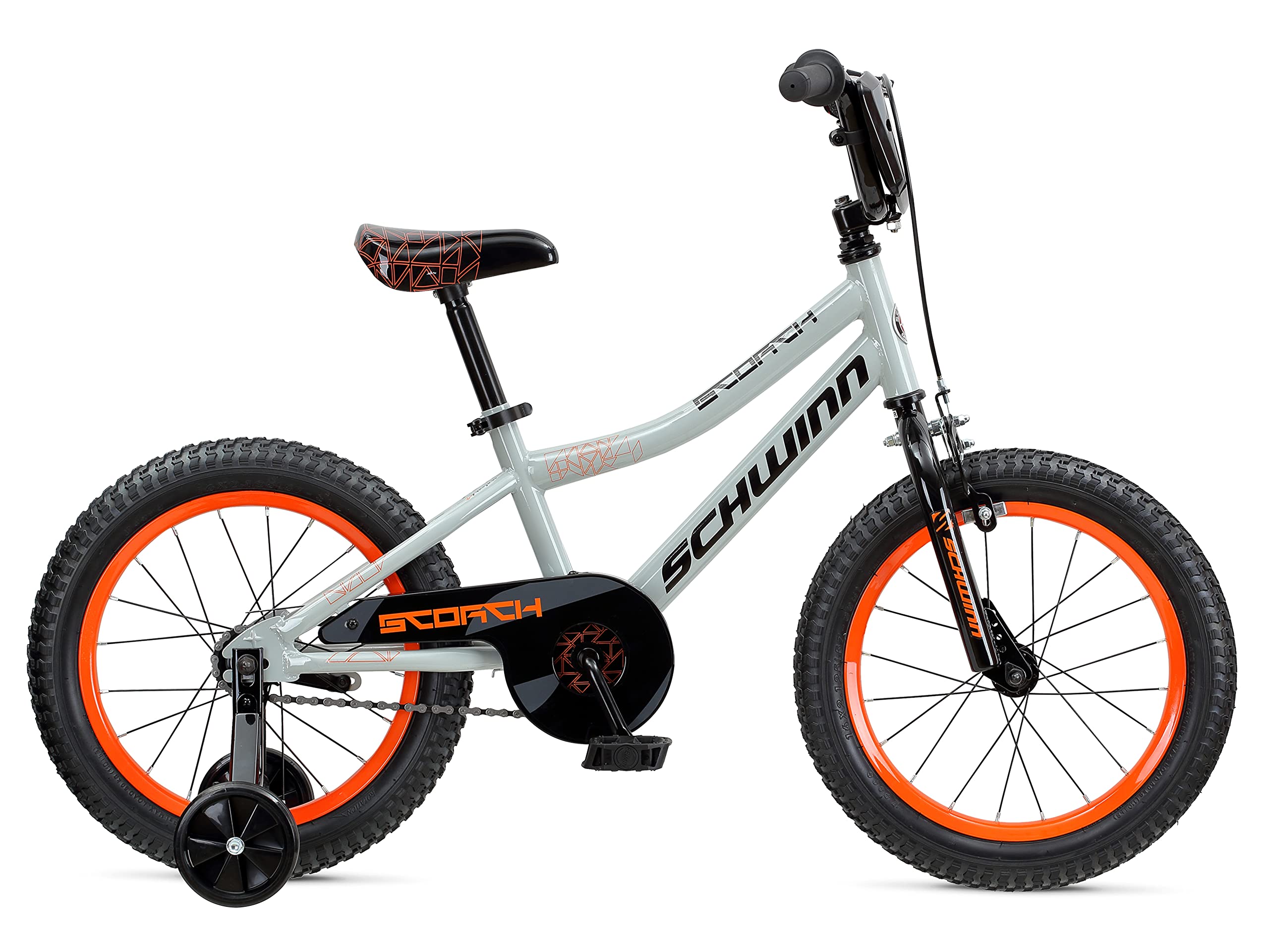 - The Schwinn Scorch boy's bike with 16-inch wheels comes ready to be assembled and includes training wheels and a racing-style number plate.
