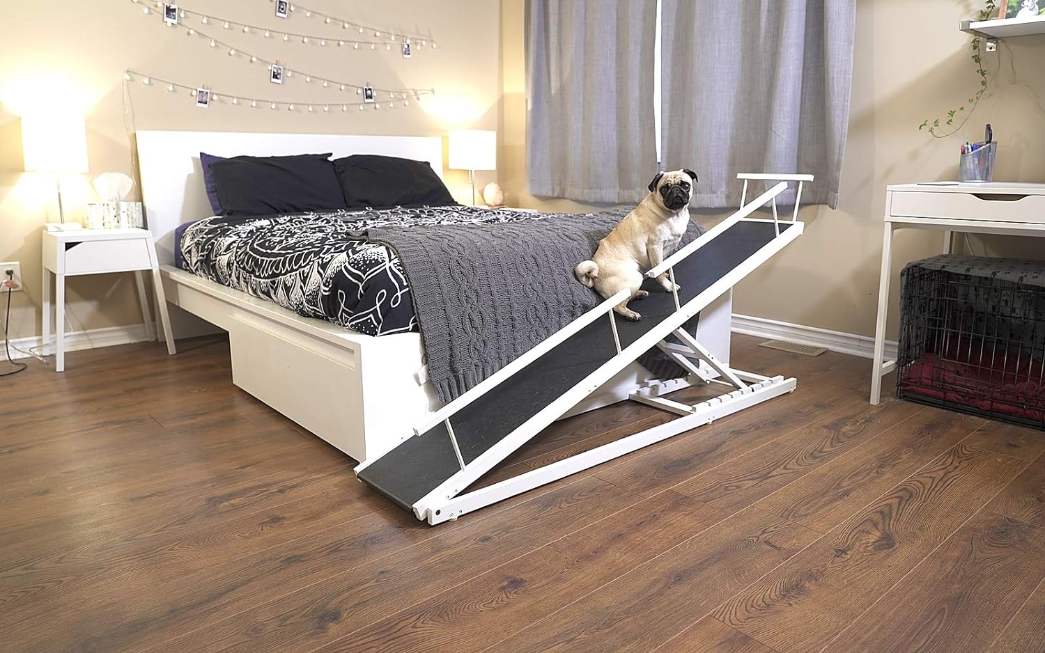 - ADJUSTABLE HEIGHT & COLLAPSIBLE – Our adjustable dog ramp has 7 height intervals from 12″ to 37″ high. accommodating even the tallest beds. The whole ramp can also be folded down to just 3″ high for easy storage.