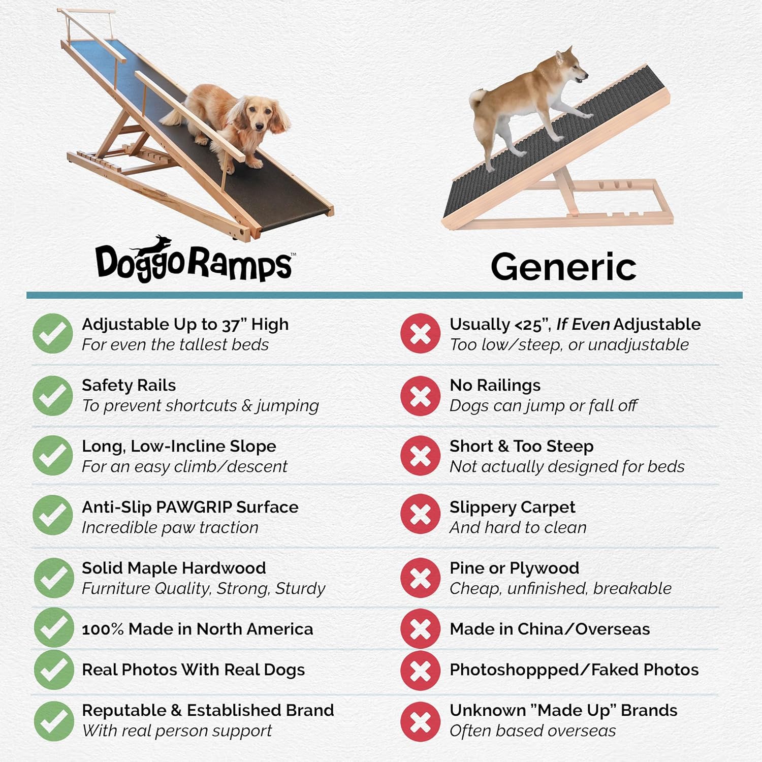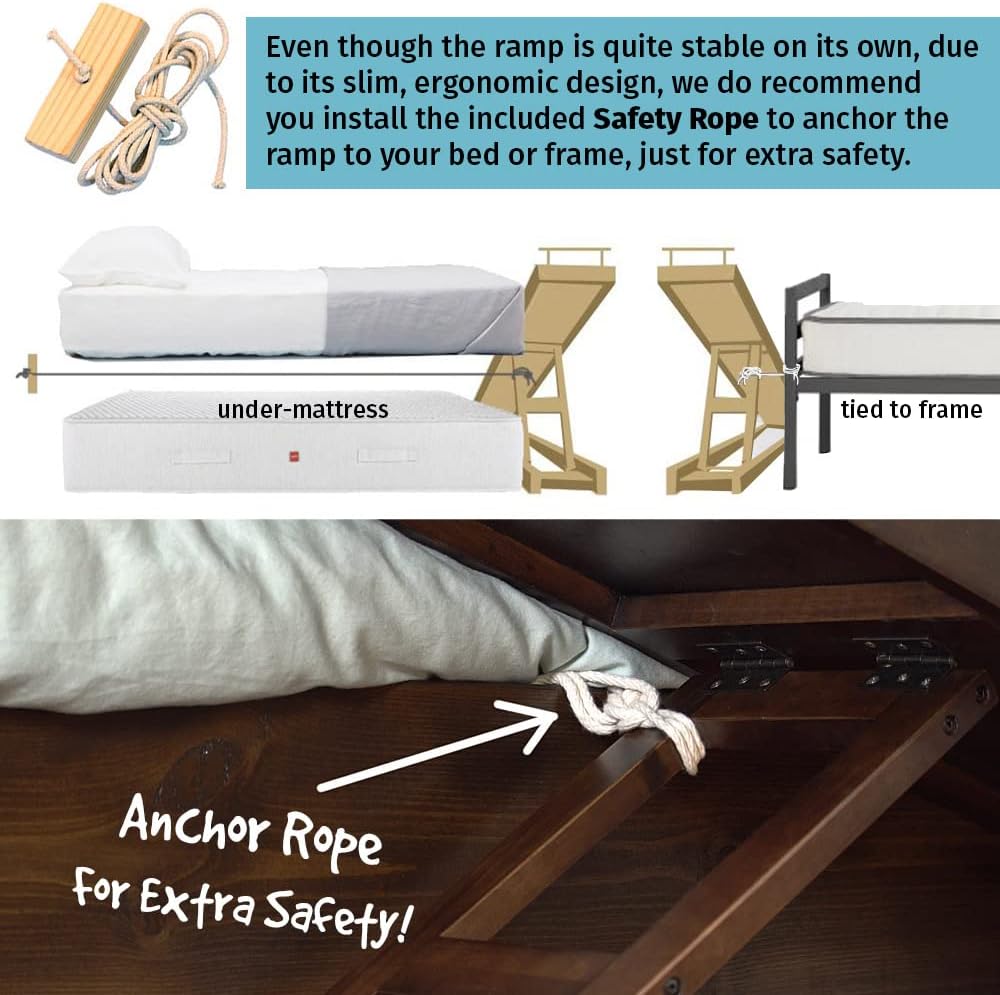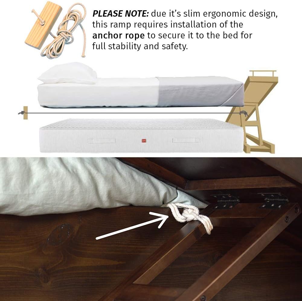 - MORE SAFETY RAMP FEATURES: The long low incline design makes it for your dog even for higher beds. Safety rails keep the dog focused on the ramp from top to bottom. and our unique Anchor Rope keeps the ramp extra stable and secure. The strong hardwood frame holds dogs up to 50lbs.