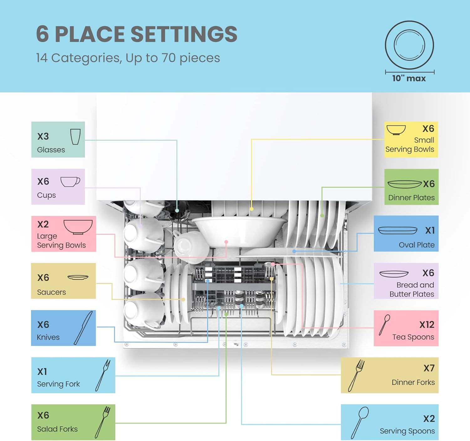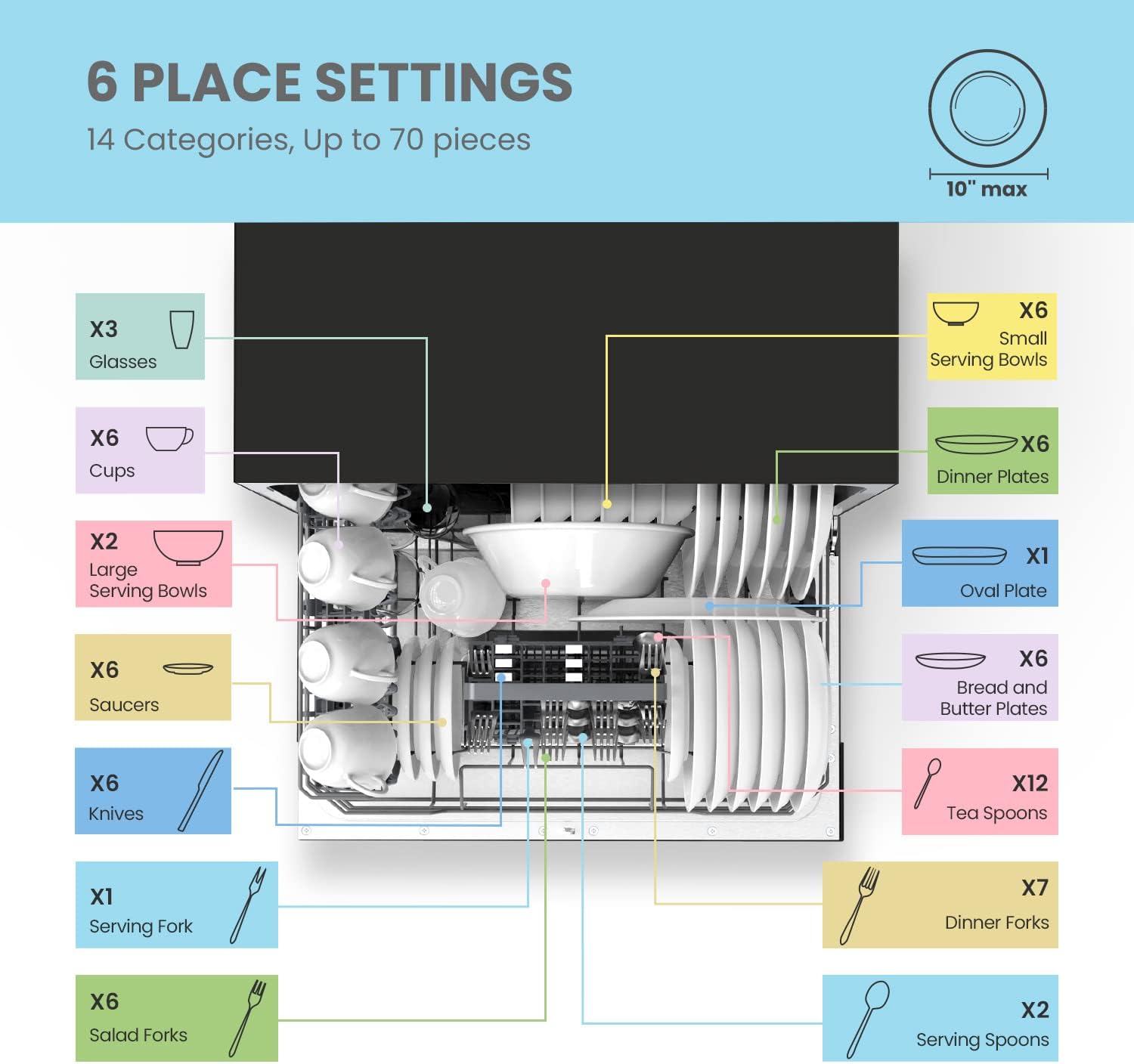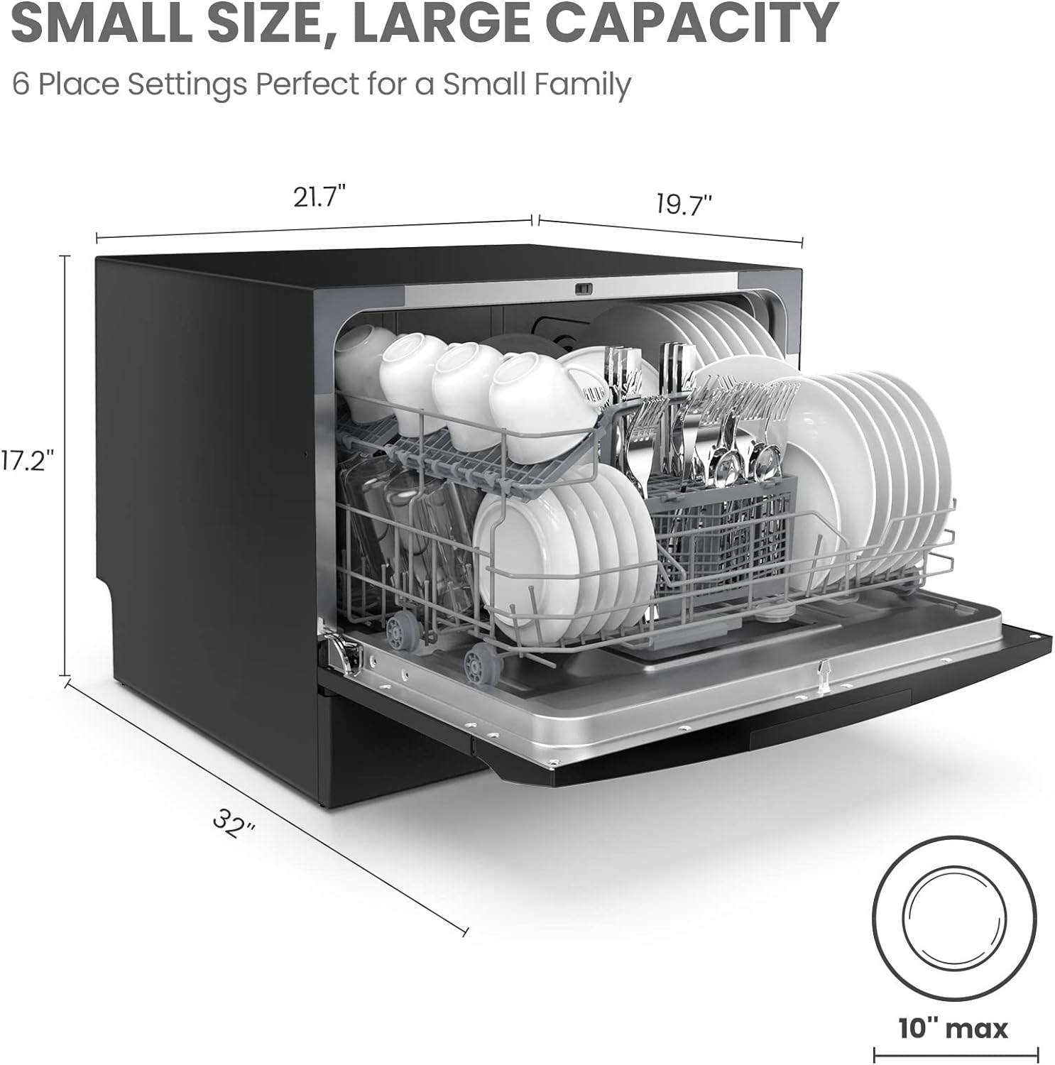 • 【6 Place Setting】- A perfect size(H438×W550×D500mm) for 2-3 people. COMFEE' compact dishwasher is suitable for dorms. RVs and apartments. This countertop dishwasher can fit up to 70 pieces of tableware. and a plate size of up to 10 inches diameter. Note: COMFEE dishwashers are tested at the factory before they are shipped. If your new dishwasher has some water inside. this is normal.