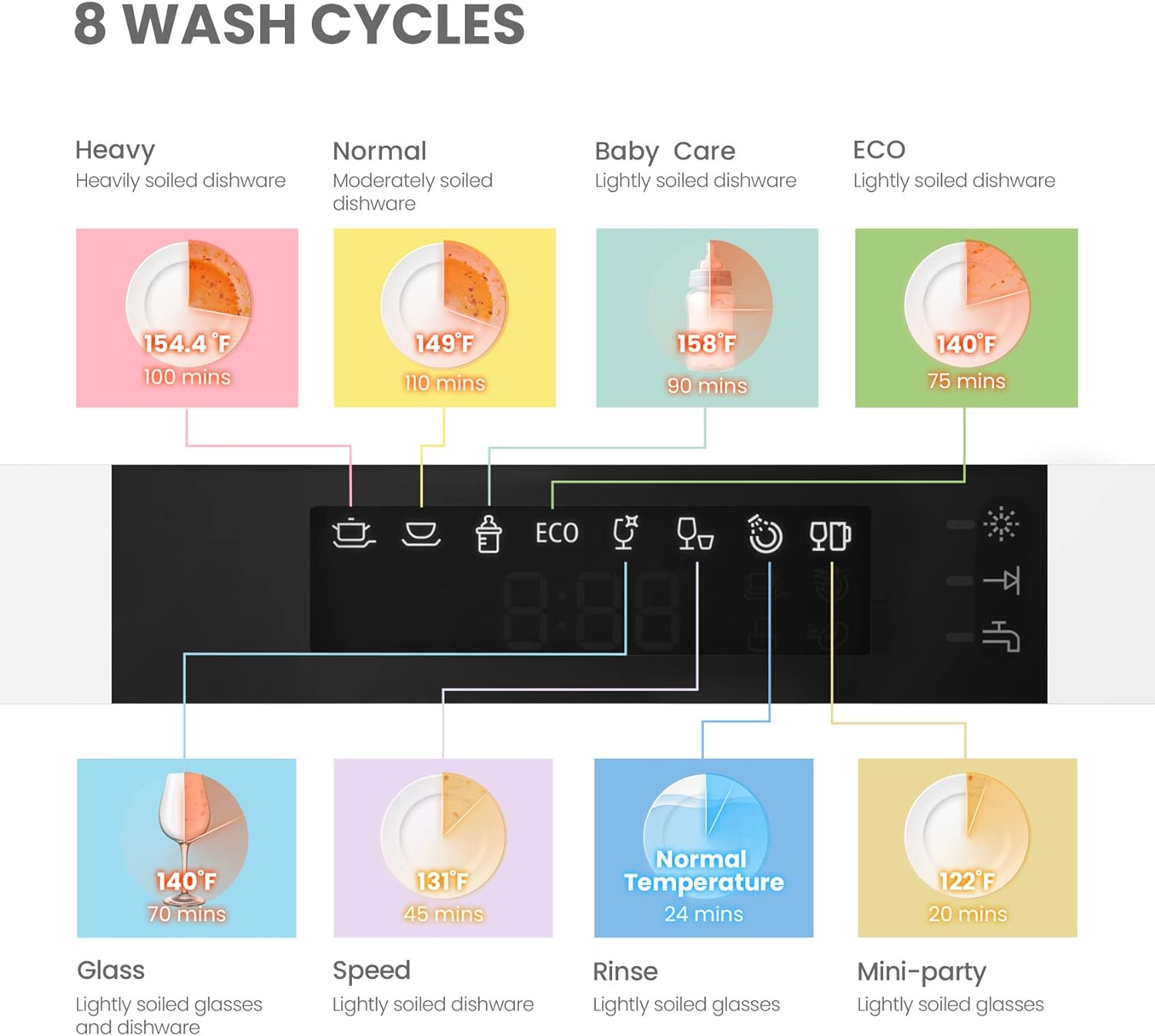 • 【8 Washing Cycles】- Most of the cleaning cycles. including Heavy. Normal. Baby-Care. ECO. Glass. and Speed. helped with extra-drying function. and deliver sparklingly cleaned and dried dishes. Three more cleaning options. including Speed. Mini-party. and Rinse. are designed for COMFEE' compact dishwasher. providing high flexibility for you to choose in different situations.