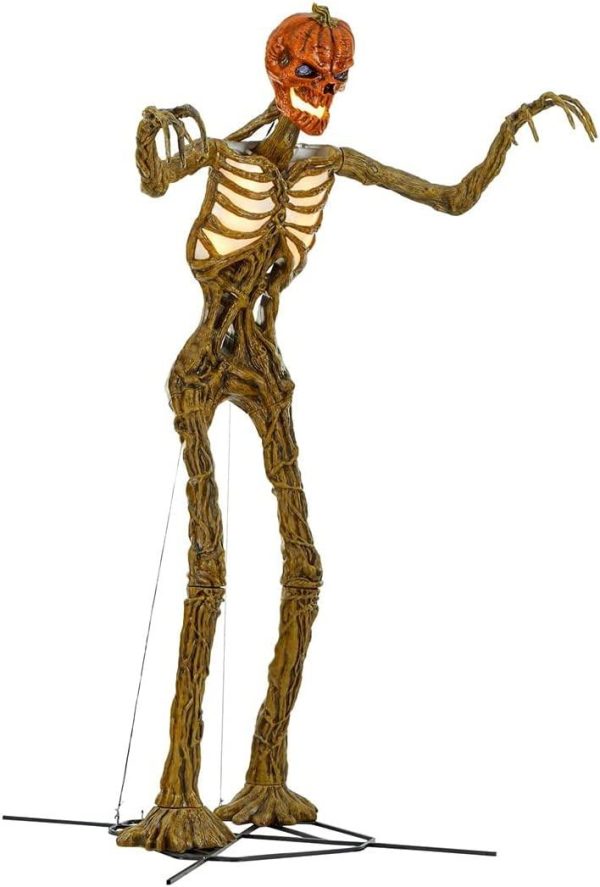 Summon souls to your ghostly gatherings with this Pumpkin Skeleton. An imposing 12-foot height makes your lawn the talk of the neighborhood. and the LCD glowing eyes stare at those passing by. Posable arms let you create playful or scary setups to welcome trick-or-treaters to your treacherous retreat. Included ground stakes hold this spooky specter securely in place on your lawn. This Pumpkin Skeleton uses adapter power to illuminate his fiery chest and piercing eyein place on your lawn. This Pumpkin Skeleton uses adapter power to illuminate his fiery chest and piercing eyes.