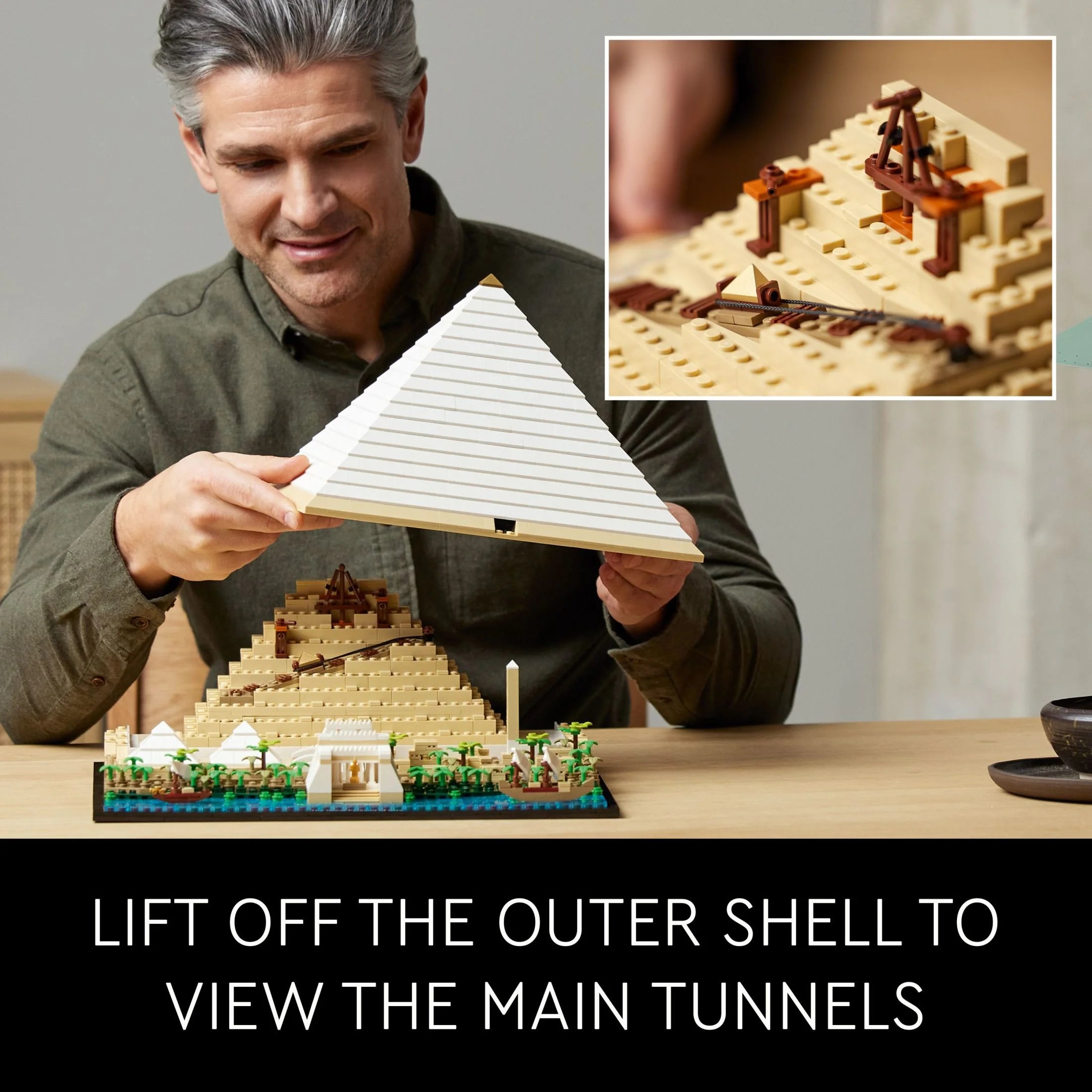 Take an imaginative leap back in time to the 26th century BC and experience the building of one of the Seven Wonders of the Ancient World with this LEGO Architecture Great Pyramid of Giza (21058) model building kit for adults. This model contains everything you need to build the pyramid and its surroundings. See what the area along the Nile River is believed to have looked like in ancient times. With this LEGO famous landmarks set you can build a beautifully detailed cross-section model of the Great Pyramid. revealing its main tunnels and chambers. Lift off the outer shell to reveal the stone-moving system that may have been used to move huge stones during its construction. or view from the back to see the King and Queen's Chambers and main tunnels. Also included is a section of the Nile river with 2 LEGO brick versions of feluccas (ancient boats). 2 small pyramids. 2 mortuary temples. Sphinx statue. a workers' village and an obelisk. Clear instructions are included to guide your DIY building adventure and your creation can be connected to a second model (sold separately) for a full pyramid shape. This brick-built collectible is part of a range of LEGO Architecture sets for adults who enjoy creative hobbies. It makes a wonderful treat for yourself and an impressive gift for an architecture connoisseur. history buff or travel lover. Measuring over 8 in. (20 cm) high. 13.5 in. (35 cm) wide and 12.5 in. (32 cm) deep. Contains 1.476 pieces.
