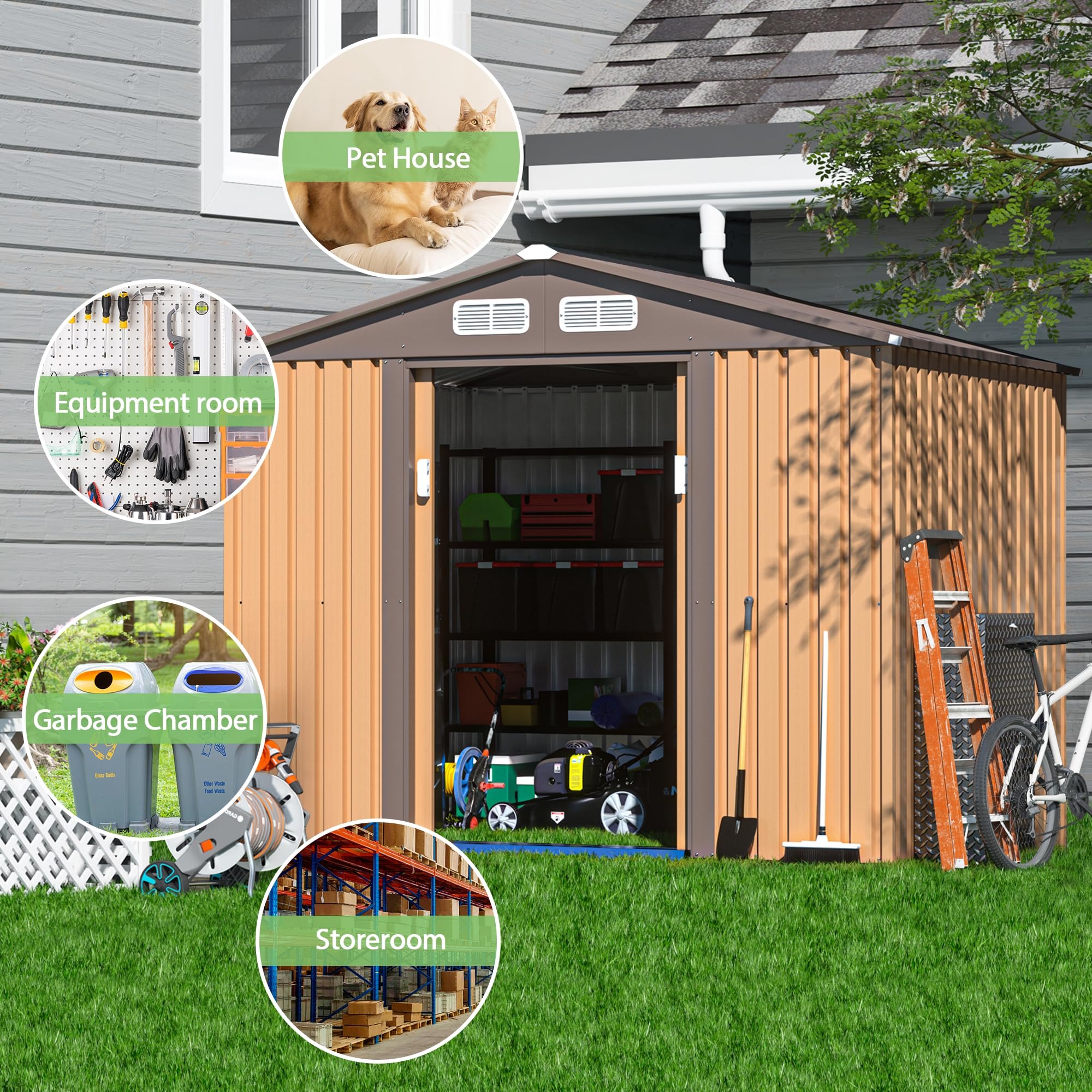 - ud83dudd27u3010Ventilation & Waterproof Designu3011:This tool shed is designed with 4 vents to keep the air circulating and dry inside. The sloping roof design adds additional storage space and allows rainwater to flow down quickly. preventing it from collecting.