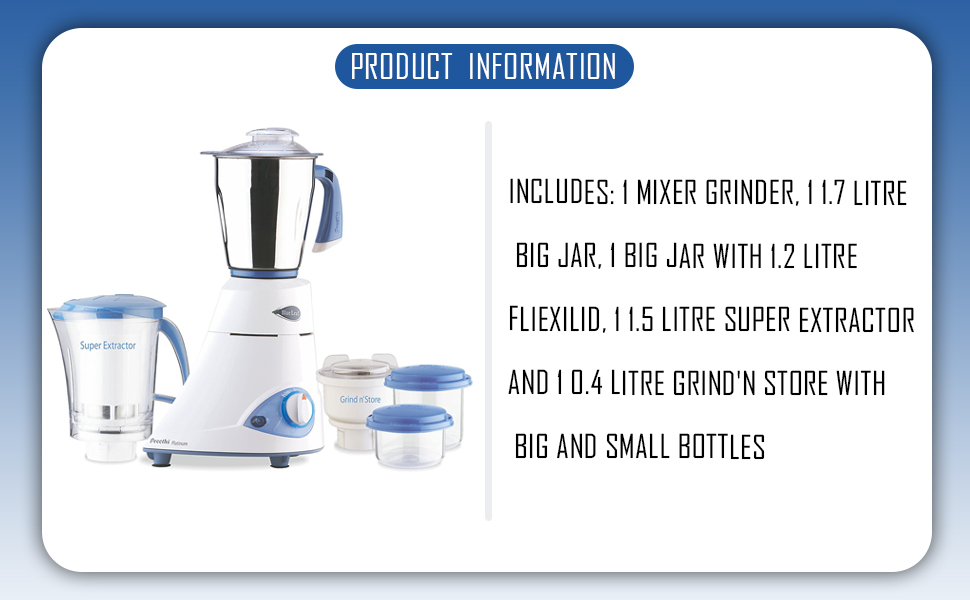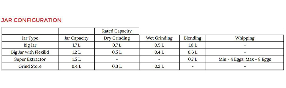 • Jar configuration: 1.75 litres s.s jar.1.5 litres super extractor jar. 0.4 litres grind n' store with big bottle and small bottle. ; High Grade Nylon Couplers for smooth trouble free usage