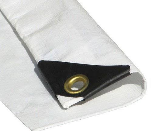 TarpsNow offers industrial-grade Poly Tarps. This tarpaulin is resistant to tearing, UV, mildew, acid, rot, and more. The mesh count is 12 x 14 per sq inch. The weight is 6 oz per square yard with a thickness of 12 Mil. Our Tarps are 100% waterproof, incredibly durable, and flexible. - : Our Poly Tarp is constructed of 3 Ply material and both sides are coated with a solid polyethylene : Hems are reinforced woven with rope and coated polyethylene finish. : Can withstand tough weather conditions even under harsh arctic temperatures. : The size is 10' x 14' (Actual Size 9'-6 inch x 13'-6 inch). The color is White on both sides. : These tarp covers are crafted with #2 aluminum grommets and spaced approx every 18 inch. Tarps Now waterproof Poly Tarps are perfect for camping, covering vehicles like cars, trucks, boats, furniture, etc. : This tarp is cut size, finish 6 inch-8 inch smaller than the full size.