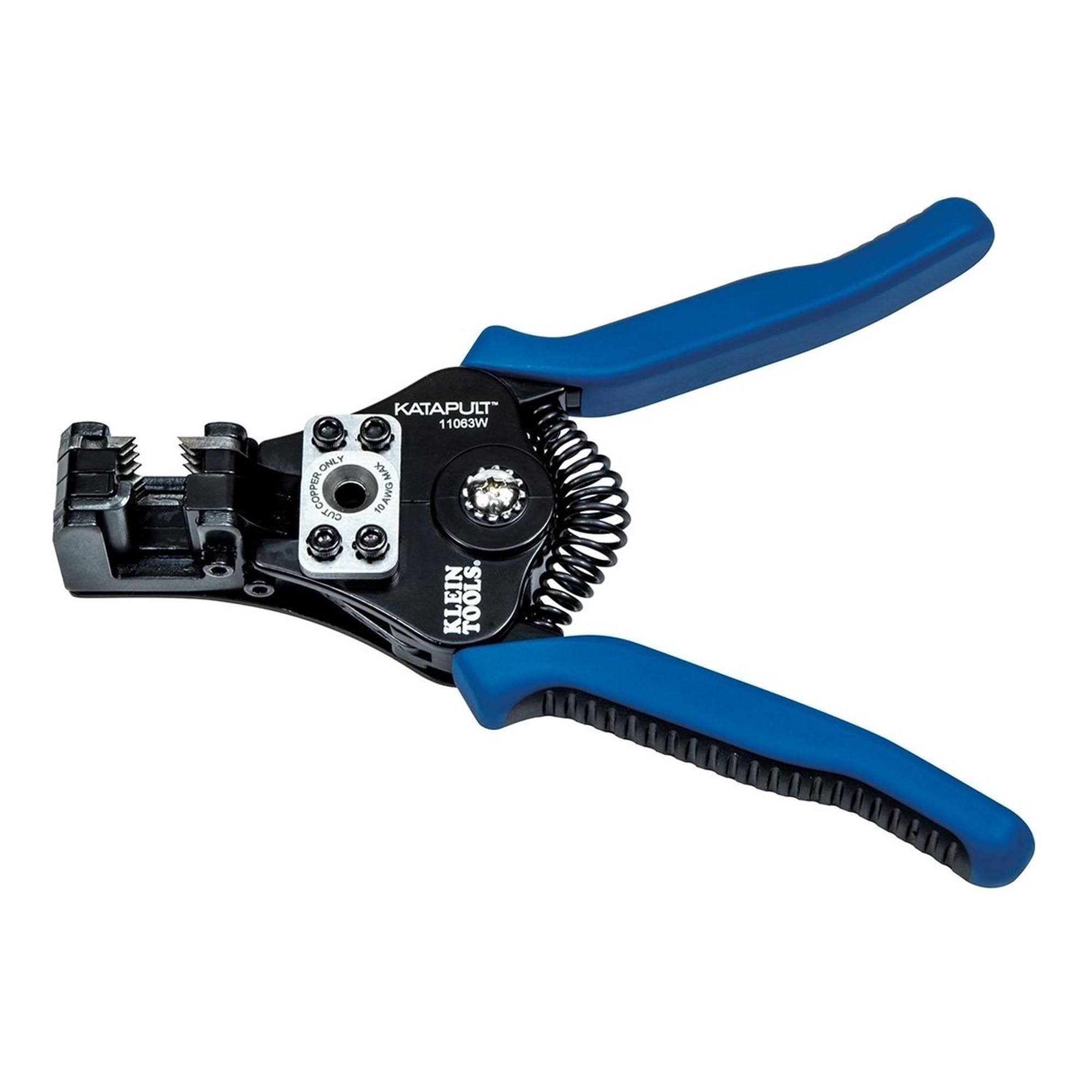 The Klein Tools 11063 8-22 AWG Katapult Wire Stripper cuts and strips 8-22 AWG wire with ease. Remove up to 1" in length of the insulation layer (jacket layer) in a single step. The tension loaded wire-grip gently holds the cable in place while retaining the cable geometry. Precision machined stripping holes easily remove the jacket insulation without damaging the wire. Recoil spring design returns tool to ready position upon cycle completion. Cast alloy chassis with heavy-duty Coat finish for corrosion resistance and durability. Manufactured with the needs of the professional tool user in mind, Klein strippers, cutters, and crimpers are designed to get jobs done with precision and quality. Since 1857, the company operated by Mathias Klein and his descendants to the fifth generation, has grown and developed along with the telecommunications and electrical industries where Klein pliers first found major usages. Today, Klein Tools Inc represents much more than Klein pliers. The company's product line has broadened to include virtually every major type of hand tool used in construction, electronics, mining and general industry in addition to the electrical and telecommunications fields. Internationally, Klein's products are available around the world through a well-established network of agents and distributors who stock the products that are required for their particular markets. Klein's reputation as a leading producer of professional-quality products is global Cuts and strips 8-22 AWG wire with ease. Compound action stripping: grip and strip via single-action squeezing motion. Precision machined stripping holes easily remove insulation without damaging the wire. Remove up to 1'' (25 mm) in length of the insulation layer (jacket layer) in a single step. Tension loaded wire-grip gently holds the cable while retaining cable geometry.