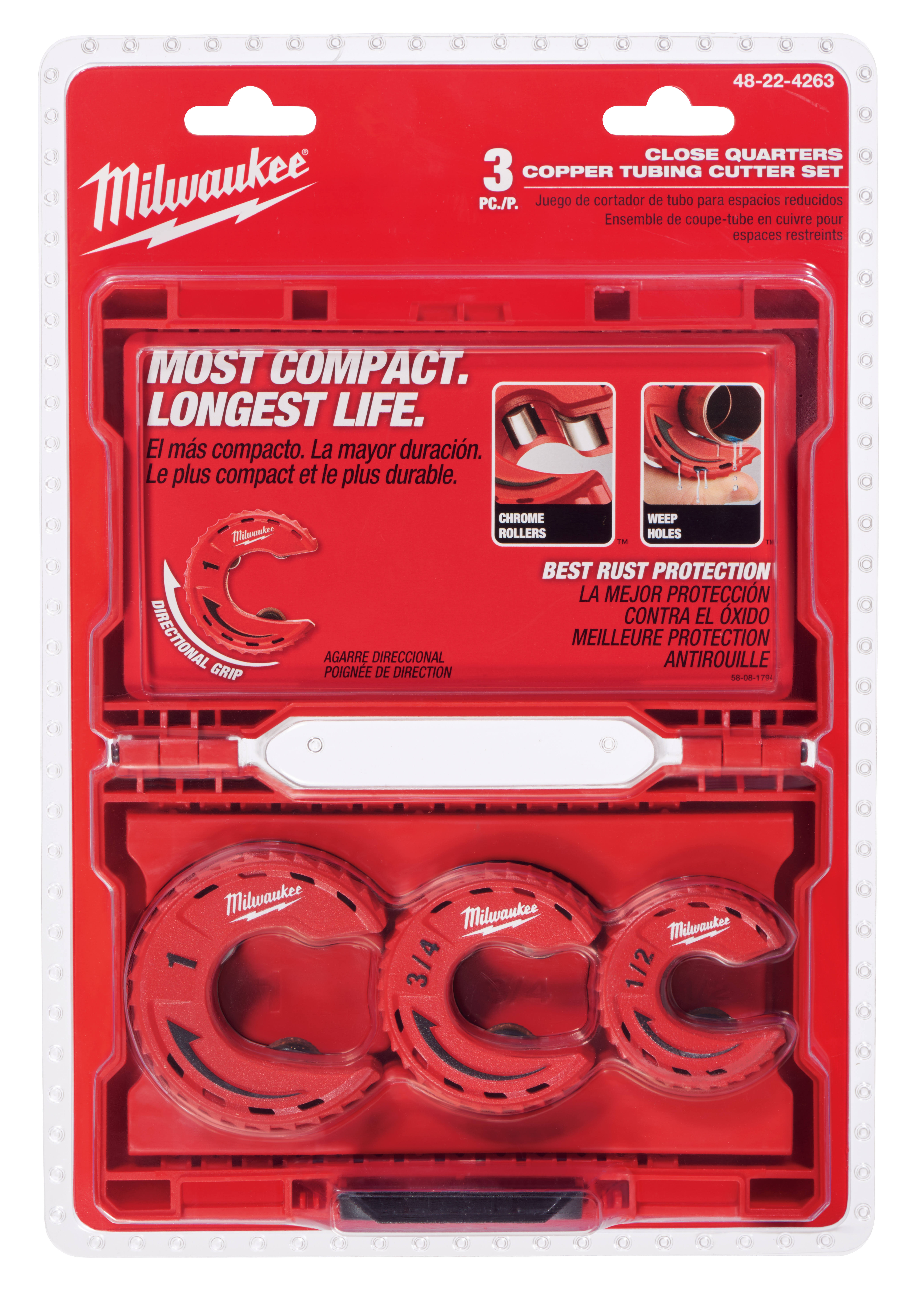 Milwaukee Close Quarters Tubing Cutters are optimized for tough cuts in tight spaces. The compact design allows access to the tightest spaces. Chrome rollers deliver best in class rust protection while integrated weep holes allow water to drain from the tool. Directional grip allows better handling and quick identification of swing direction for easy use. Includes 1/2 inch, 3/4 inch, and 1 inch cutters and a storage case.