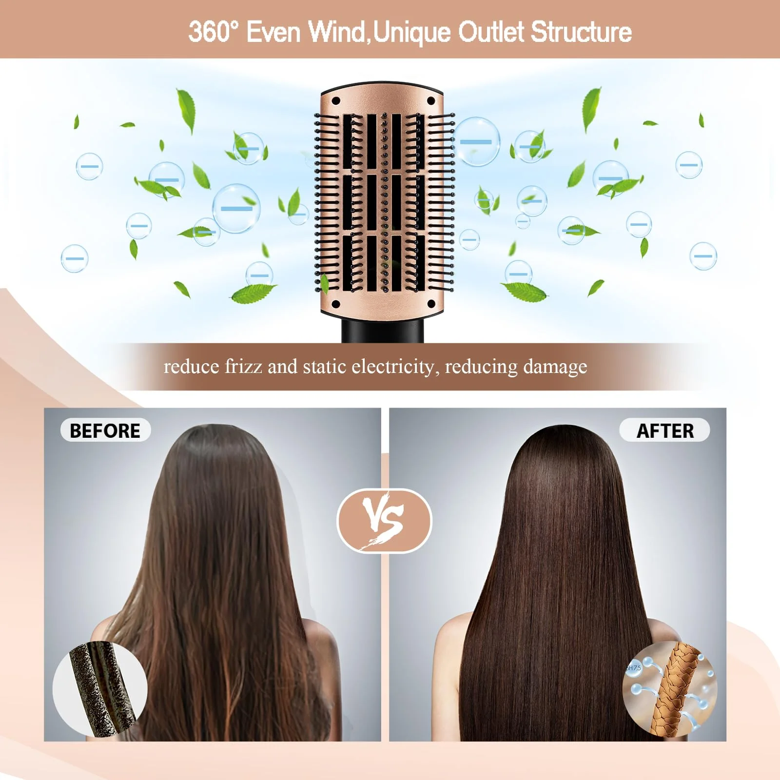 • 【CERAMIC COATING】Hair dryer brush 360° even blow, reduce frizz and static electricity, reducing damage&better at the same time condition your hair; Ceramic coating saturates the airflow, distributes heat evenly, penetrates the hair quickly, and accelerates drying from the inside out to help you create healthy hair. Designed with Nylon Pin&Tufted Bristles, it can prevent hair tangles, improve volume and shine of hair.