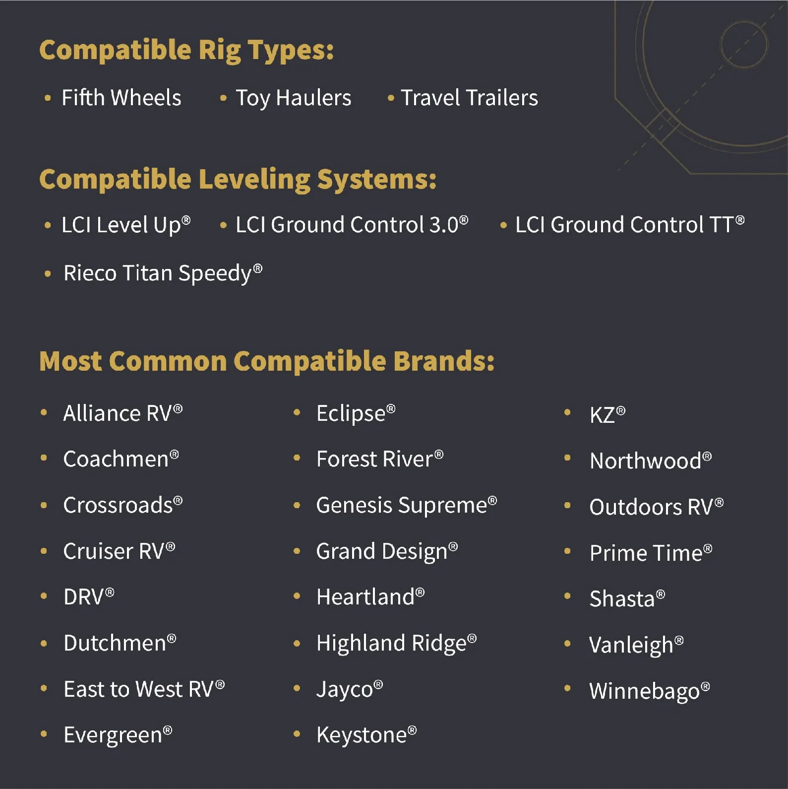 - HEAVY-DUTY DESIGN: SnapPads use high-strength ultra-dense recycled tire rubber to create weatherproof, waterproof pads that add over 1 inch of thickness to each jacks landing foot. The feet are shake tested for 50 G's of vibration and temperatures from -40 to 120℉.