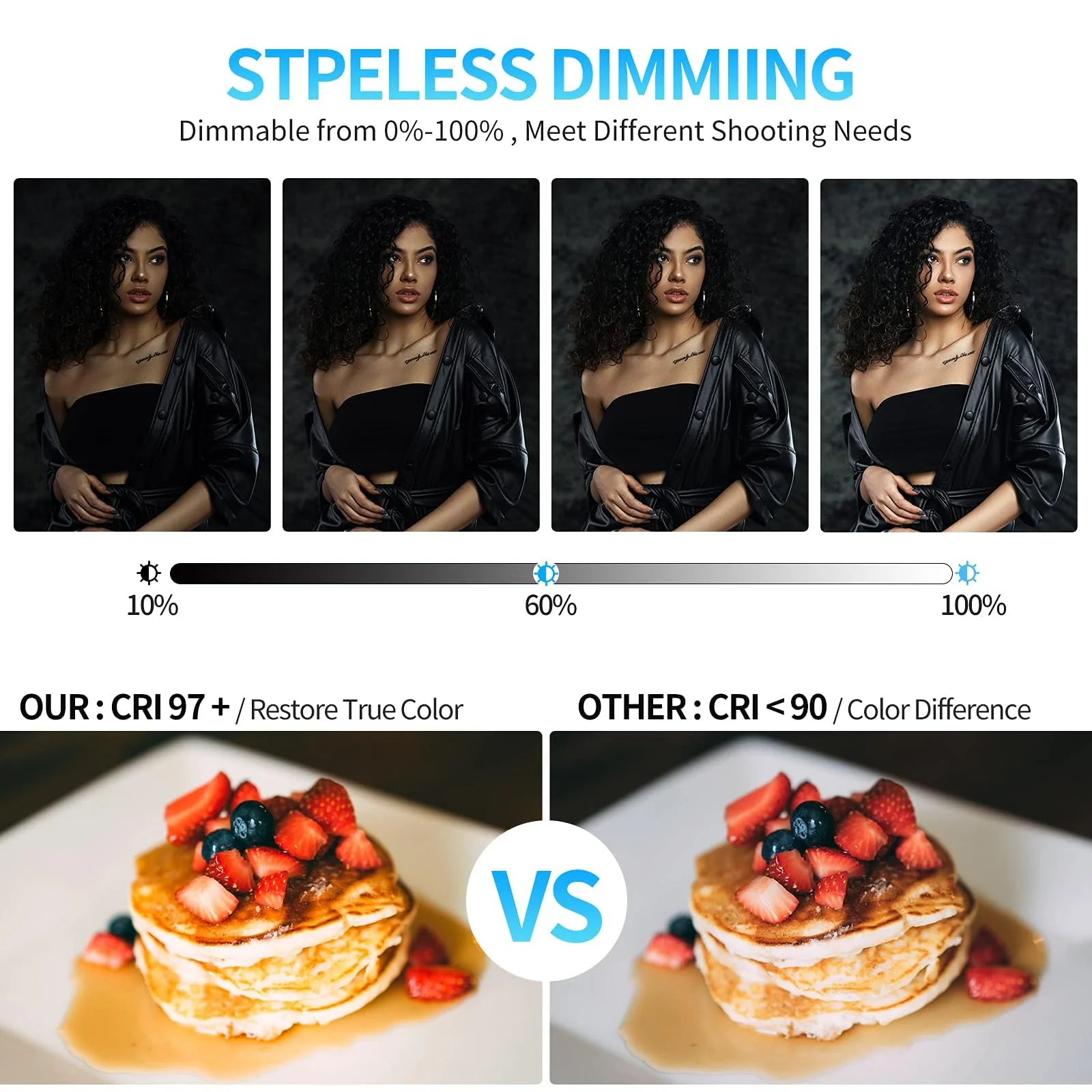 - Professional two color LED light: the studio light uses professional and demanding LED beads, CRI 97+ and TLCI 97+, to show the real and natural color for YouTube Studio Photography Video Shooting.