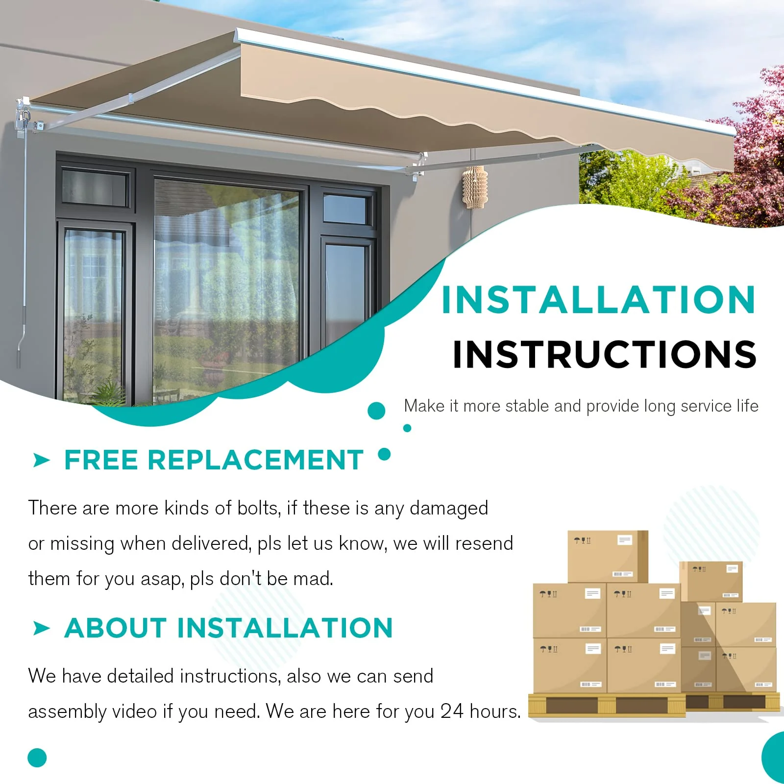 - INSTALLATION AND CUSTOMER SERVICE -The patio retractable canopy can be installed on a concrete, solid brick wall and even on a wooden wall. Assembly needed, manual and hardware included, pls let us know if you have any problem.