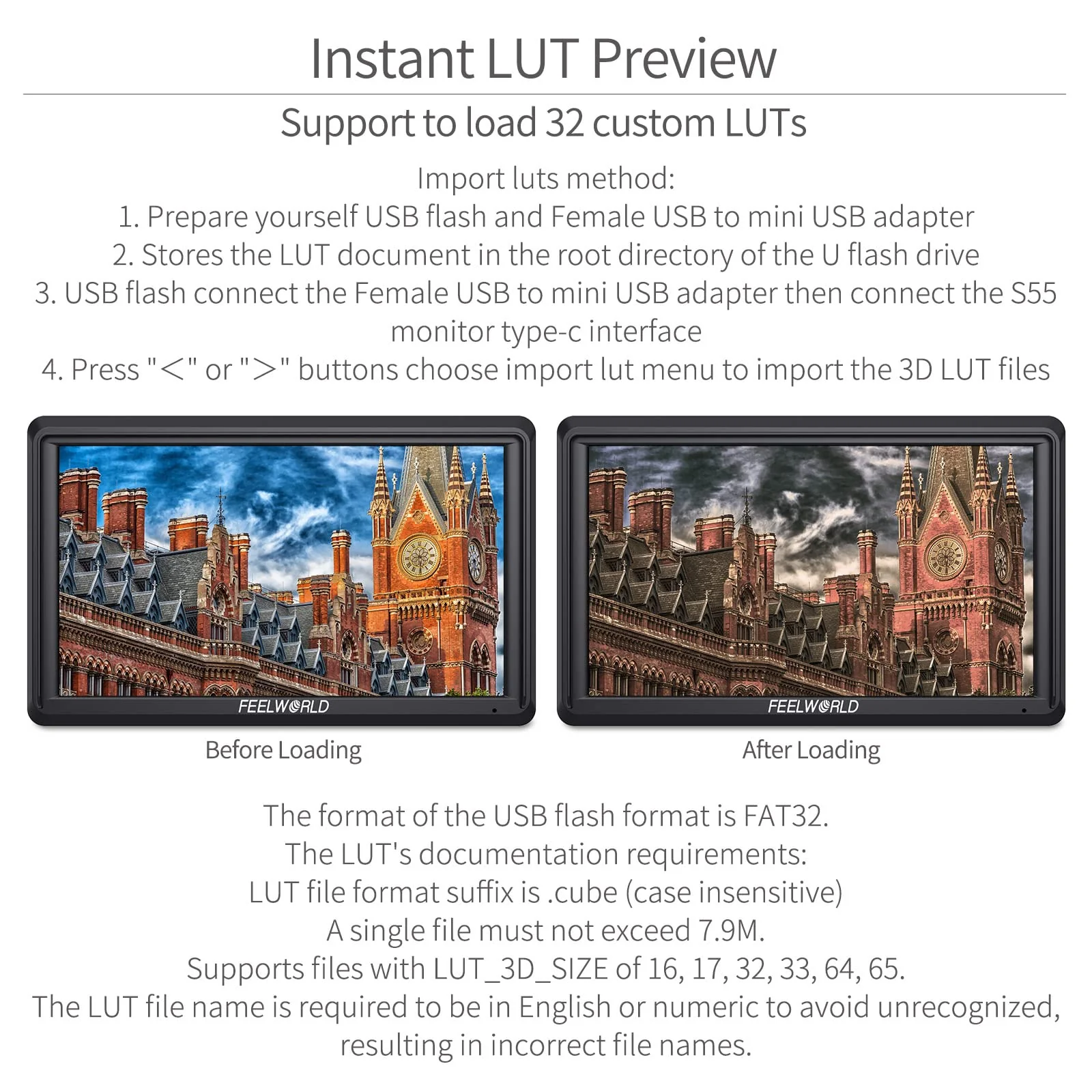 - 【Amazing Shooting Experience】5.5" LCD display with 1920x1152 resolution shows bright, clear images - making it an ideal monitor for the gimbals and lightweight camera systems especially those without a built-in display.【4K HDMI Input/ Output Without Delay】Support 4K format: 4K UHD 3840X2160p (30/29.97/25/24/23.98Hz), 4096X2160p (24Hz). S55 Features HDMI I/O connections to HDMI cameras and can output to larger on set monitors for instant review.