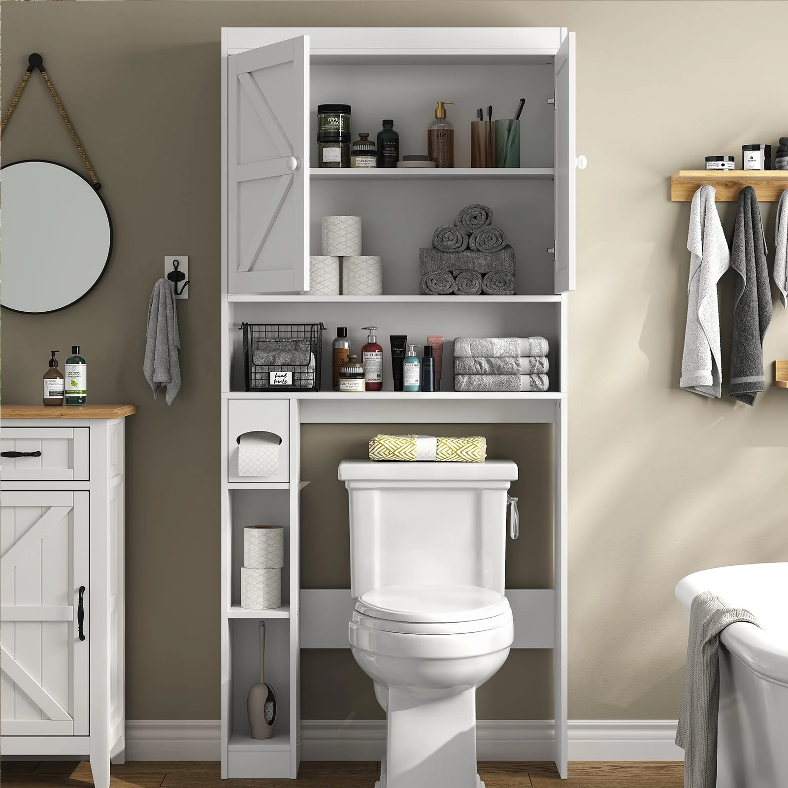 - 【Sleek Lines, Modern Style】With a sleek design of farmhouse contemporary lines, this over-the-toilet storage shelf has a fine neutral finish bringing a touch of understated style and utility to your bathroom. All the features make such a small shelving to get your bathroom to life.