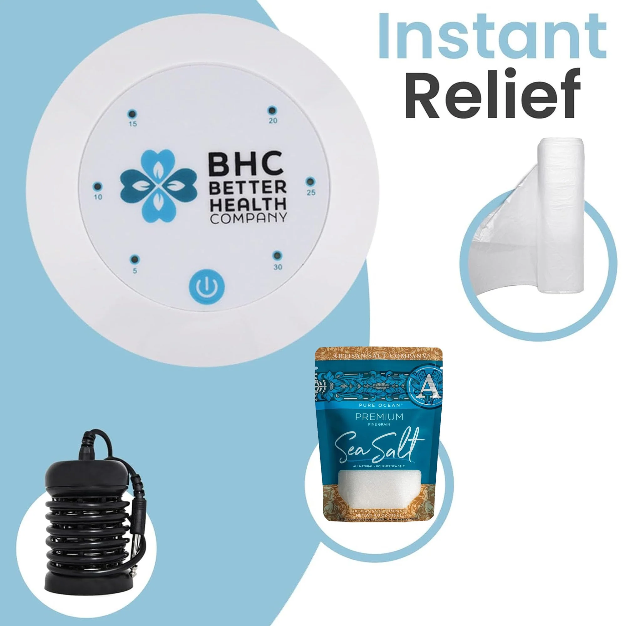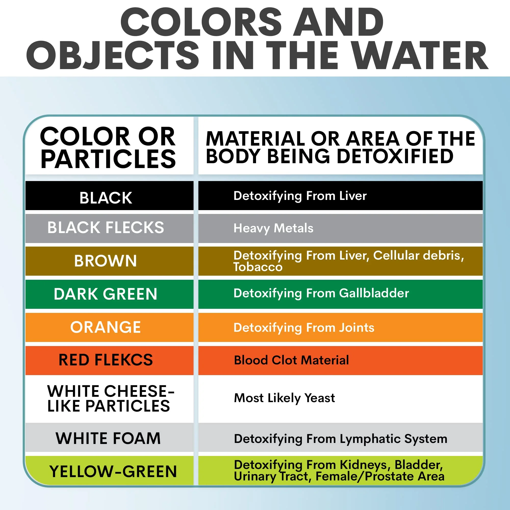- WHAT’S IN THE BOX - This ionic detox foot bath machine comes with everything you need to enjoy a relaxing and cleansing foot bath at home. You will get a controller unit, a 1/4 lb. bag of Detox Sea Salt, two reusable arrays, a white 12QT basin, an instruction manual, an ionic detox foot bath brochure, and a 16-page informational booklet.