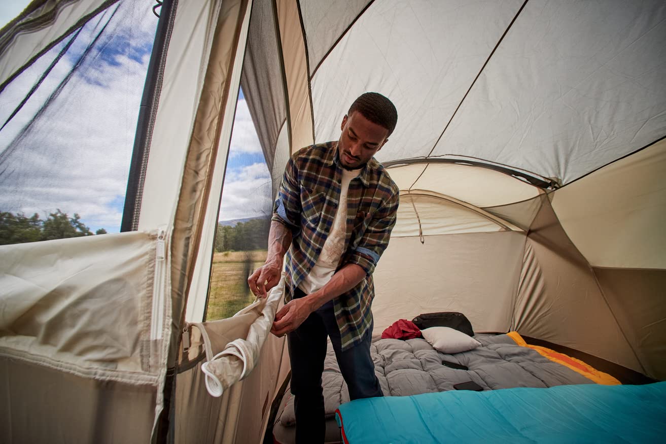 - Cabin-like 10-person tent has enough room for 3 queen size air beds