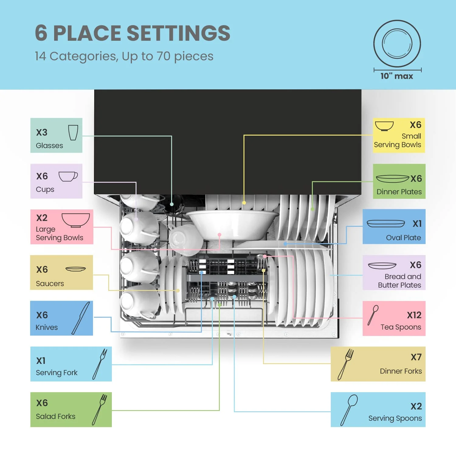 - 【6 Place Setting】- A perfect size(H438×W550×D500mm) for 2-3 people, COMFEE’ compact dishwasher is suitable for dorms, RVs and apartments. This countertop dishwasher can fit up to 70 pieces of tableware, and a plate size of up to 10 inches diameter. Note: COMFEE dishwashers are tested at the factory before they are shipped. If your new dishwasher has some water inside, this is normal.