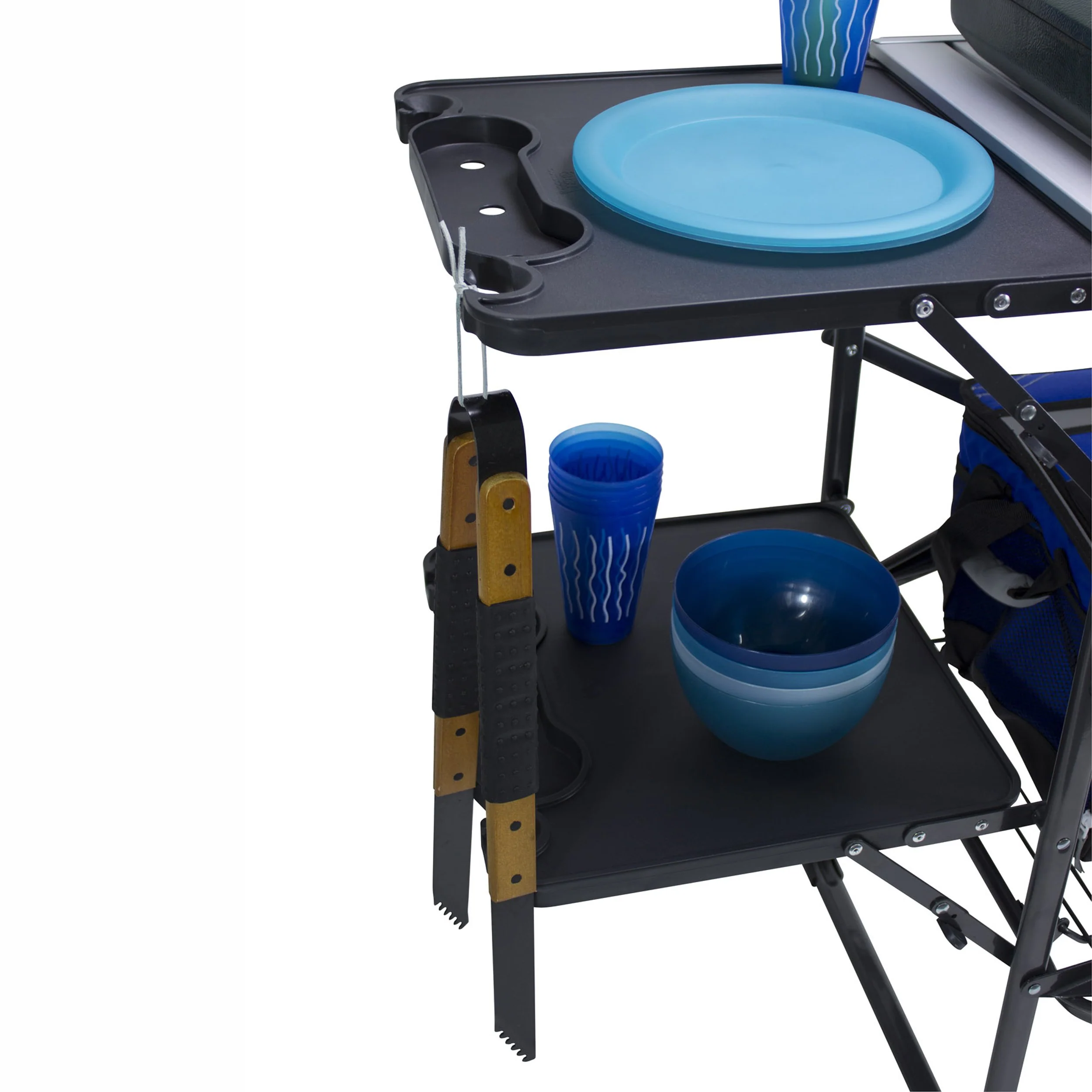 - Folding Camp Table: Brings the kitchen outside with enough counter and storage space to accommodate camp kitchen equipment like stoves and grills, cooking utensils, and cookware