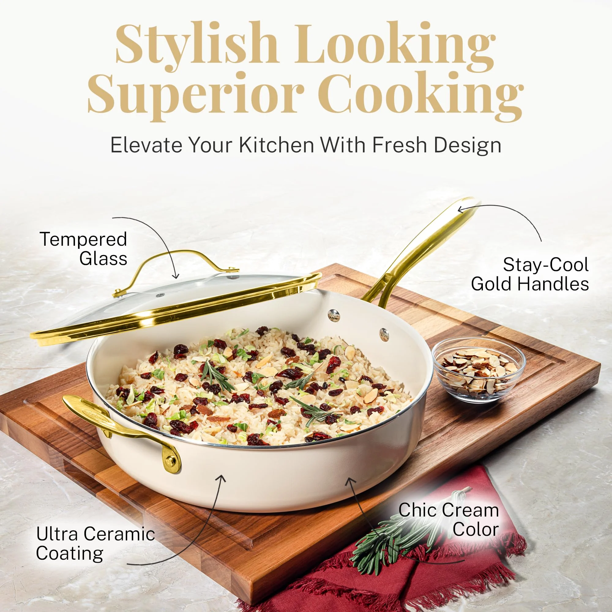 • GOTHAM STEEL NATURAL COLLECTION: Healthier cooking is easy with this nonstick ceramic cookware set. Pots and pans are designed to be 2x more durable, dishwasher safe, and oven safe up to 500˚F. Gold stay-cool handles allow you to go from stovetop to oven. But this set doesn’t just cook good, they look good too, with a modern cream color that adds an elevated aesthetic to your kitchen.