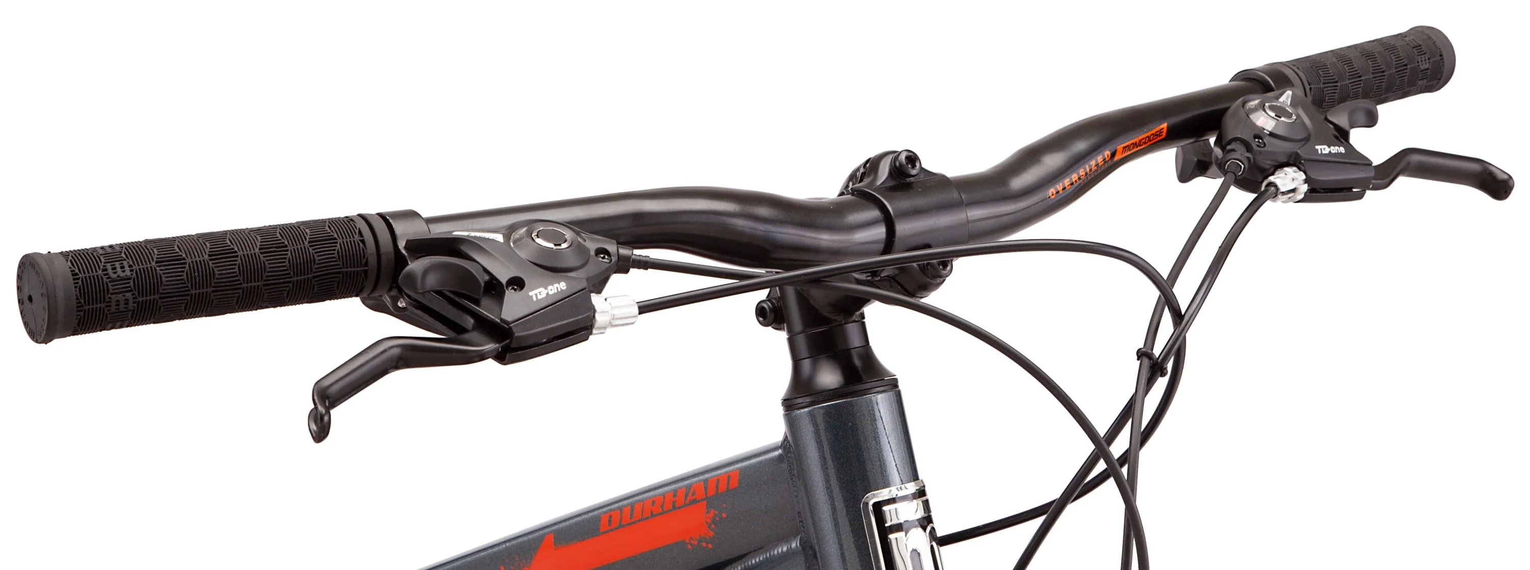 The Durham mountain bike by Mongoose was built for rad off-road excursions. The Durham features a lightweight aluminum frame and Element suspension fork for a ride that's ready to tear down the trails. The 21-speed trigger shifters provide effortless gear changes, while front and rear mechanical disc brakes deliver superior stopping power in all conditions. Alloy double wall rims add lightweight strength and 2.3-inch wide mountain tires provide stability and grip. Plus, the tool-free adjustable seat post makes it easy to fine-tune the fit. Get out there and explore with the Mongoose Durham mountain bike.