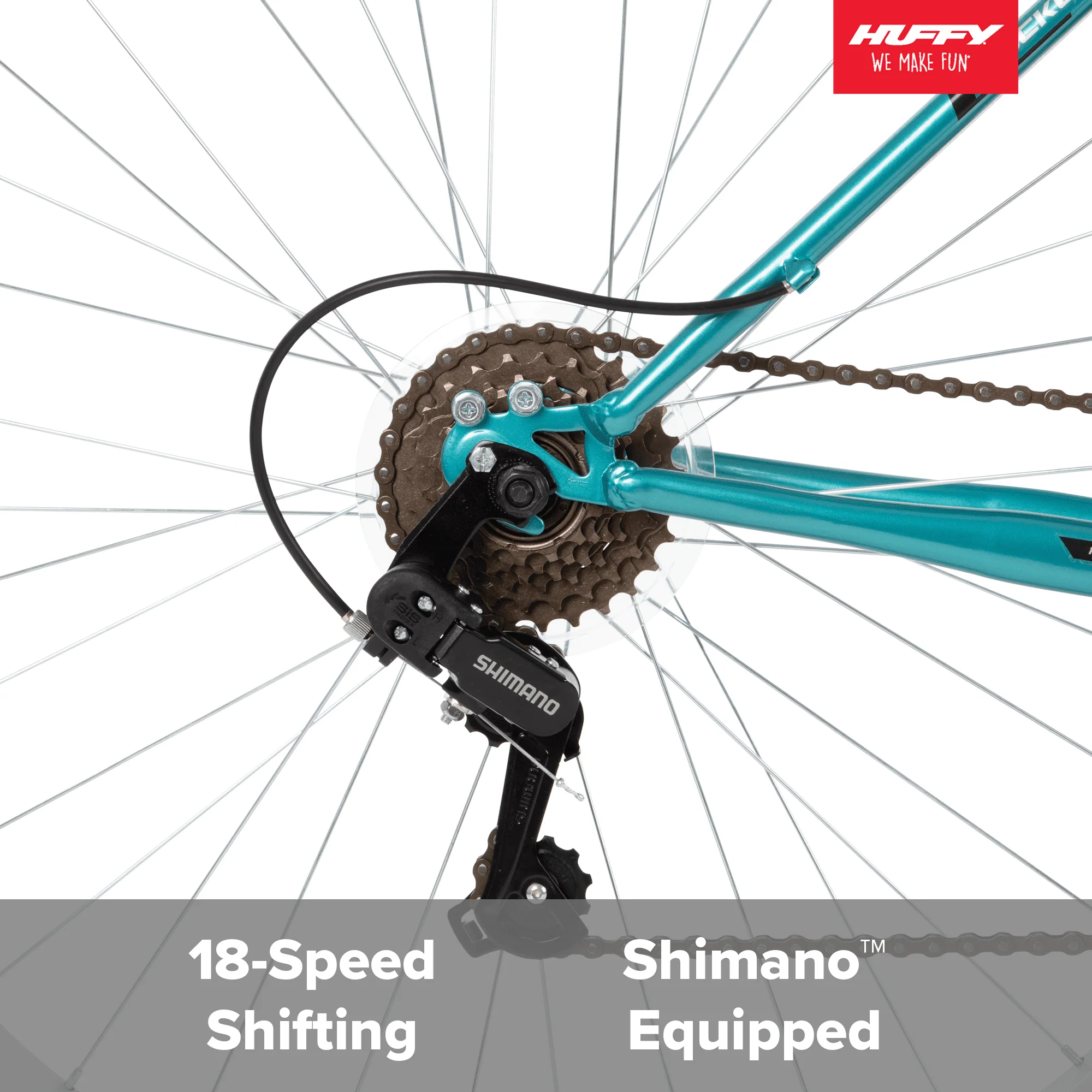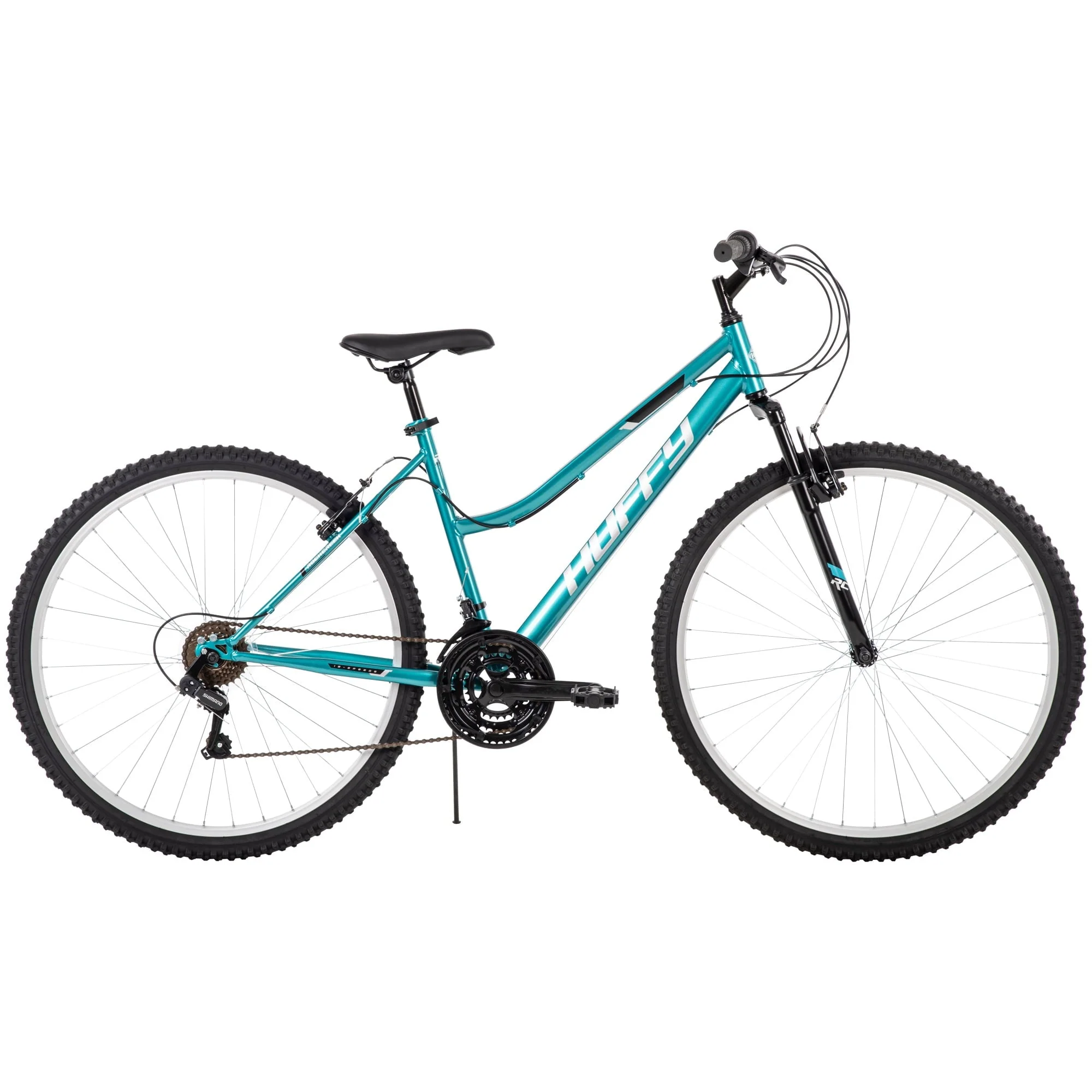 The Huffy rock creek 29-inch ladies mountain bike in spearmint green combines a durable steel mountain frame with a suspension fork to deliver a great ride, great style, and the right specs for your every ride. A smooth 18-speed index shifting system with a Shimano rear indexed derailleur easily transitions between gears for quick adjustments venturing uphill or accelerating on level ground. Plus, the steel suspension fork responds as you ride for better control over whatever bumps the terrain may bring on this bike for women. The linear-pull brakes allow for quick and smooth braking or steady speed control as you ride.
