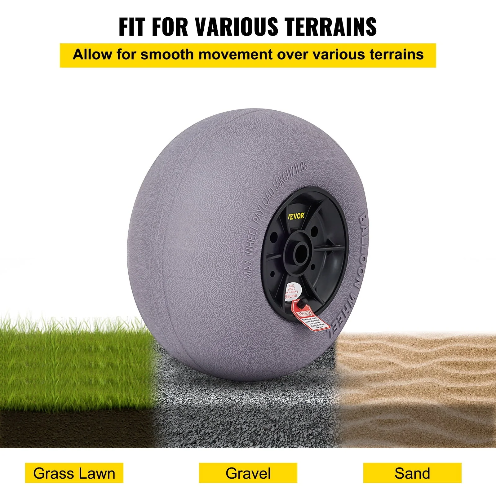 Our balloon tires are ideal for transporting loads over rough and uneven ground such as sand, grass lawn, and gravel. Its smooth and light tread pattern makes it more resistant to punctures, designed specifically to roll easily over sand with minimal effort.