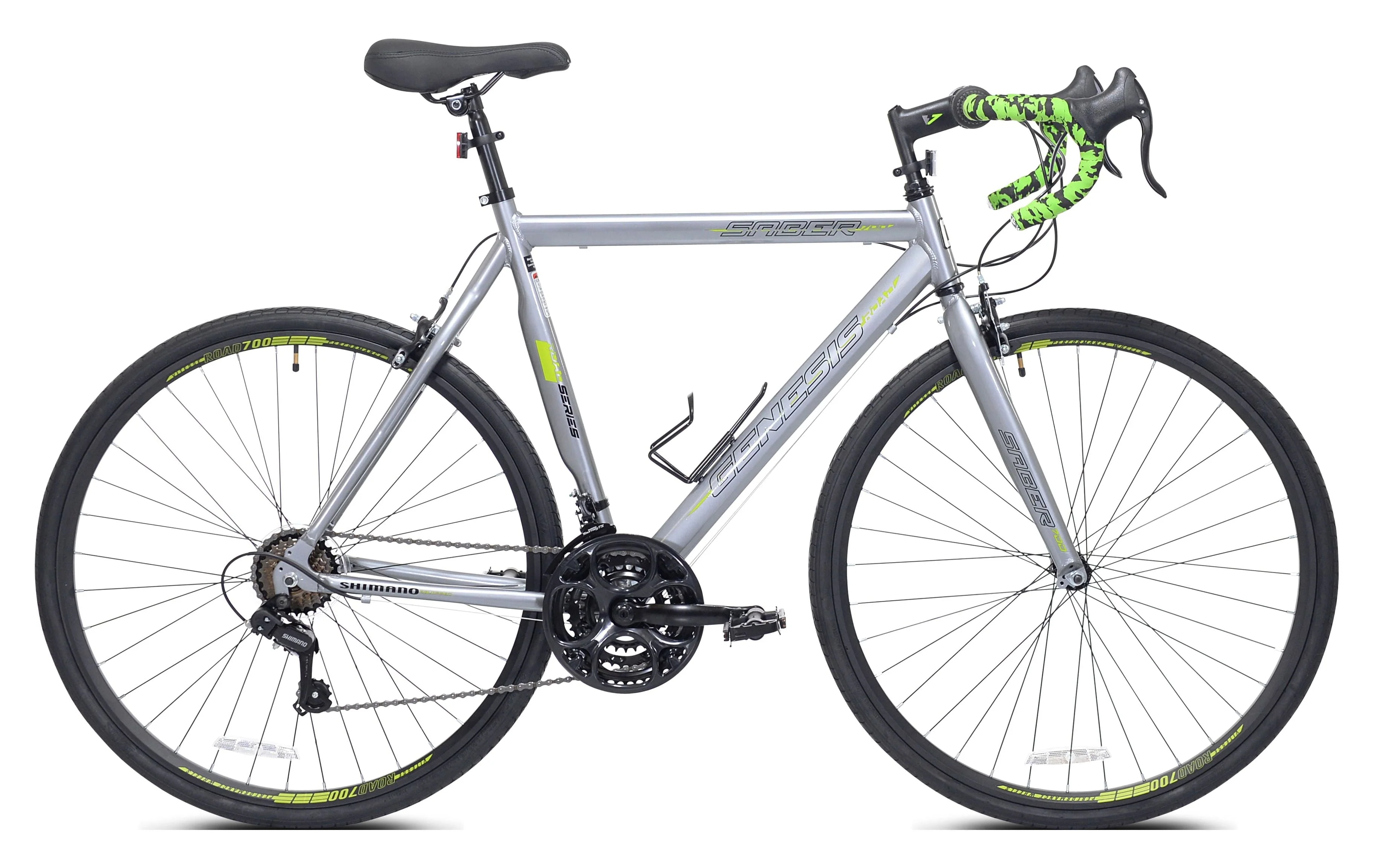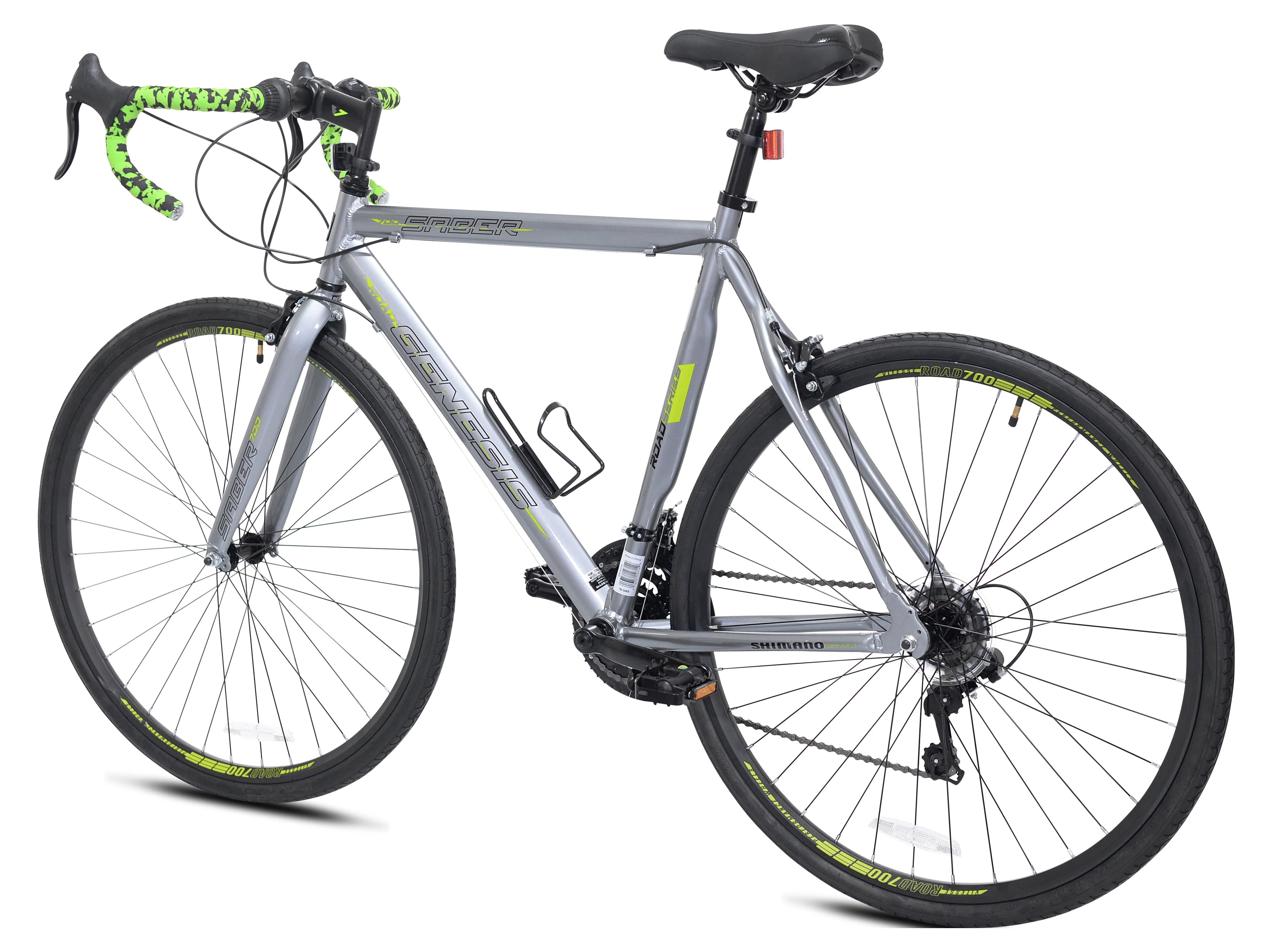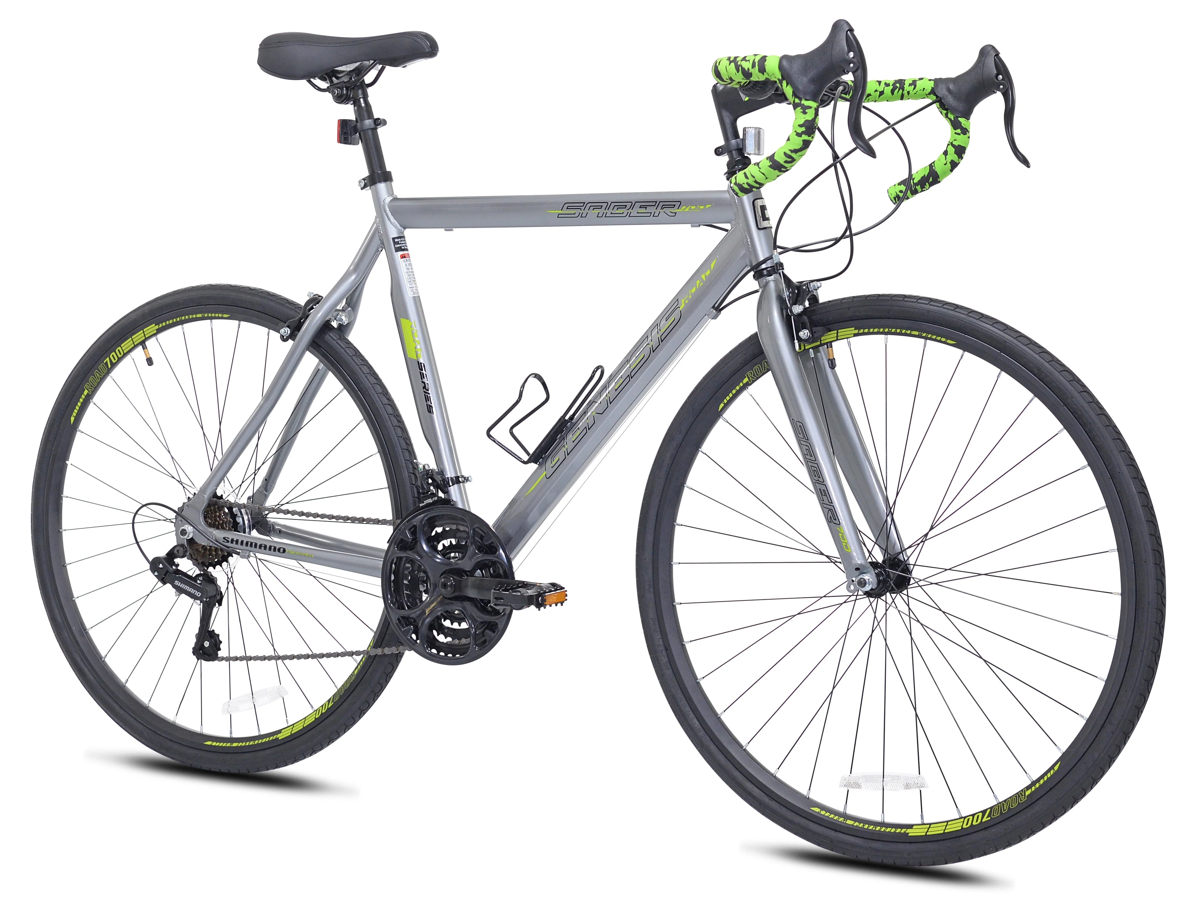 Show up with your game face on and the 700c Genesis Saber will do the rest. Equipped with a lightweight aluminum frame sporting road-specific geometry, this speed demon is the perfect entry-level road bike for daily riding. A versatile 21-speed drivetrain powers you to the next level and the front and rear alloy caliper brakes give you enough power to stop on a dime. 700 x 32c road tires keep you gliding smoothly on the road and a lightweight alloy wheelset make this bike fast, sleek, and capable - perfect for beginners and seasoned riders. Easy-to-use twist grip shifters make changing gears quick and efficient, whether you are on mile 3 or mile 30. The saddle and stem are easily adjustable, allowing you to quickly tailor your riding experience specifically to your tastes. Explore the open road on the 700c Genesis Saber. Perfect bike for any adult male.