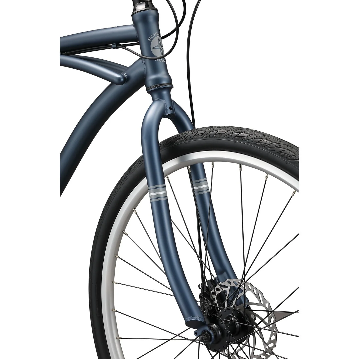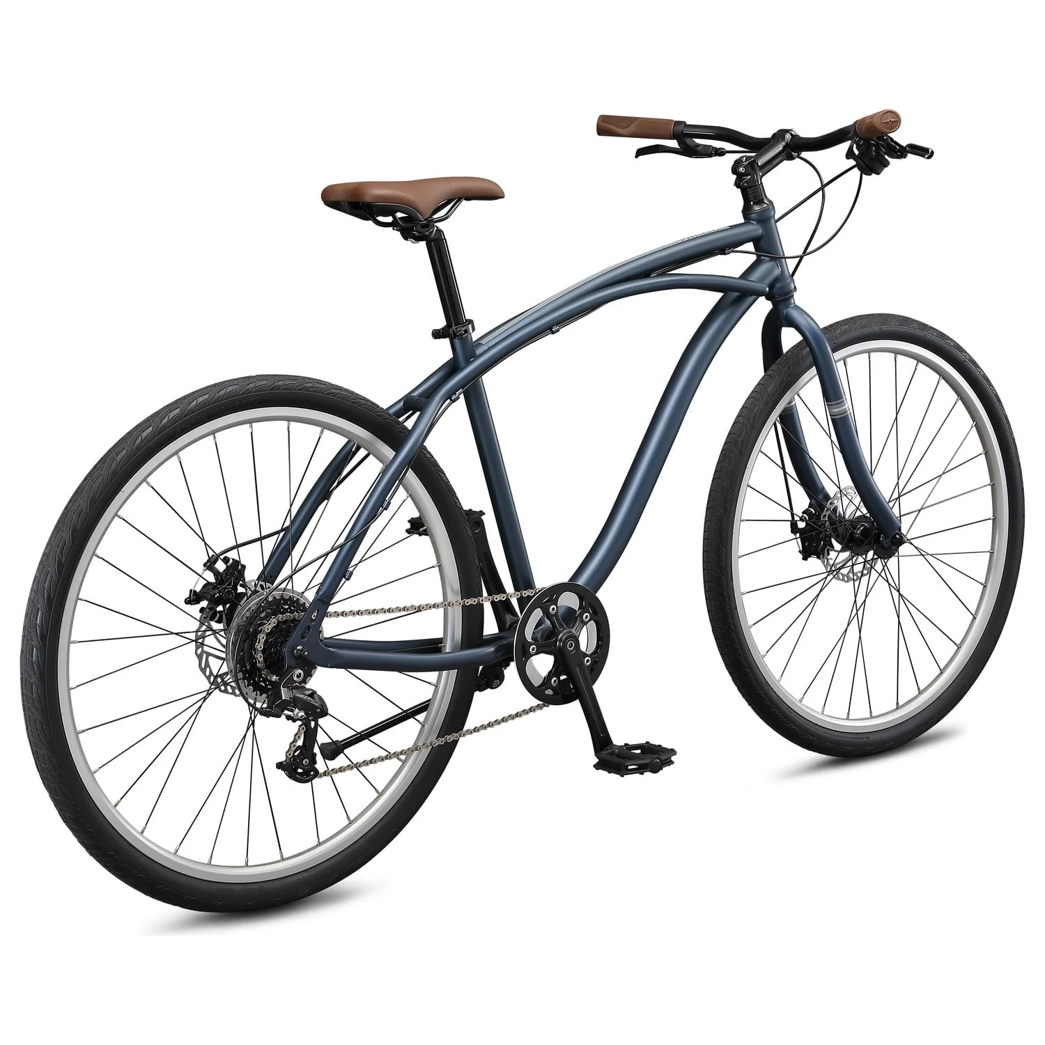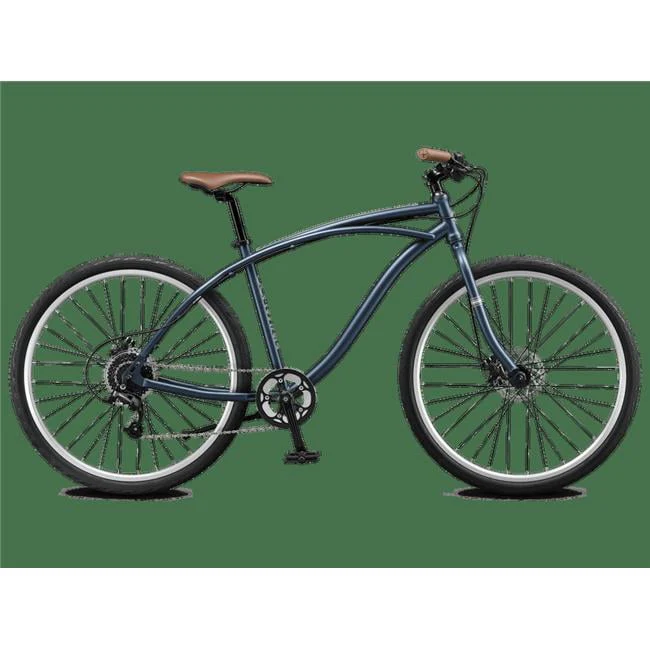 When old school cantilever cruiser styling meets versatile hybrid riding at the intersection of durability, you get the unique 700c Schwinn World bike. It gets its vintage look from that cantilever steel cruiser frame and fork, while classic swept back handlebars will keep you upright for a ride that's smooth and easy on your back. But don't be fooled: even with the retro Schwinn look, the World is a durable urban hybrid for all your riding needs. Reliable mechanical disc brakes mean crisp all-condition stopping and the Schwinn sport seat softens the ride. Thanks to the simple 1x8 drivetrain, this is now your pub crawl bike, commuter companion, weekend warrior and family ride facilitator all wrapped into one. And those high volume urban tires provide ideal traction for a ride that's speedy, smooth, and downright memorable. Like all Schwinn bikes, the World comes with a limited lifetime warranty for as long as you own the bike. Enjoy the freedom of riding a Schwinn!