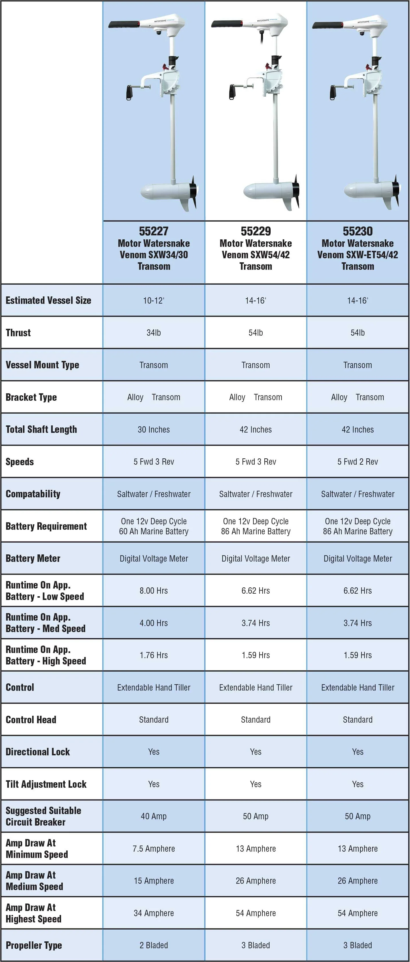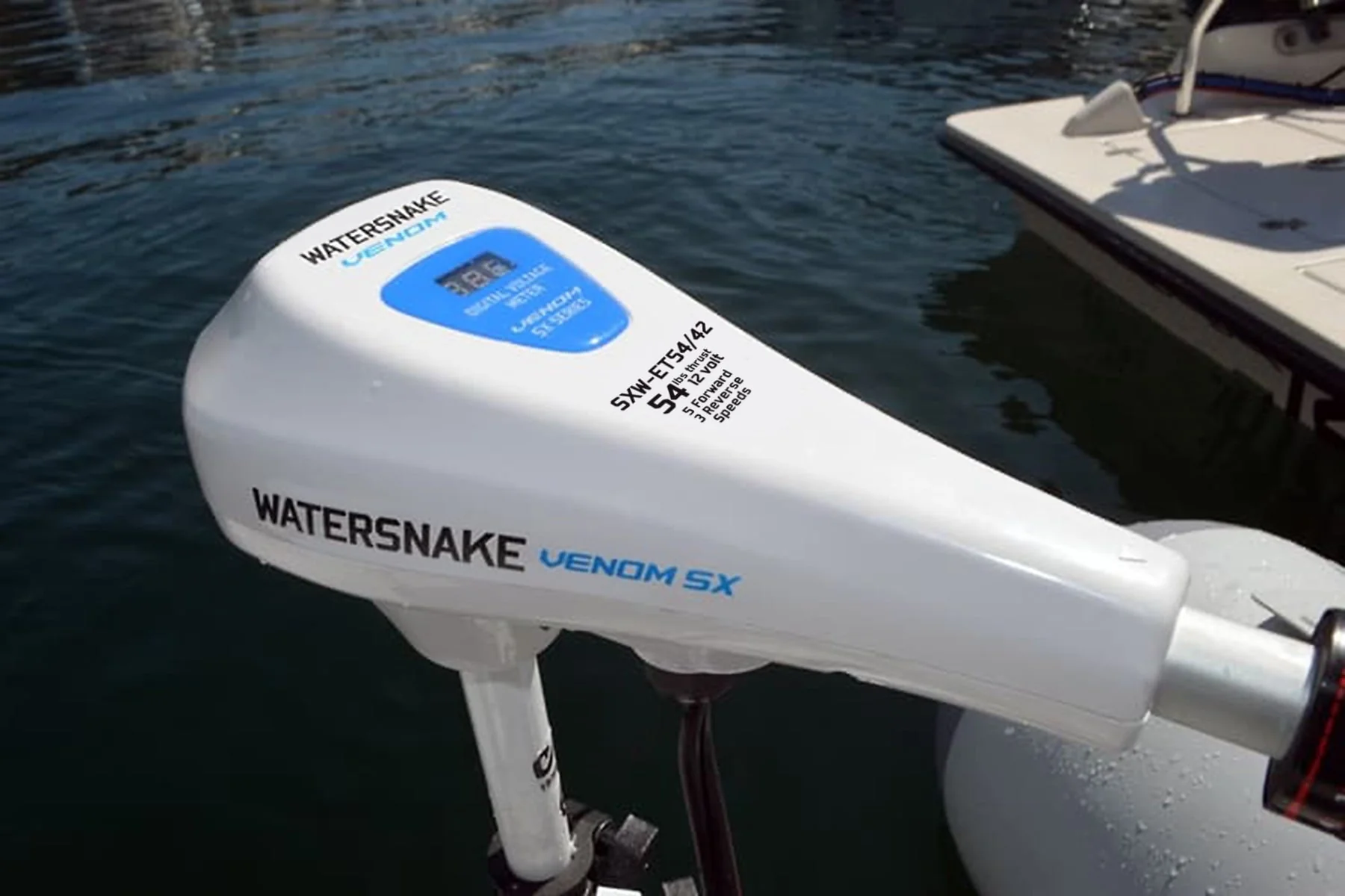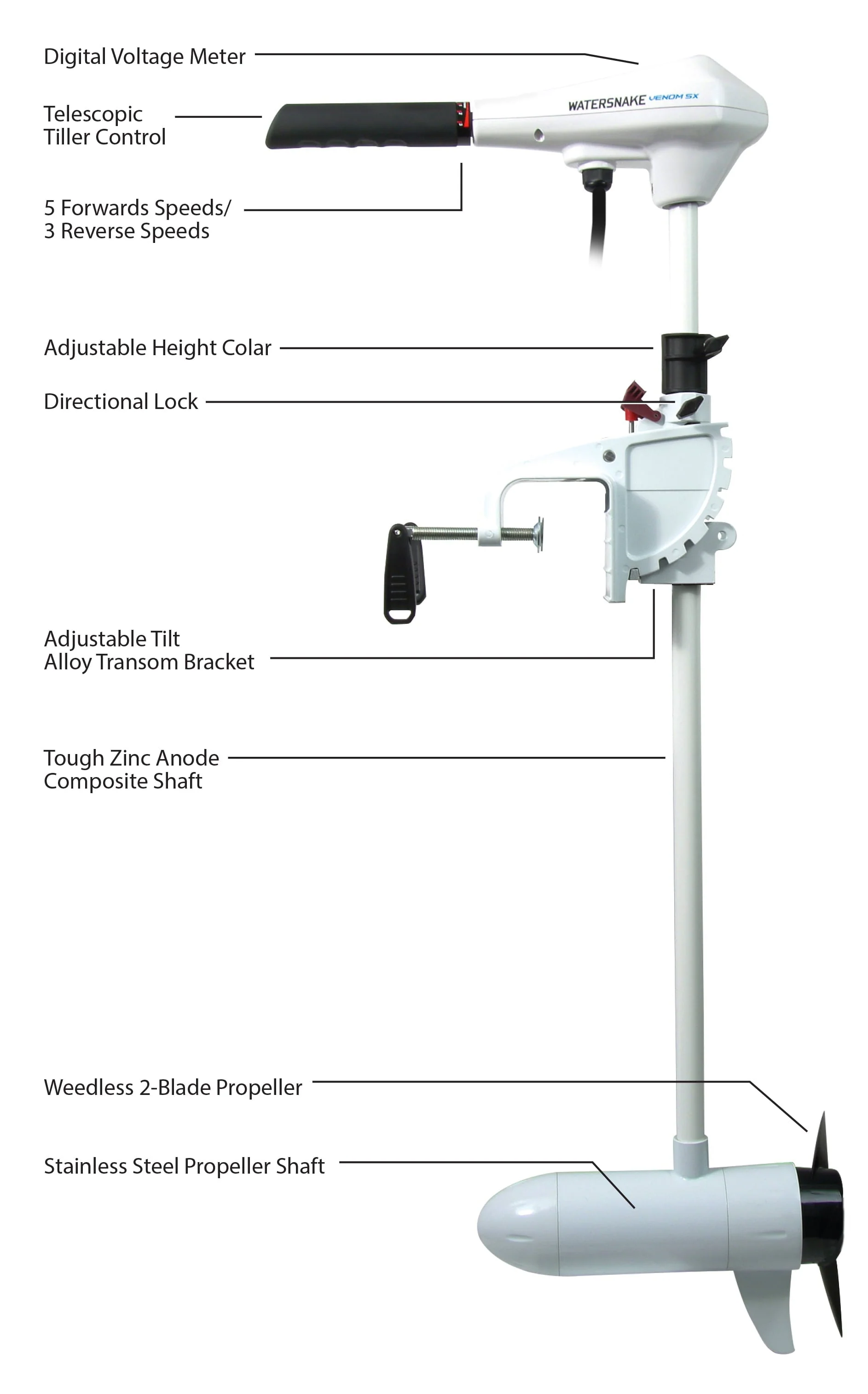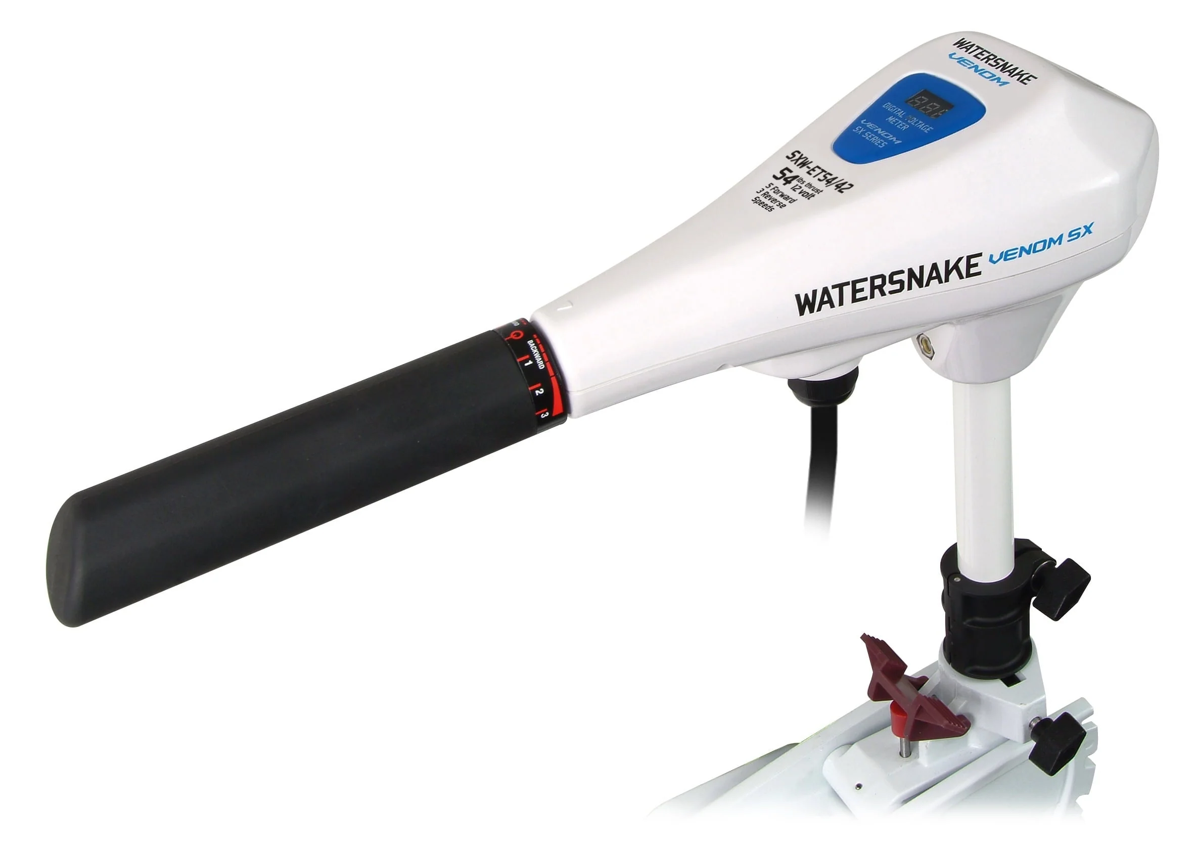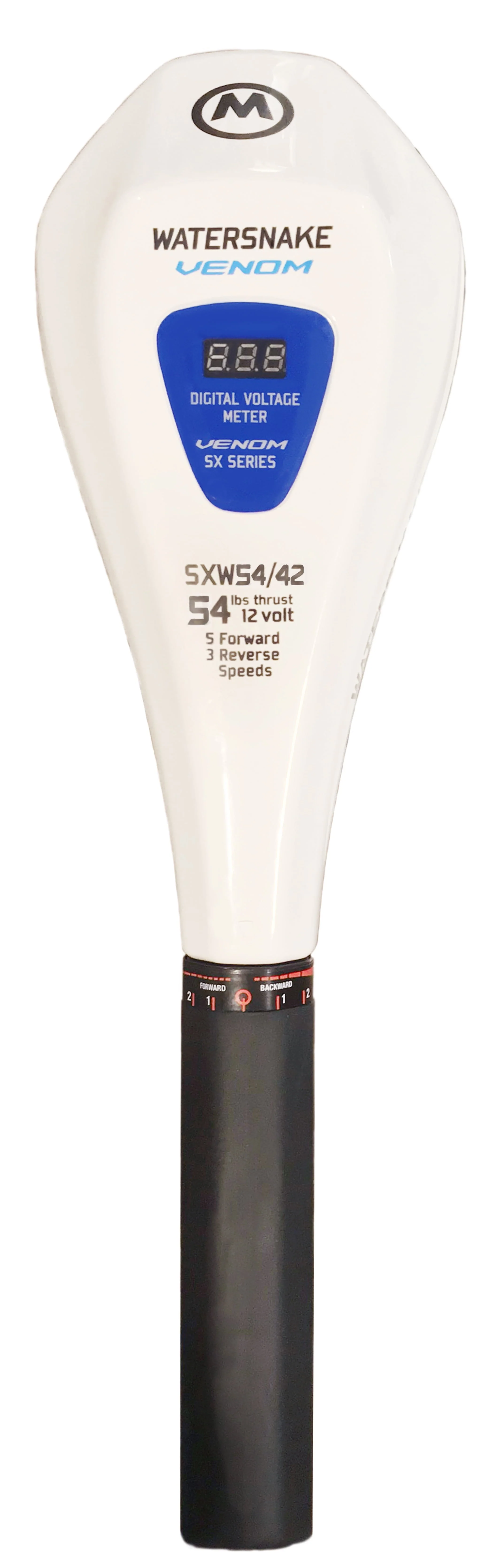 Watersnake Venom 54/42 Transom Mount Trolling Motor is ideal for the serious angler and is suitable for boats ranging from small dinghies to sport-fishing boats. This 54lb. thrust electric trolling motor is equipped with a 42-inch composite shaft and weedless two-blade propeller designed to allow your boat to move easily through the water and weeds. This transom mount trolling motor has a telescopic tiller handle and five forward speeds and three reverse speeds. 54lb. thrust electric trolling motor, battery not included.