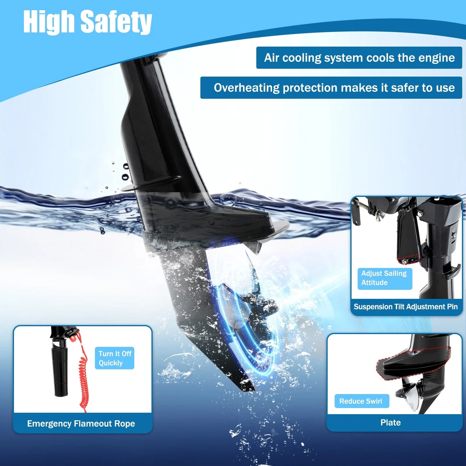 This outboard motor is made of quality aluminum material, which is a good choice for you to enjoy your cruise. The great engine performance can bring you a comfortable sailing experience, as well as convenient ignition and flame failure devices to protect your safety. All you need to do is install it in the stern of your boat, and you can enjoy a fast and easy-to-operate water journey! This outboard engine is suitable for inflatable boats, iron boats, plastic boats, fiberglass boats, wooden boats, etc. with a stern plate height of 17.32 inches or less. It is widely used in fields such as fisheries, aquaculture, and outdoor exploration.