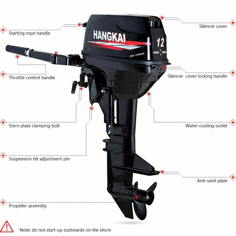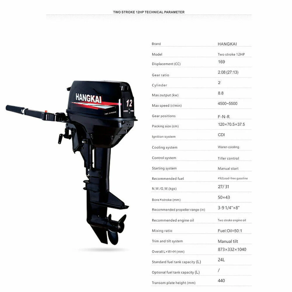 <p>Specifications:</p><p>Brand: HANGKAI</p><p>Displacement: 169CC</p><p>Gear ratio: 2.08(27:13)</p><p>Cylinder: 2</p><p>Max.Output(kw): 8.8</p><p>Max.speed(r/min): 4500-5500</p><p>Gear Positions: F-N-R</p><p>Packing size: 120x70.5x37.5cm</p><p>Ignition System: CDI</p><p>Cooling System: Water-cooling</p><p>Control System: Tiller control</p><p>Starting System: Manual start</p><p>Control System: 93 gasoline</p><p>N.W./G.W.(kgs): 27/31</p><p>Bore x Stroke(mm): 50x43</p><p>Recommended Propeller range: 3 -9"1/4''x8"</p><p>Recommended Lubricant: 2 Stroke Lubricating oil</p><p>Mixing ratio: Fuel:oil=50:1</p><p>Trim and tilt system: Manual Tilt</p><p>Overall LxWxH(cm): 78.3x33.2x104</p><p>Standard fuel tank capacity: 24L</p><p><br></p><p>Please Must Read before using</p><p>Firstly, Fill the gear oil (open gear box lid and fill it)</p><p>Secondly, Fill NO. 92 petrol, lightly press oil pump 6-10 times</p><p>Thirdly, Fill engine oil don't exceed the head of the pattern</p><p>Forthly, turn the throttle to the start up and turn the accelerator gets up to 50percent</p><p>Then, Rapidly pull the starter line</p><p>After the motor start, please turn the throttle to running state</p><p>Then, it can be operated now</p><p>Cylinder Scoring is a serious damage,which caused by improper use and will cost you a lot of money to repair the motor</p><p><br></p><p>Don't do the following will avoid cylinder Scoring</p><p>1. Start the motor in the water</p><p>2. Use the motor when it stop cyling water</p><p>Even if you want test the motor, it should be done in the river</p><p>When there is no water coming out from the motor,please stop using it immediately ,then check the impeller of Water pump or check if the water outlet has been blocked</p>