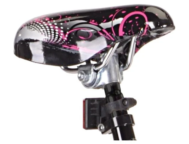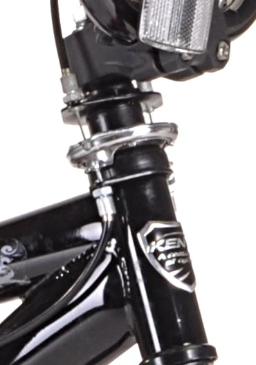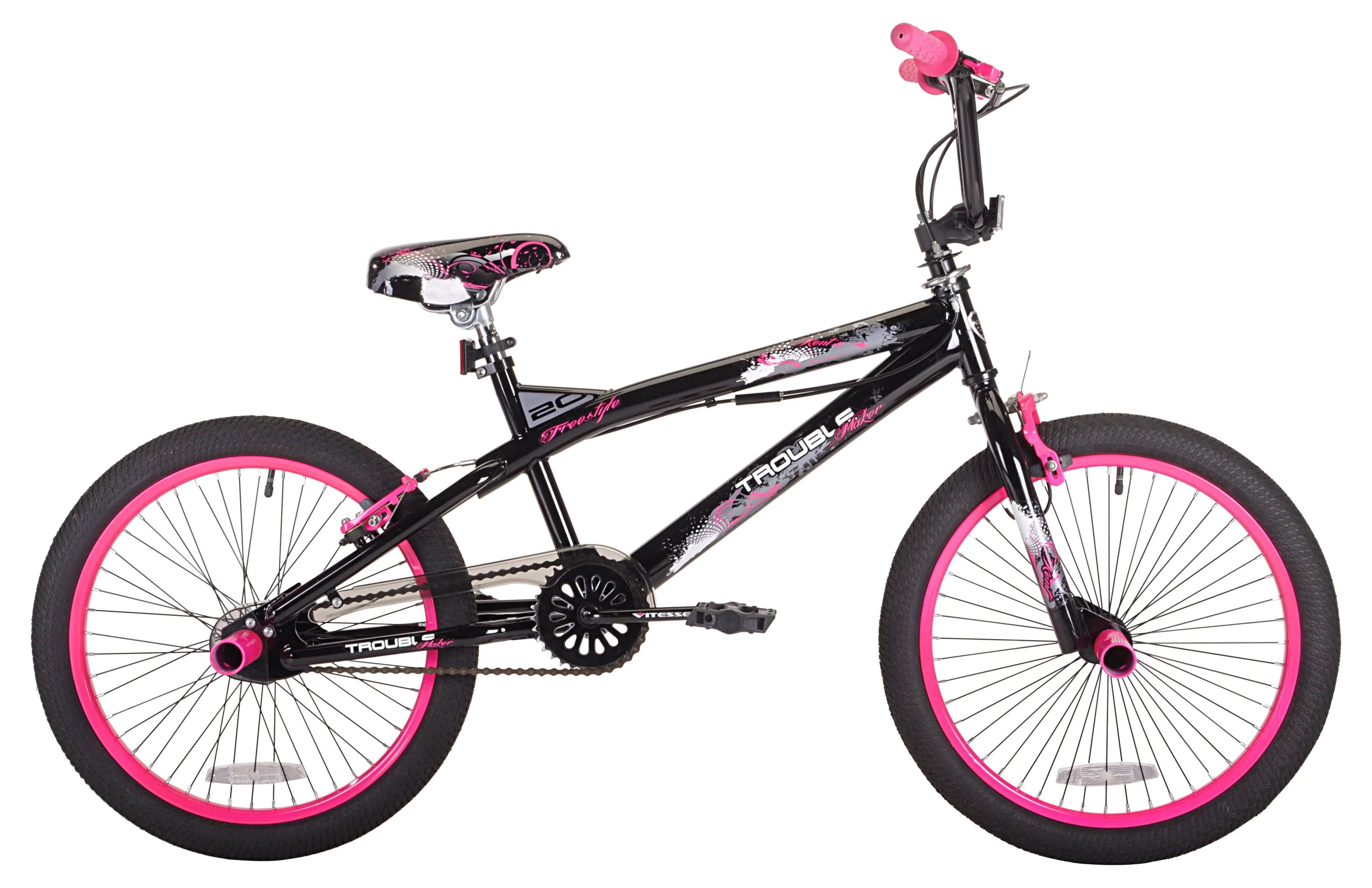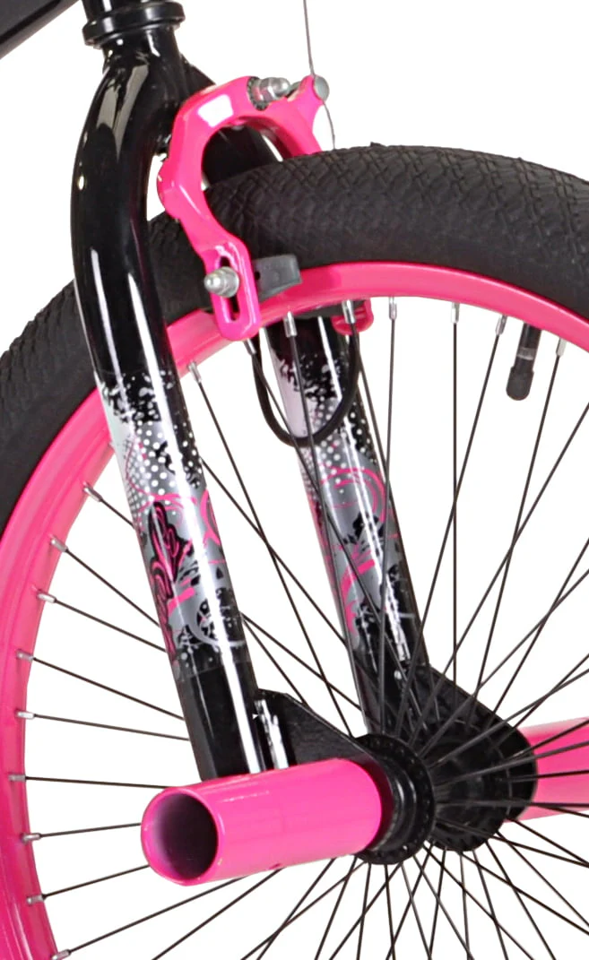 This black and pink girl's BMX bike features a durable steel frame that is sturdy enough to ride on city streets or dirt roads. Front and rear pegs plus front and rear alloy hand brakes will give your daughter improved control over her bike. This 20-inch girl's bike includes single-speed gearing and plastic pedals that will provide her with plenty of power to ride on flat surfaces and small hills. Steel BMX handlebars provide exceptional steering capability. The rims have 48 spokes and will fit 20-inch BMX tires for functionality and style. This BMX bike comes with a color-matched BMX seat that will provide a comfortable place to sit. The Kent trouble bike has a weight capacity of 100 lbs, making it suitable for preteens and young teenagers.