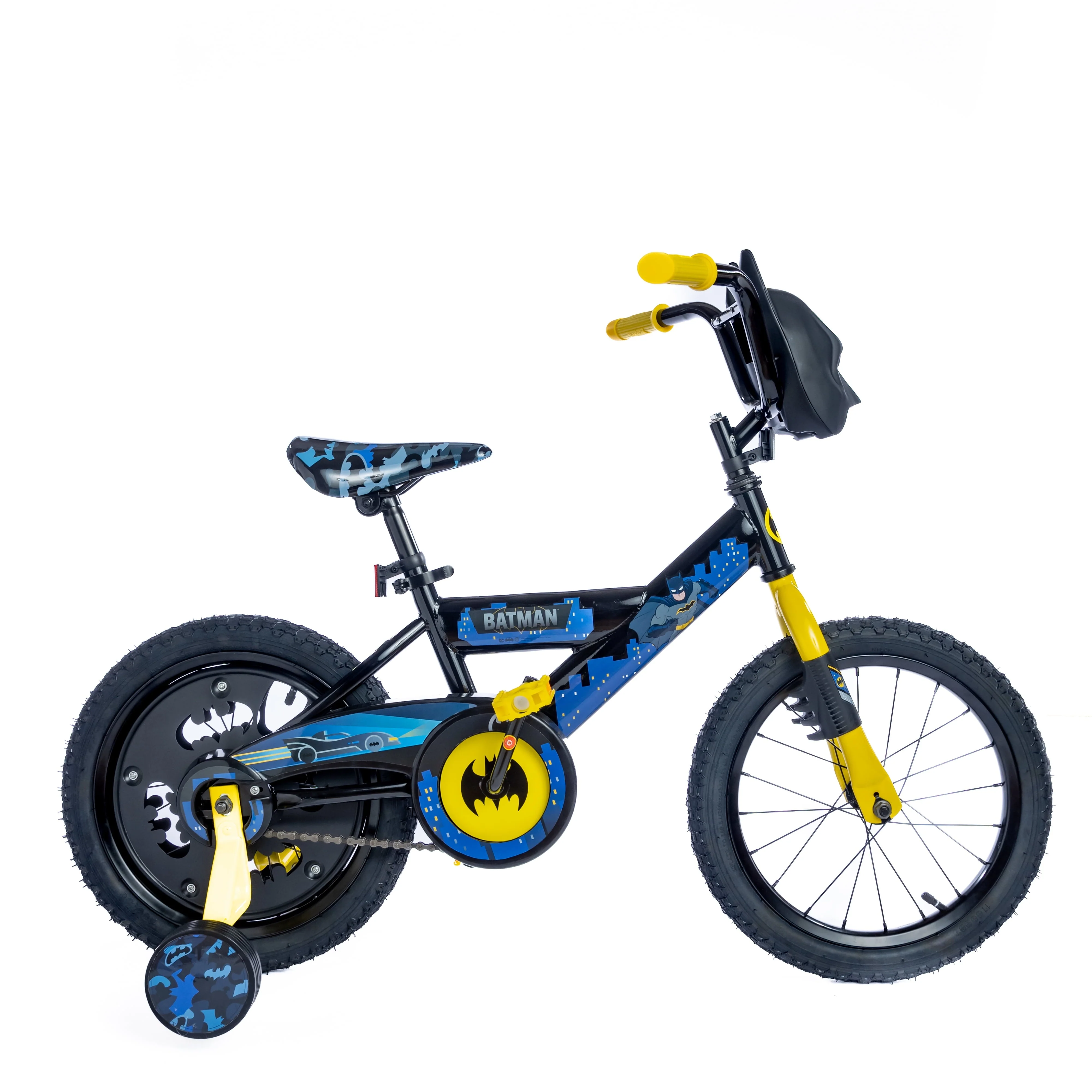 16 inch DC Comics Batman Bike featuring a unique steel frame and authentic Batman front face plate. This exciting bike for Boys Includes a front caliper brake and rear coaster break for plenty of braking power. Bring their imagination to life with the authentic DC Comics Batman graphics so many kids have grown to love. The unique details in the front mask with light up eyes, front fork Batman talons, embossed hand grips with "Caped Crusader", and unique Batman cutout rear wheel will make sure your little Batman Boy is the coolest in the neighborhood!
