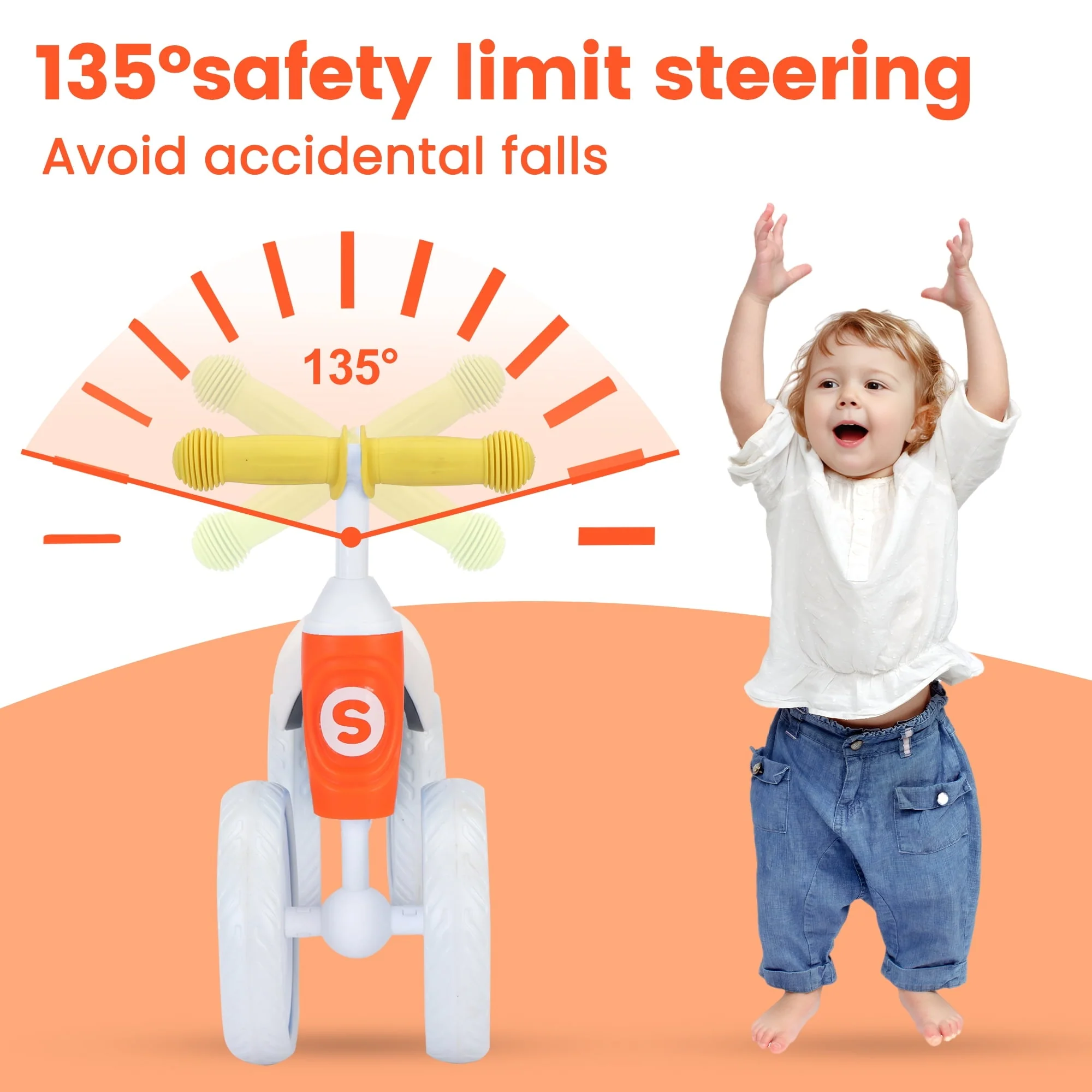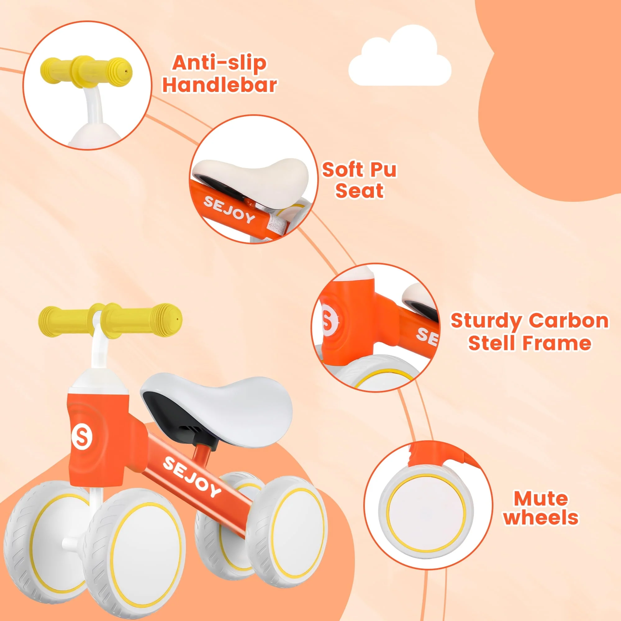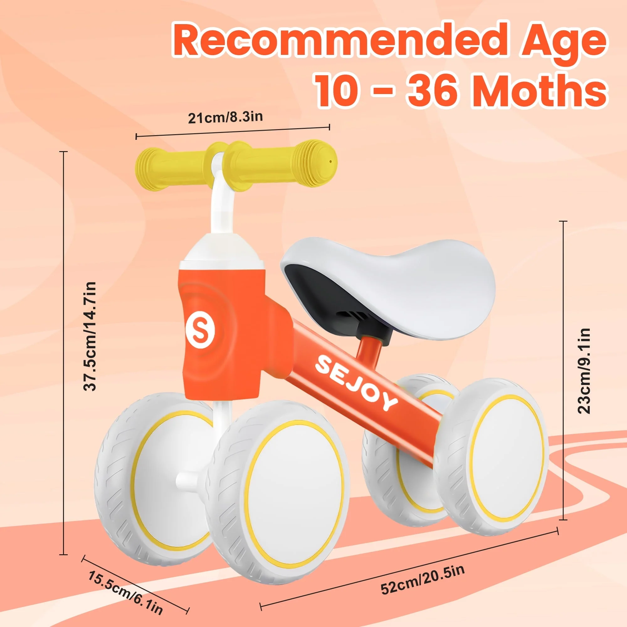SEJOY balance bike for 1-3 year boys girls.Crafted from carbon steel, non-slip rubber handle, lightweight to carry, wear-resistant EVA wheels with delicate workmanship, this baby bike offers strong support and comfortable riding experience for your baby. It's has a modular design, easy to assemble. The balance bike develop kids balance. Kids can learn how to ride, practice his(her) leg strength and gain confidence and happiness. Also can exercise the baby's self-confidence ability. SEJOY bikes have passed safety testing. All materials and design are safe for children.An ideal gift for nephews, grandsons or just for your own little baby boy and baby girl.Please choose with confidence.