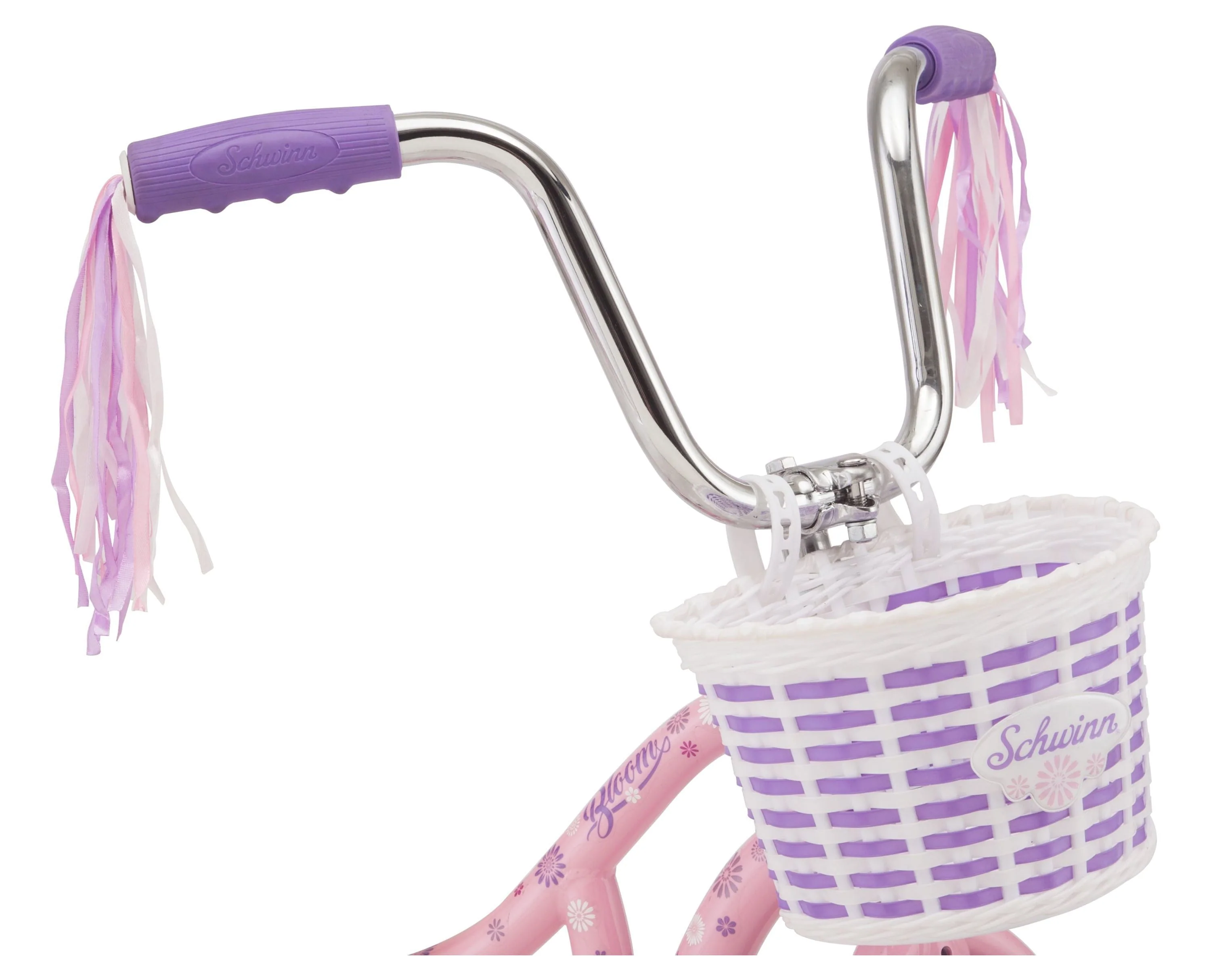 Teach your child to ride on a bike they'll love with the Schwinn Bloom. The Bloom features a steel frame with Schwinn SmartStart geometry. SmartStart bikes are designed with kids in mind, including a lighter frame, smaller grip handles, and a narrower pedal position to match your child's body geometry resulting in a more comfortable, stable ride. Removable training wheels are included to help your child learn to ride, while the tool-free adjustable seat post allows the bike to accommodate them as they grow. The Bloom also includes delightful features like flower decals, handlebar tassels, and a front basket.View more from us on our brand page.