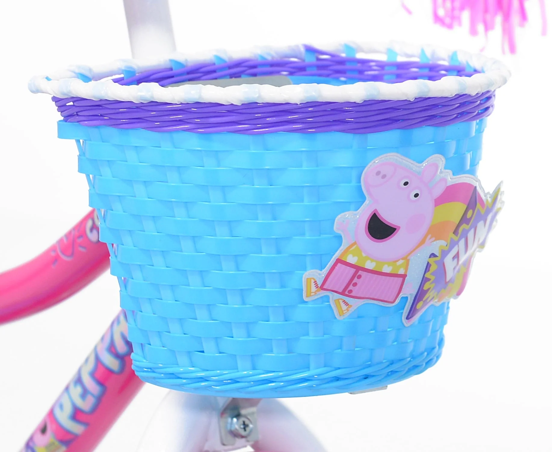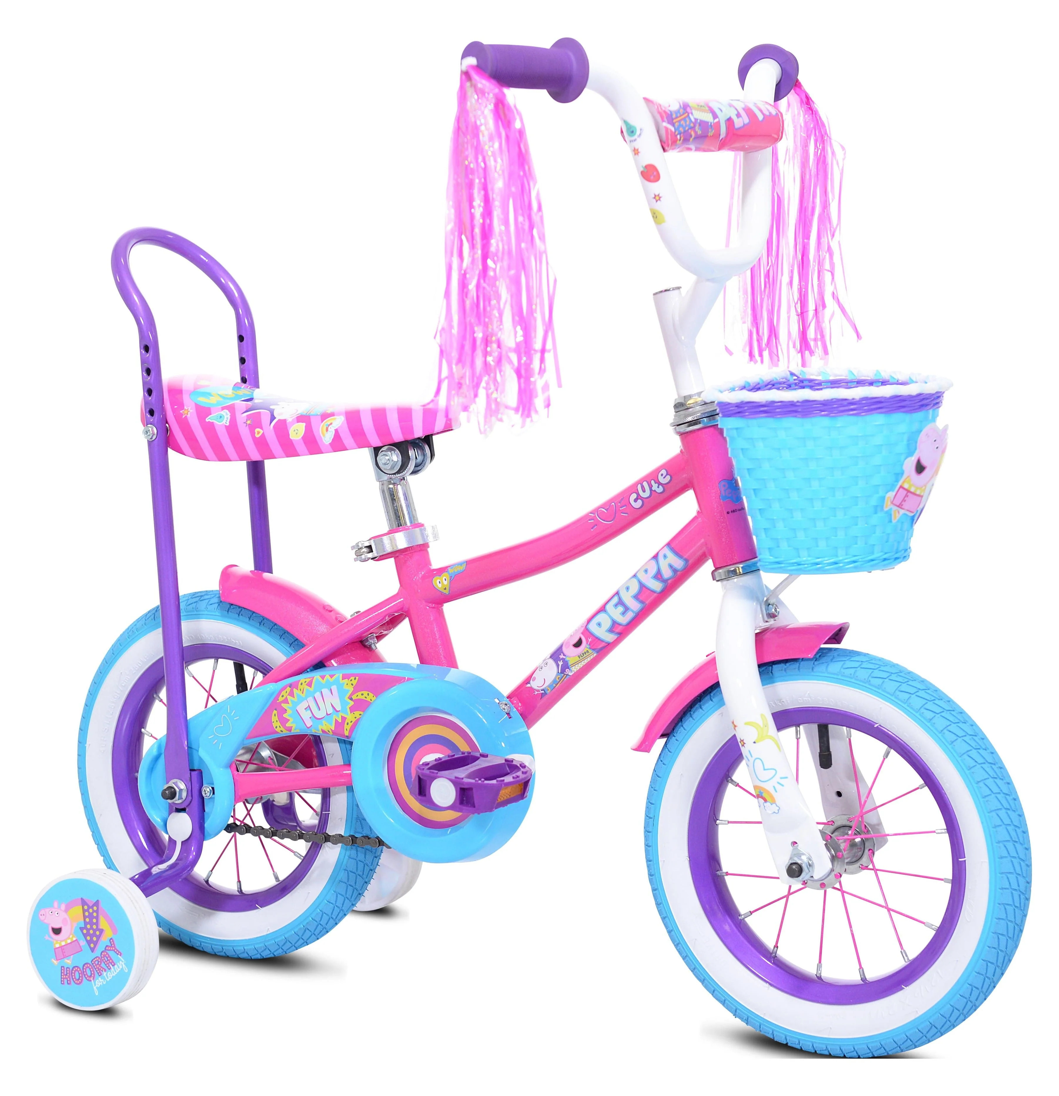 The 12'' Peppa pig high rise fun bike is here to let your child show off their Peppa pig fandom! This Peppa pig themed bike features attachable training wheels, a handlebar basket for some belongings to ride along with, and handlebar streamers. This bike has rear coaster brake with 12-inch tires for a smooth ride. Cool, retro high rise banana seat. Your little girl will be riding in style around the neighborhood. Perfect bike for your young female rider.